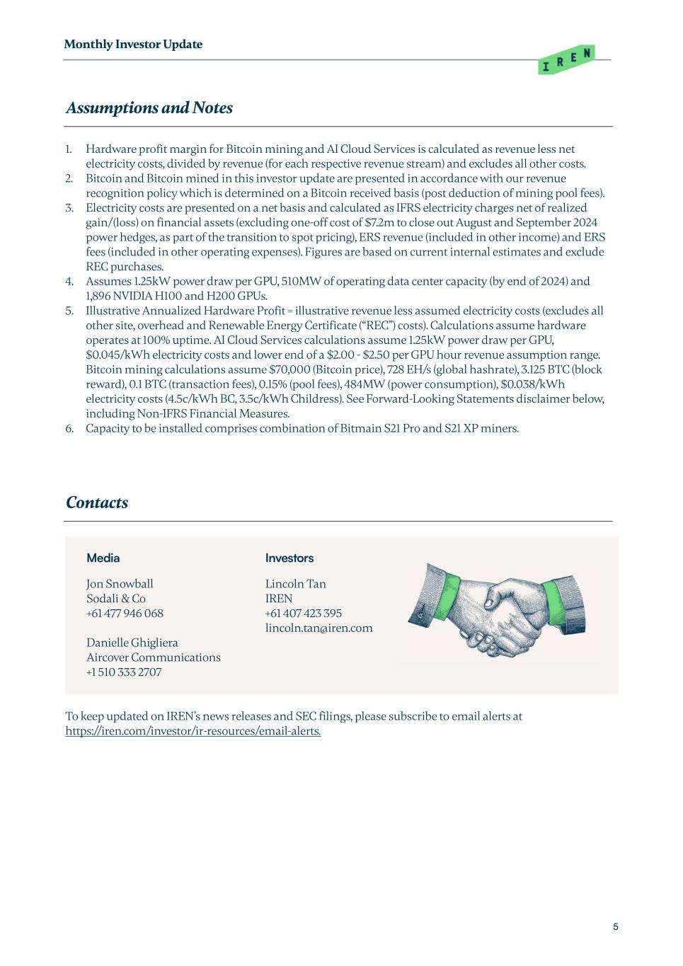 Monthly Investor Update 5 Assumptions and Notes 1. Hardware profit margin for Bitcoin mining and AI Cloud Services is calculated as revenue less net electricity costs, divided by revenue (for each respective revenue stream) and excludes all other costs. 2. Bitcoin and Bitcoin mined in this investor update are presented in accordance with our revenue recognition policy which is determined on a Bitcoin received basis (post deduction of mining pool fees). 3. Electricity costs are presented on a net basis and calculated as IFRS electricity charges net of realized gain/(loss) on financial assets (excluding one-off cost of $7.2m to close out August and September 2024 power hedges, as part of the transition to spot pricing), ERS revenue (included in other income) and ERS fees (included in other operating expenses). Figures are based on current internal estimates and exclude REC purchases. 4. Assumes 1.25kW power draw per GPU, 510MW of operating data center capacity (by end of 2024) and 1,896 NVIDIA H100 and H200 GPUs. 5. Illustrative Annualized Hardware Profit = illustrative revenue less assumed electricity costs (excludes all other site, overhead and Renewable Energy Certificate (“REC”) costs). Calculations assume hardware operates at 100% uptime. AI Cloud Services calculations assume 1.25kW power draw per GPU, $0.045/kWh electricity costs and lower end of a $2.00 - $2.50 per GPU hour revenue assumption range. Bitcoin mining calculations assume $70,000 (Bitcoin price), 728 EH/s (global hashrate), 3.125 BTC (block reward), 0.1 BTC (transaction fees), 0.15% (pool fees), 484MW (power consumption), $0.038/kWh electricity costs (4.5c/kWh BC, 3.5c/kWh Childress). See Forward-Looking Statements disclaimer below, including Non-IFRS Financial Measures. 6. Capacity to be installed comprises combination of Bitmain S21 Pro and S21 XP miners. Contacts Media Jon Snowball Sodali & Co +61 477 946 068 Danielle Ghigliera Aircover Communications +1 510 333 2707 Investors Lincoln Tan IREN +61 407 423 395 lincoln.tan@iren.com To keep updated on IREN’s news releases and SEC filings, please subscribe to email alerts at https://iren.com/investor/ir-resources/email-alerts.
