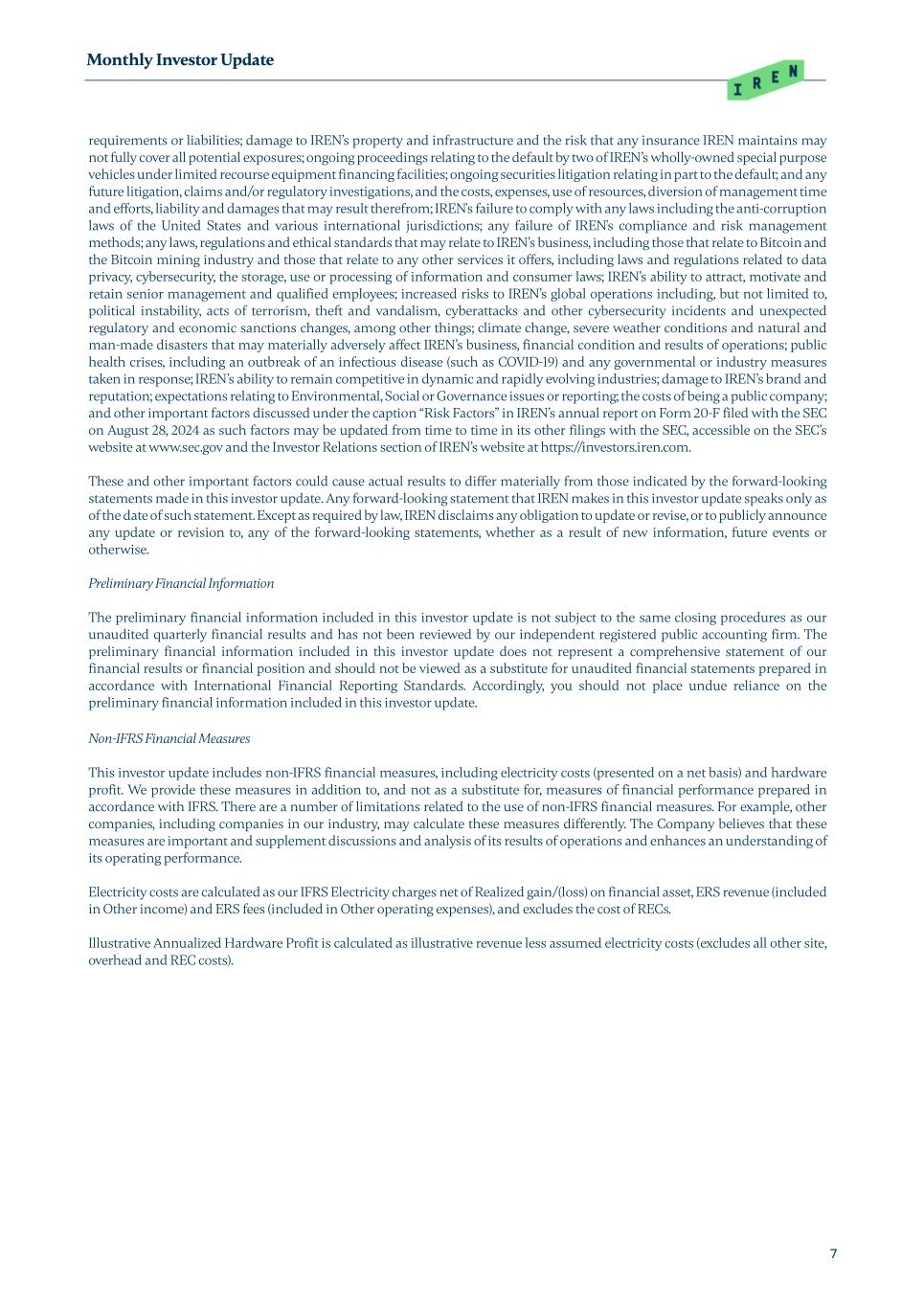 Monthly Investor Update 7 requirements or liabilities; damage to IREN’s property and infrastructure and the risk that any insurance IREN maintains may not fully cover all potential exposures; ongoing proceedings relating to the default by two of IREN’s wholly-owned special purpose vehicles under limited recourse equipment financing facilities; ongoing securities litigation relating in part to the default; and any future litigation, claims and/or regulatory investigations, and the costs, expenses, use of resources, diversion of management time and efforts, liability and damages that may result therefrom; IREN's failure to comply with any laws including the anti-corruption laws of the United States and various international jurisdictions; any failure of IREN's compliance and risk management methods; any laws, regulations and ethical standards that may relate to IREN’s business, including those that relate to Bitcoin and the Bitcoin mining industry and those that relate to any other services it offers, including laws and regulations related to data privacy, cybersecurity, the storage, use or processing of information and consumer laws; IREN’s ability to attract, motivate and retain senior management and qualified employees; increased risks to IREN’s global operations including, but not limited to, political instability, acts of terrorism, theft and vandalism, cyberattacks and other cybersecurity incidents and unexpected regulatory and economic sanctions changes, among other things; climate change, severe weather conditions and natural and man-made disasters that may materially adversely affect IREN’s business, financial condition and results of operations; public health crises, including an outbreak of an infectious disease (such as COVID-19) and any governmental or industry measures taken in response; IREN’s ability to remain competitive in dynamic and rapidly evolving industries; damage to IREN’s brand and reputation; expectations relating to Environmental, Social or Governance issues or reporting; the costs of being a public company; and other important factors discussed under the caption “Risk Factors” in IREN’s annual report on Form 20-F filed with the SEC on August 28, 2024 as such factors may be updated from time to time in its other filings with the SEC, accessible on the SEC’s website at www.sec.gov and the Investor Relations section of IREN’s website at https://investors.iren.com. These and other important factors could cause actual results to differ materially from those indicated by the forward-looking statements made in this investor update. Any forward-looking statement that IREN makes in this investor update speaks only as of the date of such statement. Except as required by law, IREN disclaims any obligation to update or revise, or to publicly announce any update or revision to, any of the forward-looking statements, whether as a result of new information, future events or otherwise. Preliminary Financial Information The preliminary financial information included in this investor update is not subject to the same closing procedures as our unaudited quarterly financial results and has not been reviewed by our independent registered public accounting firm. The preliminary financial information included in this investor update does not represent a comprehensive statement of our financial results or financial position and should not be viewed as a substitute for unaudited financial statements prepared in accordance with International Financial Reporting Standards. Accordingly, you should not place undue reliance on the preliminary financial information included in this investor update. Non-IFRS Financial Measures This investor update includes non-IFRS financial measures, including electricity costs (presented on a net basis) and hardware profit. We provide these measures in addition to, and not as a substitute for, measures of financial performance prepared in accordance with IFRS. There are a number of limitations related to the use of non-IFRS financial measures. For example, other companies, including companies in our industry, may calculate these measures differently. The Company believes that these measures are important and supplement discussions and analysis of its results of operations and enhances an understanding of its operating performance. Electricity costs are calculated as our IFRS Electricity charges net of Realized gain/(loss) on financial asset, ERS revenue (included in Other income) and ERS fees (included in Other operating expenses), and excludes the cost of RECs. Illustrative Annualized Hardware Profit is calculated as illustrative revenue less assumed electricity costs (excludes all other site, overhead and REC costs).