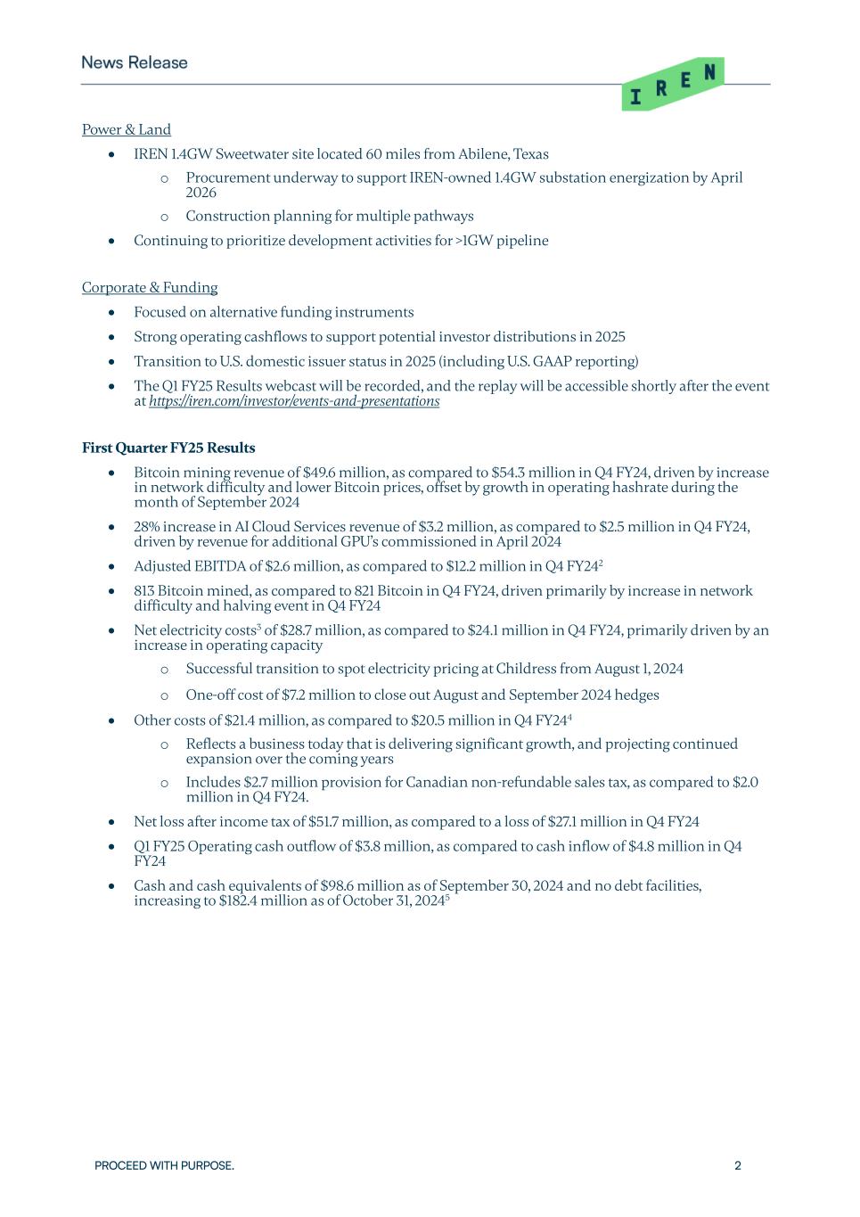 PROCEED WITH PURPOSE. 1 IREN Reports Q1 FY25 Results 50 EH/s expansion accelerated to H1 2025 Focused on alternative funding instruments Potential for investor distributions in 2025 Transition to U.S. domestic issuer SYDNEY, AUSTRALIA, November 26, 2024 (GLOBE NEWSWIRE) – IREN (NASDAQ: IREN) (together with its subsidiaries, “IREN” or “the Company”), today reported its financial results for the first quarter ended September 30, 2024. All $ amounts are in United States Dollars (“USD”) unless otherwise stated. “We are pleased to report our Q1 FY25 results and reiterate our focus on low-cost Bitcoin mining, operating cashflows and shareholder returns”, said Daniel Roberts, Co-Founder and Co-CEO of IREN. “We are just weeks away from achieving our 31 EH/s milestone and are excited to announce the acceleration of our growth trajectory to 50 EH/s in H1 2025, which was previously H2 2025. Our funding program is focused on alternative funding instruments and the strong operating cashflows we expect to generate enhances our flexibility to support potential distributions in 2025”. Business Update Bitcoin Mining • 21 EH/s installed, on-track for 31 EH/s next month • Accelerating expansion to 50 EH/s in H1 2025 o Previously H2 2025 o Single site expansion at Childress o S21 Pro miners previously secured (fixed price, $18.9/TH) • Institutional-grade mining exposure o Vertically integrated, large scale and low-cost producer o ~$29k all-in cash cost per Bitcoin1 o Non-HODL approach and prudent capital stewardship through the cycle o Commitment to 100% renewable energy, supporting energy grids and local communities AI/HPC Update • AI Cloud Services o 1,896 NVIDIA H100 & H200 GPUs o Focus on measured growth, only in response to customer demand • Other o Continuing to advance negotiations with parties on a range of structures in relation to IREN sites – any transaction would need to reflect strategic value of IREN assets o Installing liquid cooling infrastructure at Childress and Prince George to support NVIDIA Blackwell GPUs