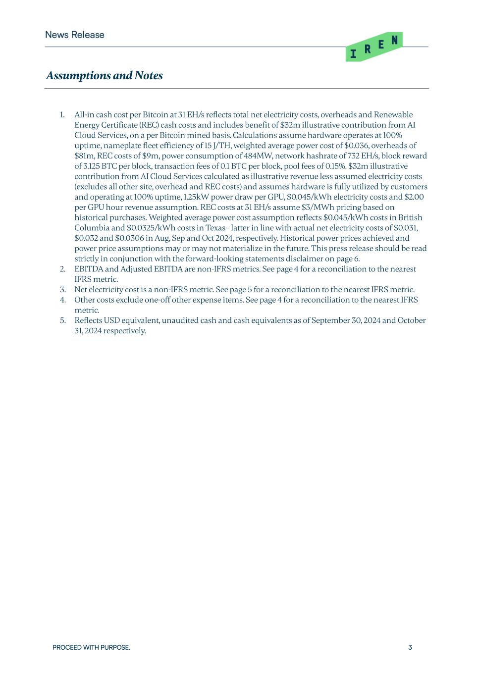 PROCEED WITH PURPOSE. 3 Assumptions and Notes 1. All-in cash cost per Bitcoin at 31 EH/s reflects total net electricity costs, overheads and Renewable Energy Certificate (REC) cash costs and includes benefit of $32m illustrative contribution from AI Cloud Services, on a per Bitcoin mined basis. Calculations assume hardware operates at 100% uptime, nameplate fleet efficiency of 15 J/TH, weighted average power cost of $0.036, overheads of $81m, REC costs of $9m, power consumption of 484MW, network hashrate of 732 EH/s, block reward of 3.125 BTC per block, transaction fees of 0.1 BTC per block, pool fees of 0.15%. $32m illustrative contribution from AI Cloud Services calculated as illustrative revenue less assumed electricity costs (excludes all other site, overhead and REC costs) and assumes hardware is fully utilized by customers and operating at 100% uptime, 1.25kW power draw per GPU, $0.045/kWh electricity costs and $2.00 per GPU hour revenue assumption. REC costs at 31 EH/s assume $3/MWh pricing based on historical purchases. Weighted average power cost assumption reflects $0.045/kWh costs in British Columbia and $0.0325/kWh costs in Texas - latter in line with actual net electricity costs of $0.031, $0.032 and $0.0306 in Aug, Sep and Oct 2024, respectively. Historical power prices achieved and power price assumptions may or may not materialize in the future. This press release should be read strictly in conjunction with the forward-looking statements disclaimer on page 6. 2. EBITDA and Adjusted EBITDA are non-IFRS metrics. See page 4 for a reconciliation to the nearest IFRS metric. 3. Net electricity cost is a non-IFRS metric. See page 5 for a reconciliation to the nearest IFRS metric. 4. Other costs exclude one-off other expense items. See page 4 for a reconciliation to the nearest IFRS metric. 5. Reflects USD equivalent, unaudited cash and cash equivalents as of September 30, 2024 and October 31, 2024 respectively.
