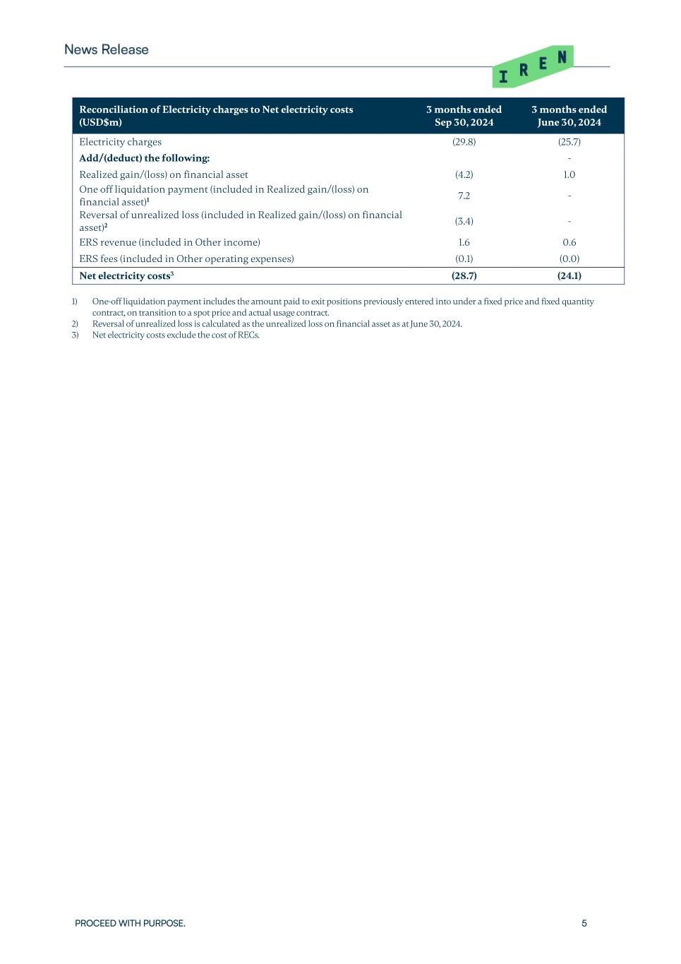 PROCEED WITH PURPOSE. 5 Reconciliation of Electricity charges to Net electricity costs (USD$m) 3 months ended Sep 30, 2024 3 months ended June 30, 2024 Electricity charges (29.8) (25.7) Add/(deduct) the following: - Realized gain/(loss) on financial asset (4.2) 1.0 One off liquidation payment (included in Realized gain/(loss) on financial asset)1 7.2 - Reversal of unrealized loss (included in Realized gain/(loss) on financial asset)2 (3.4) - ERS revenue (included in Other income) 1.6 0.6 ERS fees (included in Other operating expenses) (0.1) (0.0) Net electricity costs3 (28.7) (24.1) 1) One-off liquidation payment includes the amount paid to exit positions previously entered into under a fixed price and fixed quantity contract, on transition to a spot price and actual usage contract. 2) Reversal of unrealized loss is calculated as the unrealized loss on financial asset as at June 30, 2024. 3) Net electricity costs exclude the cost of RECs.
