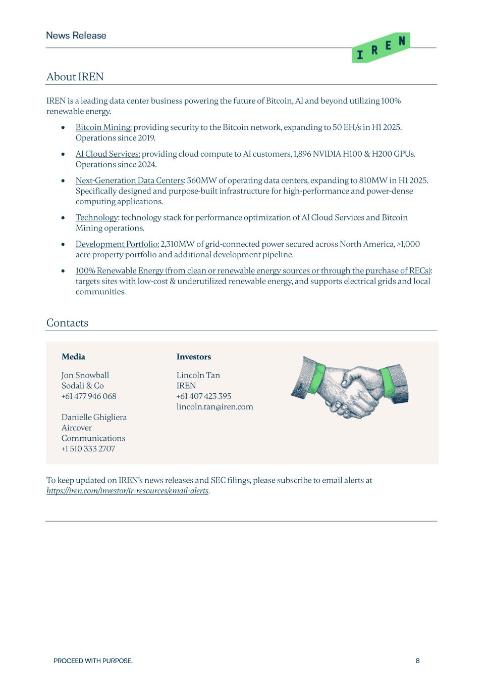 PROCEED WITH PURPOSE. 8 About IREN IREN is a leading data center business powering the future of Bitcoin, AI and beyond utilizing 100% renewable energy. • Bitcoin Mining: providing security to the Bitcoin network, expanding to 50 EH/s in H1 2025. Operations since 2019. • AI Cloud Services: providing cloud compute to AI customers, 1,896 NVIDIA H100 & H200 GPUs. Operations since 2024. • Next-Generation Data Centers: 360MW of operating data centers, expanding to 810MW in H1 2025. Specifically designed and purpose-built infrastructure for high-performance and power-dense computing applications. • Technology: technology stack for performance optimization of AI Cloud Services and Bitcoin Mining operations. • Development Portfolio: 2,310MW of grid-connected power secured across North America, >1,000 acre property portfolio and additional development pipeline. • 100% Renewable Energy (from clean or renewable energy sources or through the purchase of RECs): targets sites with low-cost & underutilized renewable energy, and supports electrical grids and local communities. Contacts Media Jon Snowball Sodali & Co +61 477 946 068 Danielle Ghigliera Aircover Communications +1 510 333 2707 Investors Lincoln Tan IREN +61 407 423 395 lincoln.tan@iren.com To keep updated on IREN’s news releases and SEC filings, please subscribe to email alerts at https://iren.com/investor/ir-resources/email-alerts.