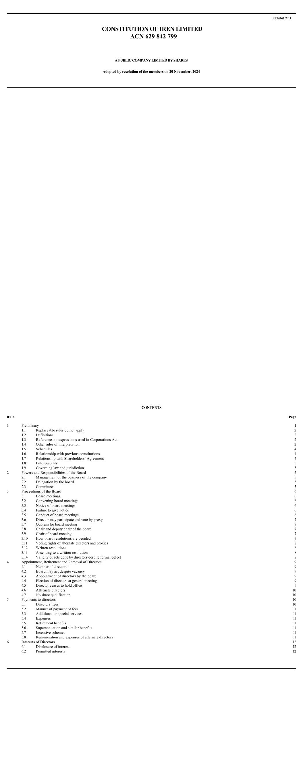 Exhibit 99.1 CONSTITUTION OF IREN LIMITED ACN 629 842 799 A PUBLIC COMPANY LIMITED BY SHARES Adopted by resolution of the members on 20 November, 2024 CONTENTS Rule Page 1. Preliminary 1 1.1 Replaceable rules do not apply 2 1.2 Definitions 2 1.3 References to expressions used in Corporations Act 2 1.4 Other rules of interpretation 2 1.5 Schedules 4 1.6 Relationship with previous constitutions 4 1.7 Relationship with Shareholders’ Agreement 4 1.8 Enforceability 5 1.9 Governing law and jurisdiction 5 2. Powers and Responsibilities of the Board 5 2.1 Management of the business of the company 5 2.2 Delegation by the board 5 2.3 Committees 5 3. Proceedings of the Board 6 3.1 Board meetings 6 3.2 Convening board meetings 6 3.3 Notice of board meetings 6 3.4 Failure to give notice 6 3.5 Conduct of board meetings 6 3.6 Director may participate and vote by proxy 7 3.7 Quorum for board meeting 7 3.8 Chair and deputy chair of the board 7 3.9 Chair of board meeting 7 3.10 How board resolutions are decided 7 3.11 Voting rights of alternate directors and proxies 8 3.12 Written resolutions 8 3.13 Assenting to a written resolution 8 3.14 Validity of acts done by directors despite formal defect 8 4. Appointment, Retirement and Removal of Directors 9 4.1 Number of directors 9 4.2 Board may act despite vacancy 9 4.3 Appointment of directors by the board 9 4.4 Election of directors at general meeting 9 4.5 Director ceases to hold office 9 4.6 Alternate directors 10 4.7 No share qualification 10 5. Payments to directors 10 5.1 Directors’ fees 10 5.2 Manner of payment of fees 11 5.3 Additional or special services 11 5.4 Expenses 11 5.5 Retirement benefits 11 5.6 Superannuation and similar benefits 11 5.7 Incentive schemes 11 5.8 Remuneration and expenses of alternate directors 11 6. Interests of Directors 12 6.1 Disclosure of interests 12 6.2 Permitted interests 12