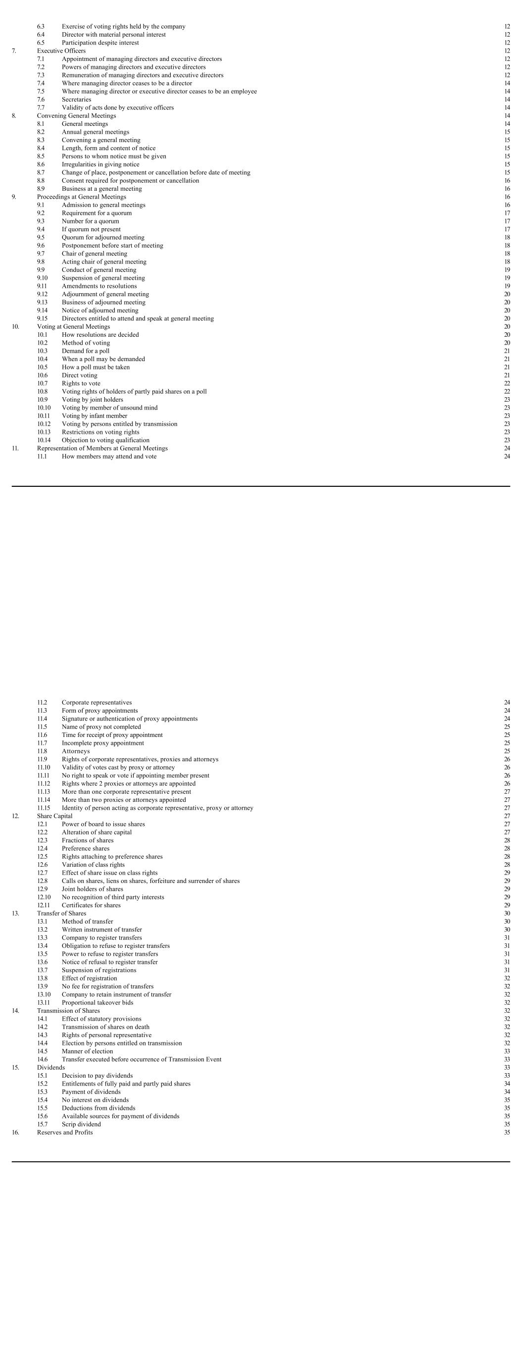 6.3 Exercise of voting rights held by the company 12 6.4 Director with material personal interest 12 6.5 Participation despite interest 12 7. Executive Officers 12 7.1 Appointment of managing directors and executive directors 12 7.2 Powers of managing directors and executive directors 12 7.3 Remuneration of managing directors and executive directors 12 7.4 Where managing director ceases to be a director 14 7.5 Where managing director or executive director ceases to be an employee 14 7.6 Secretaries 14 7.7 Validity of acts done by executive officers 14 8. Convening General Meetings 14 8.1 General meetings 14 8.2 Annual general meetings 15 8.3 Convening a general meeting 15 8.4 Length, form and content of notice 15 8.5 Persons to whom notice must be given 15 8.6 Irregularities in giving notice 15 8.7 Change of place, postponement or cancellation before date of meeting 15 8.8 Consent required for postponement or cancellation 16 8.9 Business at a general meeting 16 9. Proceedings at General Meetings 16 9.1 Admission to general meetings 16 9.2 Requirement for a quorum 17 9.3 Number for a quorum 17 9.4 If quorum not present 17 9.5 Quorum for adjourned meeting 18 9.6 Postponement before start of meeting 18 9.7 Chair of general meeting 18 9.8 Acting chair of general meeting 18 9.9 Conduct of general meeting 19 9.10 Suspension of general meeting 19 9.11 Amendments to resolutions 19 9.12 Adjournment of general meeting 20 9.13 Business of adjourned meeting 20 9.14 Notice of adjourned meeting 20 9.15 Directors entitled to attend and speak at general meeting 20 10. Voting at General Meetings 20 10.1 How resolutions are decided 20 10.2 Method of voting 20 10.3 Demand for a poll 21 10.4 When a poll may be demanded 21 10.5 How a poll must be taken 21 10.6 Direct voting 21 10.7 Rights to vote 22 10.8 Voting rights of holders of partly paid shares on a poll 22 10.9 Voting by joint holders 23 10.10 Voting by member of unsound mind 23 10.11 Voting by infant member 23 10.12 Voting by persons entitled by transmission 23 10.13 Restrictions on voting rights 23 10.14 Objection to voting qualification 23 11. Representation of Members at General Meetings 24 11.1 How members may attend and vote 24 11.2 Corporate representatives 24 11.3 Form of proxy appointments 24 11.4 Signature or authentication of proxy appointments 24 11.5 Name of proxy not completed 25 11.6 Time for receipt of proxy appointment 25 11.7 Incomplete proxy appointment 25 11.8 Attorneys 25 11.9 Rights of corporate representatives, proxies and attorneys 26 11.10 Validity of votes cast by proxy or attorney 26 11.11 No right to speak or vote if appointing member present 26 11.12 Rights where 2 proxies or attorneys are appointed 26 11.13 More than one corporate representative present 27 11.14 More than two proxies or attorneys appointed 27 11.15 Identity of person acting as corporate representative, proxy or attorney 27 12. Share Capital 27 12.1 Power of board to issue shares 27 12.2 Alteration of share capital 27 12.3 Fractions of shares 28 12.4 Preference shares 28 12.5 Rights attaching to preference shares 28 12.6 Variation of class rights 28 12.7 Effect of share issue on class rights 29 12.8 Calls on shares, liens on shares, forfeiture and surrender of shares 29 12.9 Joint holders of shares 29 12.10 No recognition of third party interests 29 12.11 Certificates for shares 29 13. Transfer of Shares 30 13.1 Method of transfer 30 13.2 Written instrument of transfer 30 13.3 Company to register transfers 31 13.4 Obligation to refuse to register transfers 31 13.5 Power to refuse to register transfers 31 13.6 Notice of refusal to register transfer 31 13.7 Suspension of registrations 31 13.8 Effect of registration 32 13.9 No fee for registration of transfers 32 13.10 Company to retain instrument of transfer 32 13.11 Proportional takeover bids 32 14. Transmission of Shares 32 14.1 Effect of statutory provisions 32 14.2 Transmission of shares on death 32 14.3 Rights of personal representative 32 14.4 Election by persons entitled on transmission 32 14.5 Manner of election 33 14.6 Transfer executed before occurrence of Transmission Event 33 15. Dividends 33 15.1 Decision to pay dividends 33 15.2 Entitlements of fully paid and partly paid shares 34 15.3 Payment of dividends 34 15.4 No interest on dividends 35 15.5 Deductions from dividends 35 15.6 Available sources for payment of dividends 35 15.7 Scrip dividend 35 16. Reserves and Profits 35