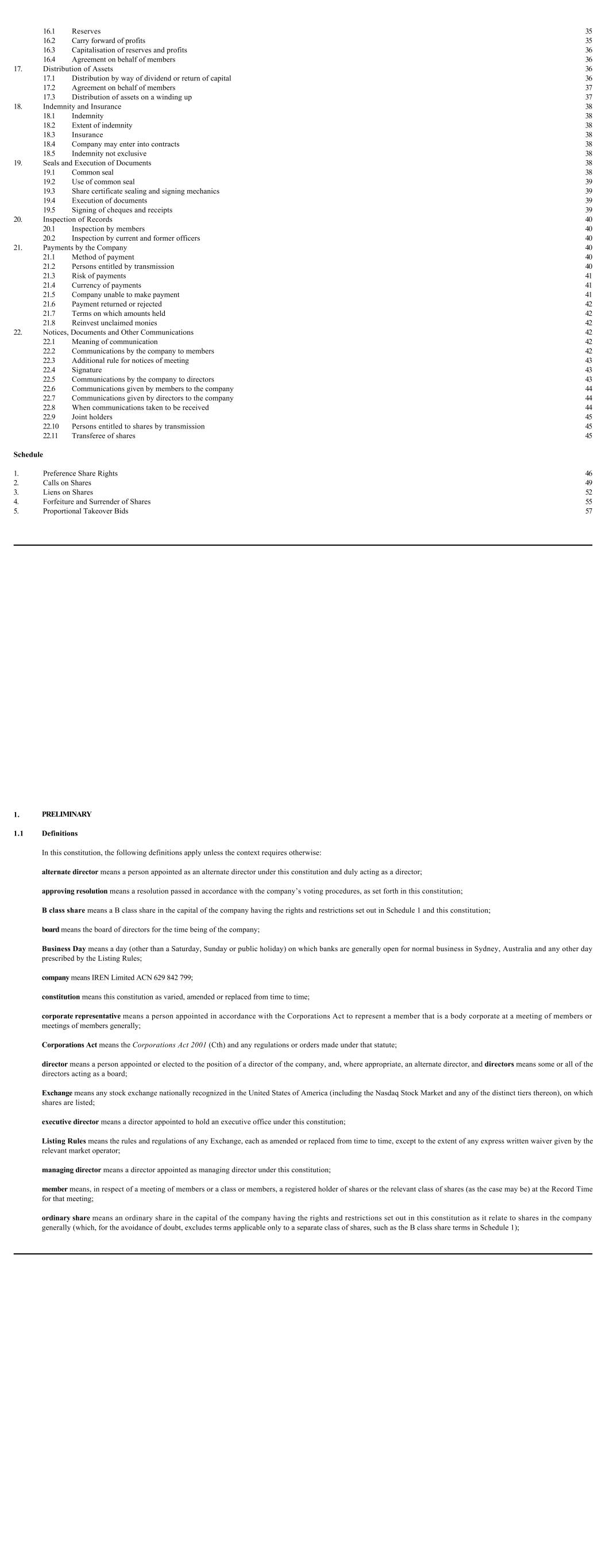 16.1 Reserves 35 16.2 Carry forward of profits 35 16.3 Capitalisation of reserves and profits 36 16.4 Agreement on behalf of members 36 17. Distribution of Assets 36 17.1 Distribution by way of dividend or return of capital 36 17.2 Agreement on behalf of members 37 17.3 Distribution of assets on a winding up 37 18. Indemnity and Insurance 38 18.1 Indemnity 38 18.2 Extent of indemnity 38 18.3 Insurance 38 18.4 Company may enter into contracts 38 18.5 Indemnity not exclusive 38 19. Seals and Execution of Documents 38 19.1 Common seal 38 19.2 Use of common seal 39 19.3 Share certificate sealing and signing mechanics 39 19.4 Execution of documents 39 19.5 Signing of cheques and receipts 39 20. Inspection of Records 40 20.1 Inspection by members 40 20.2 Inspection by current and former officers 40 21. Payments by the Company 40 21.1 Method of payment 40 21.2 Persons entitled by transmission 40 21.3 Risk of payments 41 21.4 Currency of payments 41 21.5 Company unable to make payment 41 21.6 Payment returned or rejected 42 21.7 Terms on which amounts held 42 21.8 Reinvest unclaimed monies 42 22. Notices, Documents and Other Communications 42 22.1 Meaning of communication 42 22.2 Communications by the company to members 42 22.3 Additional rule for notices of meeting 43 22.4 Signature 43 22.5 Communications by the company to directors 43 22.6 Communications given by members to the company 44 22.7 Communications given by directors to the company 44 22.8 When communications taken to be received 44 22.9 Joint holders 45 22.10 Persons entitled to shares by transmission 45 22.11 Transferee of shares 45 Schedule 1. Preference Share Rights 46 2. Calls on Shares 49 3. Liens on Shares 52 4. Forfeiture and Surrender of Shares 55 5. Proportional Takeover Bids 57 1. 1.1 PRELIMINARY Definitions In this constitution, the following definitions apply unless the context requires otherwise: alternate director means a person appointed as an alternate director under this constitution and duly acting as a director; approving resolution means a resolution passed in accordance with the company’s voting procedures, as set forth in this constitution; B class share means a B class share in the capital of the company having the rights and restrictions set out in Schedule 1 and this constitution; board means the board of directors for the time being of the company; Business Day means a day (other than a Saturday, Sunday or public holiday) on which banks are generally open for normal business in Sydney, Australia and any other day prescribed by the Listing Rules; company means IREN Limited ACN 629 842 799; constitution means this constitution as varied, amended or replaced from time to time; corporate representative means a person appointed in accordance with the Corporations Act to represent a member that is a body corporate at a meeting of members or meetings of members generally; Corporations Act means the Corporations Act 2001 (Cth) and any regulations or orders made under that statute; director means a person appointed or elected to the position of a director of the company, and, where appropriate, an alternate director, and directors means some or all of the directors acting as a board; Exchange means any stock exchange nationally recognized in the United States of America (including the Nasdaq Stock Market and any of the distinct tiers thereon), on which shares are listed; executive director means a director appointed to hold an executive office under this constitution; Listing Rules means the rules and regulations of any Exchange, each as amended or replaced from time to time, except to the extent of any express written waiver given by the relevant market operator; managing director means a director appointed as managing director under this constitution; member means, in respect of a meeting of members or a class or members, a registered holder of shares or the relevant class of shares (as the case may be) at the Record Time for that meeting; ordinary share means an ordinary share in the capital of the company having the rights and restrictions set out in this constitution as it relate to shares in the company generally (which, for the avoidance of doubt, excludes terms applicable only to a separate class of shares, such as the B class share terms in Schedule 1);
