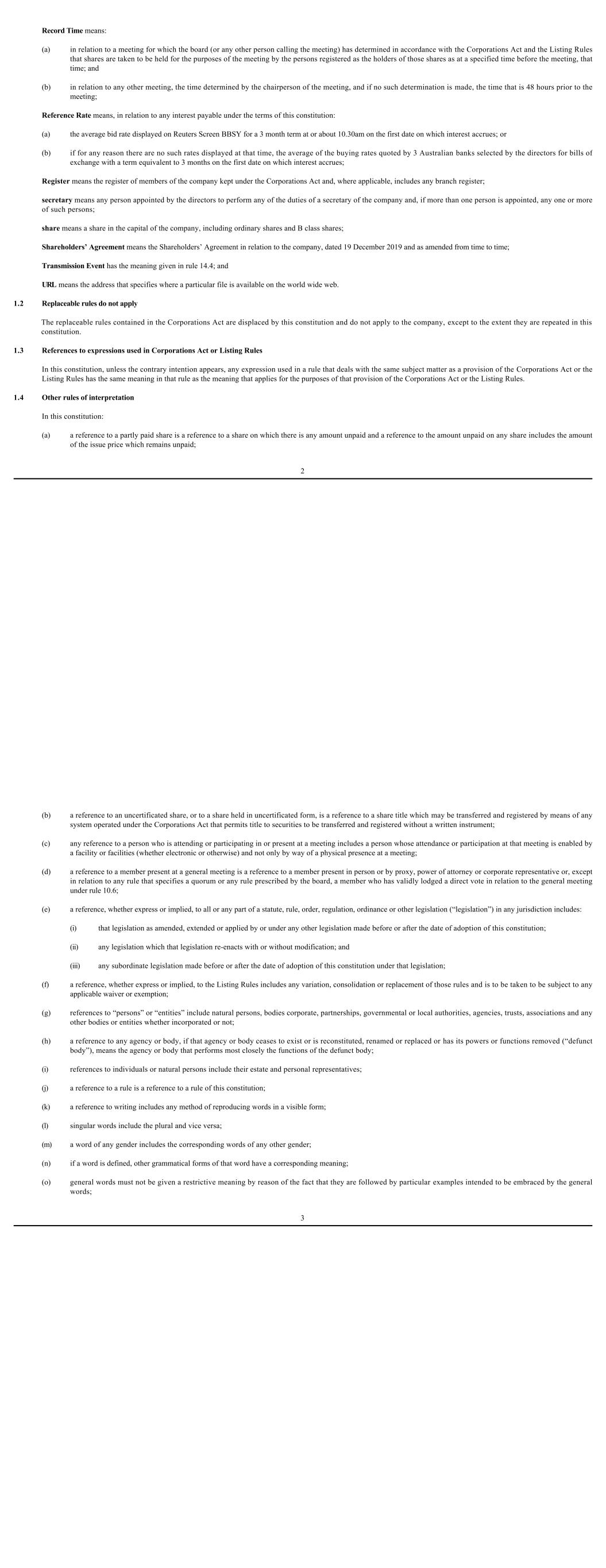 Record Time means: (a) in relation to a meeting for which the board (or any other person calling the meeting) has determined in accordance with the Corporations Act and the Listing Rules that shares are taken to be held for the purposes of the meeting by the persons registered as the holders of those shares as at a specified time before the meeting, that time; and (b) in relation to any other meeting, the time determined by the chairperson of the meeting, and if no such determination is made, the time that is 48 hours prior to the meeting; Reference Rate means, in relation to any interest payable under the terms of this constitution: (a) the average bid rate displayed on Reuters Screen BBSY for a 3 month term at or about 10.30am on the first date on which interest accrues; or (b) if for any reason there are no such rates displayed at that time, the average of the buying rates quoted by 3 Australian banks selected by the directors for bills of exchange with a term equivalent to 3 months on the first date on which interest accrues; Register means the register of members of the company kept under the Corporations Act and, where applicable, includes any branch register; secretary means any person appointed by the directors to perform any of the duties of a secretary of the company and, if more than one person is appointed, any one or more of such persons; share means a share in the capital of the company, including ordinary shares and B class shares; Shareholders’ Agreement means the Shareholders’ Agreement in relation to the company, dated 19 December 2019 and as amended from time to time; Transmission Event has the meaning given in rule 14.4; and URL means the address that specifies where a particular file is available on the world wide web. 1.2 Replaceable rules do not apply The replaceable rules contained in the Corporations Act are displaced by this constitution and do not apply to the company, except to the extent they are repeated in this constitution. 1.3 References to expressions used in Corporations Act or Listing Rules In this constitution, unless the contrary intention appears, any expression used in a rule that deals with the same subject matter as a provision of the Corporations Act or the Listing Rules has the same meaning in that rule as the meaning that applies for the purposes of that provision of the Corporations Act or the Listing Rules. 1.4 Other rules of interpretation In this constitution: (a) a reference to a partly paid share is a reference to a share on which there is any amount unpaid and a reference to the amount unpaid on any share includes the amount of the issue price which remains unpaid; 2 (b) a reference to an uncertificated share, or to a share held in uncertificated form, is a reference to a share title which may be transferred and registered by means of any system operated under the Corporations Act that permits title to securities to be transferred and registered without a written instrument; (c) any reference to a person who is attending or participating in or present at a meeting includes a person whose attendance or participation at that meeting is enabled by a facility or facilities (whether electronic or otherwise) and not only by way of a physical presence at a meeting; (d) a reference to a member present at a general meeting is a reference to a member present in person or by proxy, power of attorney or corporate representative or, except in relation to any rule that specifies a quorum or any rule prescribed by the board, a member who has validly lodged a direct vote in relation to the general meeting under rule 10.6; (e) a reference, whether express or implied, to all or any part of a statute, rule, order, regulation, ordinance or other legislation (“legislation”) in any jurisdiction includes: (i) that legislation as amended, extended or applied by or under any other legislation made before or after the date of adoption of this constitution; (ii) any legislation which that legislation re-enacts with or without modification; and (iii) any subordinate legislation made before or after the date of adoption of this constitution under that legislation; (f) a reference, whether express or implied, to the Listing Rules includes any variation, consolidation or replacement of those rules and is to be taken to be subject to any applicable waiver or exemption; (g) references to “persons” or “entities” include natural persons, bodies corporate, partnerships, governmental or local authorities, agencies, trusts, associations and any other bodies or entities whether incorporated or not; (h) a reference to any agency or body, if that agency or body ceases to exist or is reconstituted, renamed or replaced or has its powers or functions removed (“defunct body”), means the agency or body that performs most closely the functions of the defunct body; (i) references to individuals or natural persons include their estate and personal representatives; (j) a reference to a rule is a reference to a rule of this constitution; (k) a reference to writing includes any method of reproducing words in a visible form; (l) singular words include the plural and vice versa; (m) a word of any gender includes the corresponding words of any other gender; (n) if a word is defined, other grammatical forms of that word have a corresponding meaning; (o) general words must not be given a restrictive meaning by reason of the fact that they are followed by particular examples intended to be embraced by the general words; 3