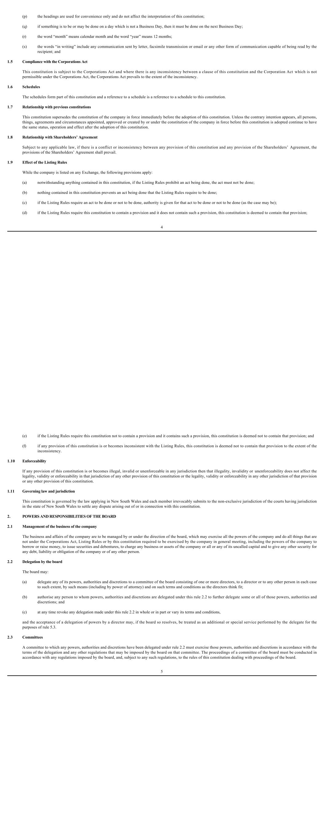 (p) the headings are used for convenience only and do not affect the interpretation of this constitution; (q) if something is to be or may be done on a day which is not a Business Day, then it must be done on the next Business Day; (r) the word “month” means calendar month and the word “year” means 12 months; (s) the words “in writing” include any communication sent by letter, facsimile transmission or email or any other form of communication capable of being read by the recipient; and 1.5 Compliance with the Corporations Act This constitution is subject to the Corporations Act and where there is any inconsistency between a clause of this constitution and the Corporation Act which is not permissible under the Corporations Act, the Corporations Act prevails to the extent of the inconsistency. 1.6 Schedules The schedules form part of this constitution and a reference to a schedule is a reference to a schedule to this constitution. 1.7 Relationship with previous constitutions This constitution supersedes the constitution of the company in force immediately before the adoption of this constitution. Unless the contrary intention appears, all persons, things, agreements and circumstances appointed, approved or created by or under the constitution of the company in force before this constitution is adopted continue to have the same status, operation and effect after the adoption of this constitution. 1.8 Relationship with Shareholders’ Agreement Subject to any applicable law, if there is a conflict or inconsistency between any provision of this constitution and any provision of the Shareholders’ Agreement, the provisions of the Shareholders’ Agreement shall prevail. 1.9 Effect of the Listing Rules While the company is listed on any Exchange, the following provisions apply: (a) notwithstanding anything contained in this constitution, if the Listing Rules prohibit an act being done, the act must not be done; (b) nothing contained in this constitution prevents an act being done that the Listing Rules require to be done; (c) if the Listing Rules require an act to be done or not to be done, authority is given for that act to be done or not to be done (as the case may be); (d) if the Listing Rules require this constitution to contain a provision and it does not contain such a provision, this constitution is deemed to contain that provision; 4 (e) if the Listing Rules require this constitution not to contain a provision and it contains such a provision, this constitution is deemed not to contain that provision; and (f) if any provision of this constitution is or becomes inconsistent with the Listing Rules, this constitution is deemed not to contain that provision to the extent of the inconsistency. 1.10 Enforceability If any provision of this constitution is or becomes illegal, invalid or unenforceable in any jurisdiction then that illegality, invalidity or unenforceability does not affect the legality, validity or enforceability in that jurisdiction of any other provision of this constitution or the legality, validity or enforceability in any other jurisdiction of that provision or any other provision of this constitution. 1.11 Governing law and jurisdiction This constitution is governed by the law applying in New South Wales and each member irrevocably submits to the non-exclusive jurisdiction of the courts having jurisdiction in the state of New South Wales to settle any dispute arising out of or in connection with this constitution. 2. POWERS AND RESPONSIBILITIES OF THE BOARD 2.1 Management of the business of the company The business and affairs of the company are to be managed by or under the direction of the board, which may exercise all the powers of the company and do all things that are not under the Corporations Act, Listing Rules or by this constitution required to be exercised by the company in general meeting, including the powers of the company to borrow or raise money, to issue securities and debentures, to charge any business or assets of the company or all or any of its uncalled capital and to give any other security for any debt, liability or obligation of the company or of any other person. 2.2 Delegation by the board The board may: (a) delegate any of its powers, authorities and discretions to a committee of the board consisting of one or more directors, to a director or to any other person in each case to such extent, by such means (including by power of attorney) and on such terms and conditions as the directors think fit; (b) authorise any person to whom powers, authorities and discretions are delegated under this rule 2.2 to further delegate some or all of those powers, authorities and discretions; and (c) at any time revoke any delegation made under this rule 2.2 in whole or in part or vary its terms and conditions, and the acceptance of a delegation of powers by a director may, if the board so resolves, be treated as an additional or special service performed by the delegate for the purposes of rule 5.3. 2.3 Committees A committee to which any powers, authorities and discretions have been delegated under rule 2.2 must exercise those powers, authorities and discretions in accordance with the terms of the delegation and any other regulations that may be imposed by the board on that committee. The proceedings of a committee of the board must be conducted in accordance with any regulations imposed by the board, and, subject to any such regulations, to the rules of this constitution dealing with proceedings of the board. 5