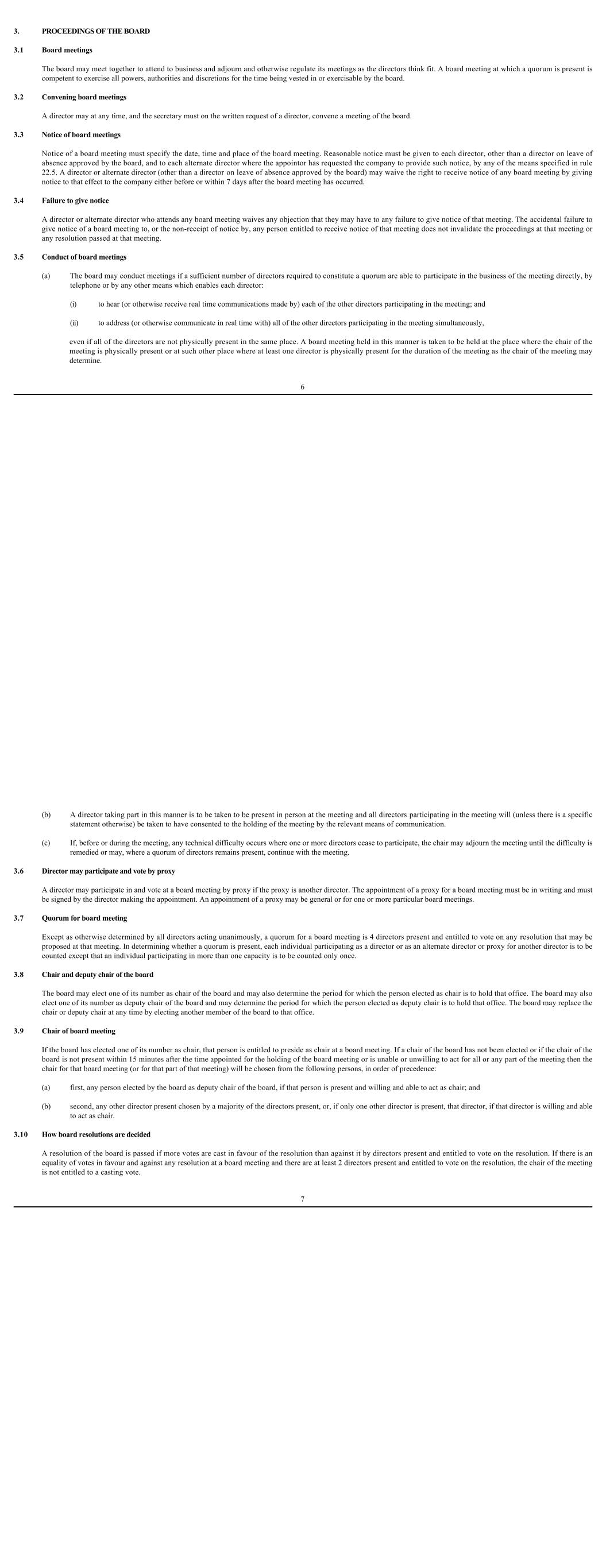 3. PROCEEDINGS OF THE BOARD 3.1 Board meetings The board may meet together to attend to business and adjourn and otherwise regulate its meetings as the directors think fit. A board meeting at which a quorum is present is competent to exercise all powers, authorities and discretions for the time being vested in or exercisable by the board. 3.2 Convening board meetings A director may at any time, and the secretary must on the written request of a director, convene a meeting of the board. 3.3 Notice of board meetings Notice of a board meeting must specify the date, time and place of the board meeting. Reasonable notice must be given to each director, other than a director on leave of absence approved by the board, and to each alternate director where the appointor has requested the company to provide such notice, by any of the means specified in rule 22.5. A director or alternate director (other than a director on leave of absence approved by the board) may waive the right to receive notice of any board meeting by giving notice to that effect to the company either before or within 7 days after the board meeting has occurred. 3.4 Failure to give notice A director or alternate director who attends any board meeting waives any objection that they may have to any failure to give notice of that meeting. The accidental failure to give notice of a board meeting to, or the non-receipt of notice by, any person entitled to receive notice of that meeting does not invalidate the proceedings at that meeting or any resolution passed at that meeting. 3.5 Conduct of board meetings (a) The board may conduct meetings if a sufficient number of directors required to constitute a quorum are able to participate in the business of the meeting directly, by telephone or by any other means which enables each director: (i) to hear (or otherwise receive real time communications made by) each of the other directors participating in the meeting; and (ii) to address (or otherwise communicate in real time with) all of the other directors participating in the meeting simultaneously, even if all of the directors are not physically present in the same place. A board meeting held in this manner is taken to be held at the place where the chair of the meeting is physically present or at such other place where at least one director is physically present for the duration of the meeting as the chair of the meeting may determine. 6 (b) A director taking part in this manner is to be taken to be present in person at the meeting and all directors participating in the meeting will (unless there is a specific statement otherwise) be taken to have consented to the holding of the meeting by the relevant means of communication. (c) If, before or during the meeting, any technical difficulty occurs where one or more directors cease to participate, the chair may adjourn the meeting until the difficulty is remedied or may, where a quorum of directors remains present, continue with the meeting. 3.6 Director may participate and vote by proxy A director may participate in and vote at a board meeting by proxy if the proxy is another director. The appointment of a proxy for a board meeting must be in writing and must be signed by the director making the appointment. An appointment of a proxy may be general or for one or more particular board meetings. 3.7 Quorum for board meeting Except as otherwise determined by all directors acting unanimously, a quorum for a board meeting is 4 directors present and entitled to vote on any resolution that may be proposed at that meeting. In determining whether a quorum is present, each individual participating as a director or as an alternate director or proxy for another director is to be counted except that an individual participating in more than one capacity is to be counted only once. 3.8 Chair and deputy chair of the board The board may elect one of its number as chair of the board and may also determine the period for which the person elected as chair is to hold that office. The board may also elect one of its number as deputy chair of the board and may determine the period for which the person elected as deputy chair is to hold that office. The board may replace the chair or deputy chair at any time by electing another member of the board to that office. 3.9 Chair of board meeting If the board has elected one of its number as chair, that person is entitled to preside as chair at a board meeting. If a chair of the board has not been elected or if the chair of the board is not present within 15 minutes after the time appointed for the holding of the board meeting or is unable or unwilling to act for all or any part of the meeting then the chair for that board meeting (or for that part of that meeting) will be chosen from the following persons, in order of precedence: (a) first, any person elected by the board as deputy chair of the board, if that person is present and willing and able to act as chair; and (b) second, any other director present chosen by a majority of the directors present, or, if only one other director is present, that director, if that director is willing and able to act as chair. 3.10 How board resolutions are decided A resolution of the board is passed if more votes are cast in favour of the resolution than against it by directors present and entitled to vote on the resolution. If there is an equality of votes in favour and against any resolution at a board meeting and there are at least 2 directors present and entitled to vote on the resolution, the chair of the meeting is not entitled to a casting vote. 7