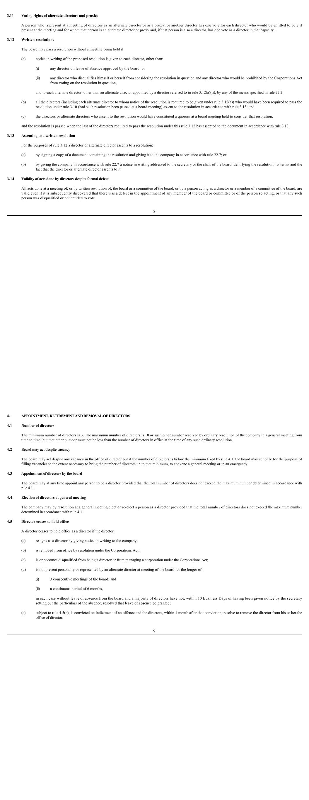 3.11 Voting rights of alternate directors and proxies A person who is present at a meeting of directors as an alternate director or as a proxy for another director has one vote for each director who would be entitled to vote if present at the meeting and for whom that person is an alternate director or proxy and, if that person is also a director, has one vote as a director in that capacity. 3.12 Written resolutions The board may pass a resolution without a meeting being held if: (a) notice in writing of the proposed resolution is given to each director, other than: (i) any director on leave of absence approved by the board; or (ii) any director who disqualifies himself or herself from considering the resolution in question and any director who would be prohibited by the Corporations Act from voting on the resolution in question, and to each alternate director, other than an alternate director appointed by a director referred to in rule 3.12(a)(ii), by any of the means specified in rule 22.2; (b) all the directors (including each alternate director to whom notice of the resolution is required to be given under rule 3.12(a)) who would have been required to pass the resolution under rule 3.10 (had such resolution been passed at a board meeting) assent to the resolution in accordance with rule 3.13; and (c) the directors or alternate directors who assent to the resolution would have constituted a quorum at a board meeting held to consider that resolution, and the resolution is passed when the last of the directors required to pass the resolution under this rule 3.12 has assented to the document in accordance with rule 3.13. 3.13 Assenting to a written resolution For the purposes of rule 3.12 a director or alternate director assents to a resolution: (a) by signing a copy of a document containing the resolution and giving it to the company in accordance with rule 22.7; or (b) by giving the company in accordance with rule 22.7 a notice in writing addressed to the secretary or the chair of the board identifying the resolution, its terms and the fact that the director or alternate director assents to it. 3.14 Validity of acts done by directors despite formal defect All acts done at a meeting of, or by written resolution of, the board or a committee of the board, or by a person acting as a director or a member of a committee of the board, are valid even if it is subsequently discovered that there was a defect in the appointment of any member of the board or committee or of the person so acting, or that any such person was disqualified or not entitled to vote. 8 4. APPOINTMENT, RETIREMENT AND REMOVAL OF DIRECTORS 4.1 Number of directors The minimum number of directors is 3. The maximum number of directors is 10 or such other number resolved by ordinary resolution of the company in a general meeting from time to time, but that other number must not be less than the number of directors in office at the time of any such ordinary resolution. 4.2 Board may act despite vacancy The board may act despite any vacancy in the office of director but if the number of directors is below the minimum fixed by rule 4.1, the board may act only for the purpose of filling vacancies to the extent necessary to bring the number of directors up to that minimum, to convene a general meeting or in an emergency. 4.3 Appointment of directors by the board The board may at any time appoint any person to be a director provided that the total number of directors does not exceed the maximum number determined in accordance with rule 4.1. 4.4 Election of directors at general meeting The company may by resolution at a general meeting elect or re-elect a person as a director provided that the total number of directors does not exceed the maximum number determined in accordance with rule 4.1. 4.5 Director ceases to hold office A director ceases to hold office as a director if the director: (a) resigns as a director by giving notice in writing to the company; (b) is removed from office by resolution under the Corporations Act; (c) is or becomes disqualified from being a director or from managing a corporation under the Corporations Act; (d) is not present personally or represented by an alternate director at meeting of the board for the longer of: (i) 3 consecutive meetings of the board; and (ii) a continuous period of 6 months, in each case without leave of absence from the board and a majority of directors have not, within 10 Business Days of having been given notice by the secretary setting out the particulars of the absence, resolved that leave of absence be granted; (e) subject to rule 4.5(c), is convicted on indictment of an offence and the directors, within 1 month after that conviction, resolve to remove the director from his or her the office of director; 9