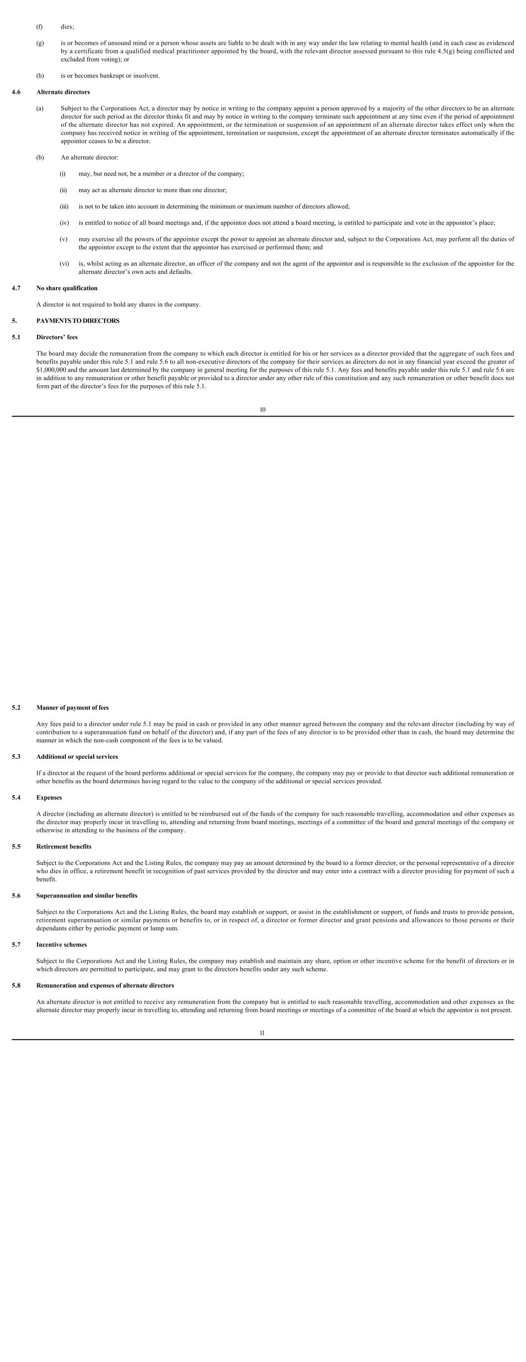 (f) dies; (g) is or becomes of unsound mind or a person whose assets are liable to be dealt with in any way under the law relating to mental health (and in each case as evidenced by a certificate from a qualified medical practitioner appointed by the board, with the relevant director assessed pursuant to this rule 4.5(g) being conflicted and excluded from voting); or (h) is or becomes bankrupt or insolvent. 4.6 Alternate directors (a) Subject to the Corporations Act, a director may by notice in writing to the company appoint a person approved by a majority of the other directors to be an alternate director for such period as the director thinks fit and may by notice in writing to the company terminate such appointment at any time even if the period of appointment of the alternate director has not expired. An appointment, or the termination or suspension of an appointment of an alternate director takes effect only when the company has received notice in writing of the appointment, termination or suspension, except the appointment of an alternate director terminates automatically if the appointor ceases to be a director. (b) An alternate director: (i) may, but need not, be a member or a director of the company; (ii) may act as alternate director to more than one director; (iii) is not to be taken into account in determining the minimum or maximum number of directors allowed; (iv) is entitled to notice of all board meetings and, if the appointor does not attend a board meeting, is entitled to participate and vote in the appointor’s place; (v) may exercise all the powers of the appointor except the power to appoint an alternate director and, subject to the Corporations Act, may perform all the duties of the appointor except to the extent that the appointor has exercised or performed them; and (vi) is, whilst acting as an alternate director, an officer of the company and not the agent of the appointor and is responsible to the exclusion of the appointor for the alternate director’s own acts and defaults. 4.7 No share qualification A director is not required to hold any shares in the company. 5. PAYMENTS TO DIRECTORS 5.1 Directors’ fees The board may decide the remuneration from the company to which each director is entitled for his or her services as a director provided that the aggregate of such fees and benefits payable under this rule 5.1 and rule 5.6 to all non-executive directors of the company for their services as directors do not in any financial year exceed the greater of $1,000,000 and the amount last determined by the company in general meeting for the purposes of this rule 5.1. Any fees and benefits payable under this rule 5.1 and rule 5.6 are in addition to any remuneration or other benefit payable or provided to a director under any other rule of this constitution and any such remuneration or other benefit does not form part of the director’s fees for the purposes of this rule 5.1. 10 5.2 Manner of payment of fees Any fees paid to a director under rule 5.1 may be paid in cash or provided in any other manner agreed between the company and the relevant director (including by way of contribution to a superannuation fund on behalf of the director) and, if any part of the fees of any director is to be provided other than in cash, the board may determine the manner in which the non-cash component of the fees is to be valued. 5.3 Additional or special services If a director at the request of the board performs additional or special services for the company, the company may pay or provide to that director such additional remuneration or other benefits as the board determines having regard to the value to the company of the additional or special services provided. 5.4 Expenses A director (including an alternate director) is entitled to be reimbursed out of the funds of the company for such reasonable travelling, accommodation and other expenses as the director may properly incur in travelling to, attending and returning from board meetings, meetings of a committee of the board and general meetings of the company or otherwise in attending to the business of the company. 5.5 Retirement benefits Subject to the Corporations Act and the Listing Rules, the company may pay an amount determined by the board to a former director, or the personal representative of a director who dies in office, a retirement benefit in recognition of past services provided by the director and may enter into a contract with a director providing for payment of such a benefit. 5.6 Superannuation and similar benefits Subject to the Corporations Act and the Listing Rules, the board may establish or support, or assist in the establishment or support, of funds and trusts to provide pension, retirement superannuation or similar payments or benefits to, or in respect of, a director or former director and grant pensions and allowances to those persons or their dependants either by periodic payment or lump sum. 5.7 Incentive schemes Subject to the Corporations Act and the Listing Rules, the company may establish and maintain any share, option or other incentive scheme for the benefit of directors or in which directors are permitted to participate, and may grant to the directors benefits under any such scheme. 5.8 Remuneration and expenses of alternate directors An alternate director is not entitled to receive any remuneration from the company but is entitled to such reasonable travelling, accommodation and other expenses as the alternate director may properly incur in travelling to, attending and returning from board meetings or meetings of a committee of the board at which the appointor is not present. 11