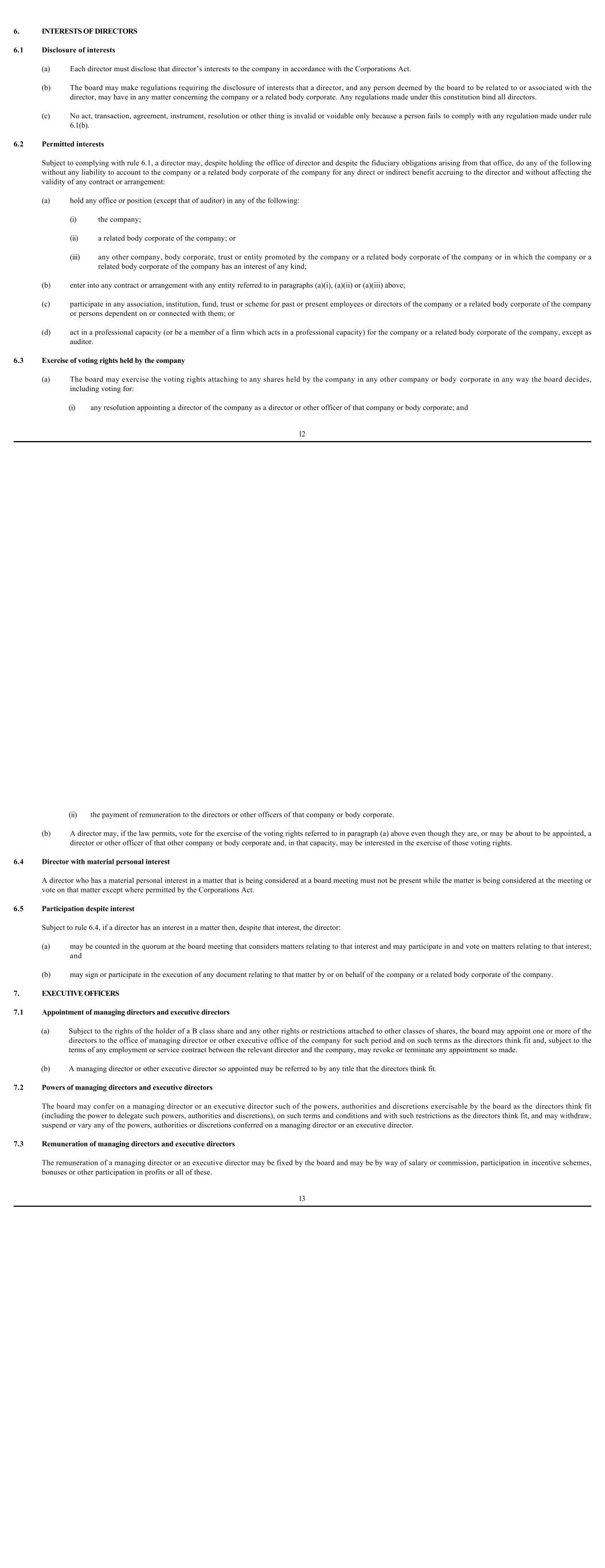 6. INTERESTS OF DIRECTORS 6.1 Disclosure of interests (a) Each director must disclose that director’s interests to the company in accordance with the Corporations Act. (b) The board may make regulations requiring the disclosure of interests that a director, and any person deemed by the board to be related to or associated with the director, may have in any matter concerning the company or a related body corporate. Any regulations made under this constitution bind all directors. (c) No act, transaction, agreement, instrument, resolution or other thing is invalid or voidable only because a person fails to comply with any regulation made under rule 6.1(b). 6.2 Permitted interests Subject to complying with rule 6.1, a director may, despite holding the office of director and despite the fiduciary obligations arising from that office, do any of the following without any liability to account to the company or a related body corporate of the company for any direct or indirect benefit accruing to the director and without affecting the validity of any contract or arrangement: (a) hold any office or position (except that of auditor) in any of the following: (i) the company; (ii) a related body corporate of the company; or (iii) any other company, body corporate, trust or entity promoted by the company or a related body corporate of the company or in which the company or a related body corporate of the company has an interest of any kind; (b) enter into any contract or arrangement with any entity referred to in paragraphs (a)(i), (a)(ii) or (a)(iii) above; (c) participate in any association, institution, fund, trust or scheme for past or present employees or directors of the company or a related body corporate of the company or persons dependent on or connected with them; or (d) act in a professional capacity (or be a member of a firm which acts in a professional capacity) for the company or a related body corporate of the company, except as auditor. 6.3 Exercise of voting rights held by the company (a) The board may exercise the voting rights attaching to any shares held by the company in any other company or body corporate in any way the board decides, including voting for: (i) any resolution appointing a director of the company as a director or other officer of that company or body corporate; and 12 (ii) the payment of remuneration to the directors or other officers of that company or body corporate. (b) A director may, if the law permits, vote for the exercise of the voting rights referred to in paragraph (a) above even though they are, or may be about to be appointed, a director or other officer of that other company or body corporate and, in that capacity, may be interested in the exercise of those voting rights. 6.4 Director with material personal interest A director who has a material personal interest in a matter that is being considered at a board meeting must not be present while the matter is being considered at the meeting or vote on that matter except where permitted by the Corporations Act. 6.5 Participation despite interest Subject to rule 6.4, if a director has an interest in a matter then, despite that interest, the director: (a) may be counted in the quorum at the board meeting that considers matters relating to that interest and may participate in and vote on matters relating to that interest; and (b) may sign or participate in the execution of any document relating to that matter by or on behalf of the company or a related body corporate of the company. 7. EXECUTIVE OFFICERS 7.1 Appointment of managing directors and executive directors (a) Subject to the rights of the holder of a B class share and any other rights or restrictions attached to other classes of shares, the board may appoint one or more of the directors to the office of managing director or other executive office of the company for such period and on such terms as the directors think fit and, subject to the terms of any employment or service contract between the relevant director and the company, may revoke or terminate any appointment so made. (b) A managing director or other executive director so appointed may be referred to by any title that the directors think fit. 7.2 Powers of managing directors and executive directors The board may confer on a managing director or an executive director such of the powers, authorities and discretions exercisable by the board as the directors think fit (including the power to delegate such powers, authorities and discretions), on such terms and conditions and with such restrictions as the directors think fit, and may withdraw, suspend or vary any of the powers, authorities or discretions conferred on a managing director or an executive director. 7.3 Remuneration of managing directors and executive directors The remuneration of a managing director or an executive director may be fixed by the board and may be by way of salary or commission, participation in incentive schemes, bonuses or other participation in profits or all of these. 13