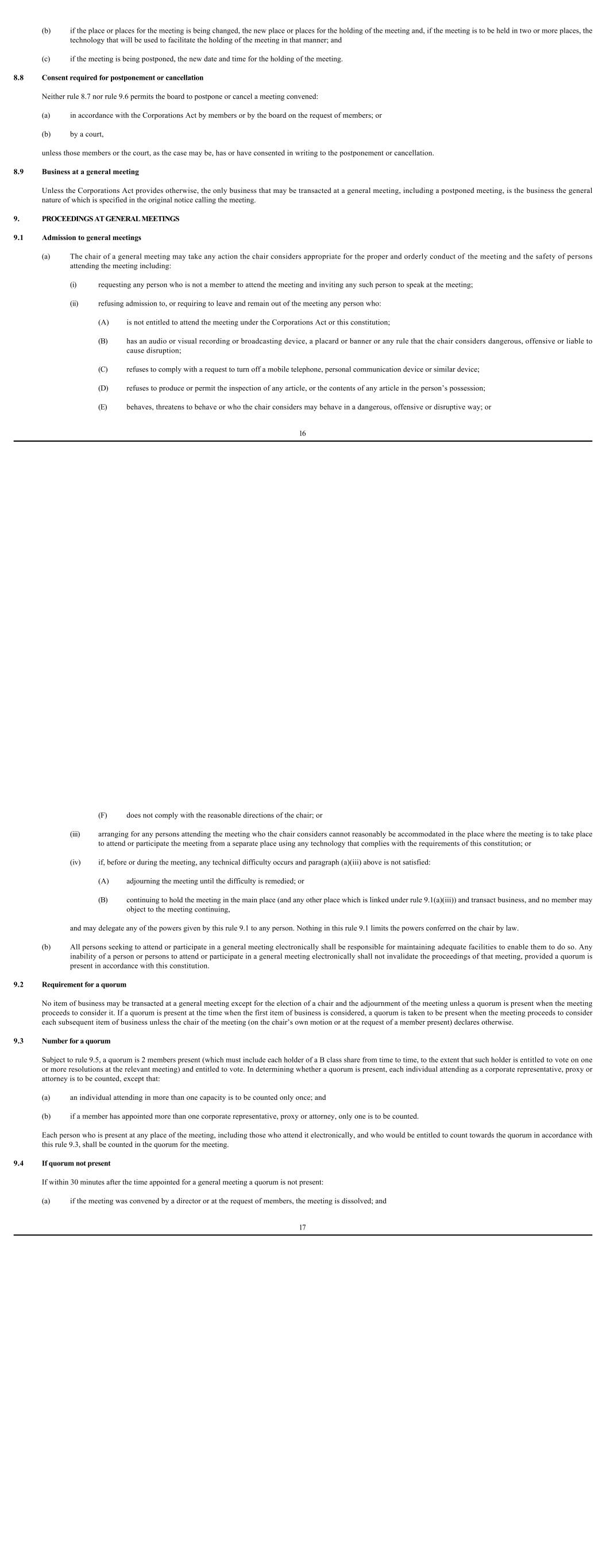 (b) if the place or places for the meeting is being changed, the new place or places for the holding of the meeting and, if the meeting is to be held in two or more places, the technology that will be used to facilitate the holding of the meeting in that manner; and (c) if the meeting is being postponed, the new date and time for the holding of the meeting. 8.8 Consent required for postponement or cancellation Neither rule 8.7 nor rule 9.6 permits the board to postpone or cancel a meeting convened: (a) in accordance with the Corporations Act by members or by the board on the request of members; or (b) by a court, unless those members or the court, as the case may be, has or have consented in writing to the postponement or cancellation. 8.9 Business at a general meeting Unless the Corporations Act provides otherwise, the only business that may be transacted at a general meeting, including a postponed meeting, is the business the general nature of which is specified in the original notice calling the meeting. 9. PROCEEDINGS AT GENERAL MEETINGS 9.1 Admission to general meetings (a) The chair of a general meeting may take any action the chair considers appropriate for the proper and orderly conduct of the meeting and the safety of persons attending the meeting including: (i) requesting any person who is not a member to attend the meeting and inviting any such person to speak at the meeting; (ii) refusing admission to, or requiring to leave and remain out of the meeting any person who: (A) is not entitled to attend the meeting under the Corporations Act or this constitution; (B) has an audio or visual recording or broadcasting device, a placard or banner or any rule that the chair considers dangerous, offensive or liable to cause disruption; (C) refuses to comply with a request to turn off a mobile telephone, personal communication device or similar device; (D) refuses to produce or permit the inspection of any article, or the contents of any article in the person’s possession; (E) behaves, threatens to behave or who the chair considers may behave in a dangerous, offensive or disruptive way; or 16 (F) does not comply with the reasonable directions of the chair; or (iii) arranging for any persons attending the meeting who the chair considers cannot reasonably be accommodated in the place where the meeting is to take place to attend or participate the meeting from a separate place using any technology that complies with the requirements of this constitution; or (iv) if, before or during the meeting, any technical difficulty occurs and paragraph (a)(iii) above is not satisfied: (A) adjourning the meeting until the difficulty is remedied; or (B) continuing to hold the meeting in the main place (and any other place which is linked under rule 9.1(a)(iii)) and transact business, and no member may object to the meeting continuing, and may delegate any of the powers given by this rule 9.1 to any person. Nothing in this rule 9.1 limits the powers conferred on the chair by law. (b) All persons seeking to attend or participate in a general meeting electronically shall be responsible for maintaining adequate facilities to enable them to do so. Any inability of a person or persons to attend or participate in a general meeting electronically shall not invalidate the proceedings of that meeting, provided a quorum is present in accordance with this constitution. 9.2 Requirement for a quorum No item of business may be transacted at a general meeting except for the election of a chair and the adjournment of the meeting unless a quorum is present when the meeting proceeds to consider it. If a quorum is present at the time when the first item of business is considered, a quorum is taken to be present when the meeting proceeds to consider each subsequent item of business unless the chair of the meeting (on the chair’s own motion or at the request of a member present) declares otherwise. 9.3 Number for a quorum Subject to rule 9.5, a quorum is 2 members present (which must include each holder of a B class share from time to time, to the extent that such holder is entitled to vote on one or more resolutions at the relevant meeting) and entitled to vote. In determining whether a quorum is present, each individual attending as a corporate representative, proxy or attorney is to be counted, except that: (a) an individual attending in more than one capacity is to be counted only once; and (b) if a member has appointed more than one corporate representative, proxy or attorney, only one is to be counted. Each person who is present at any place of the meeting, including those who attend it electronically, and who would be entitled to count towards the quorum in accordance with this rule 9.3, shall be counted in the quorum for the meeting. 9.4 If quorum not present If within 30 minutes after the time appointed for a general meeting a quorum is not present: (a) if the meeting was convened by a director or at the request of members, the meeting is dissolved; and 17