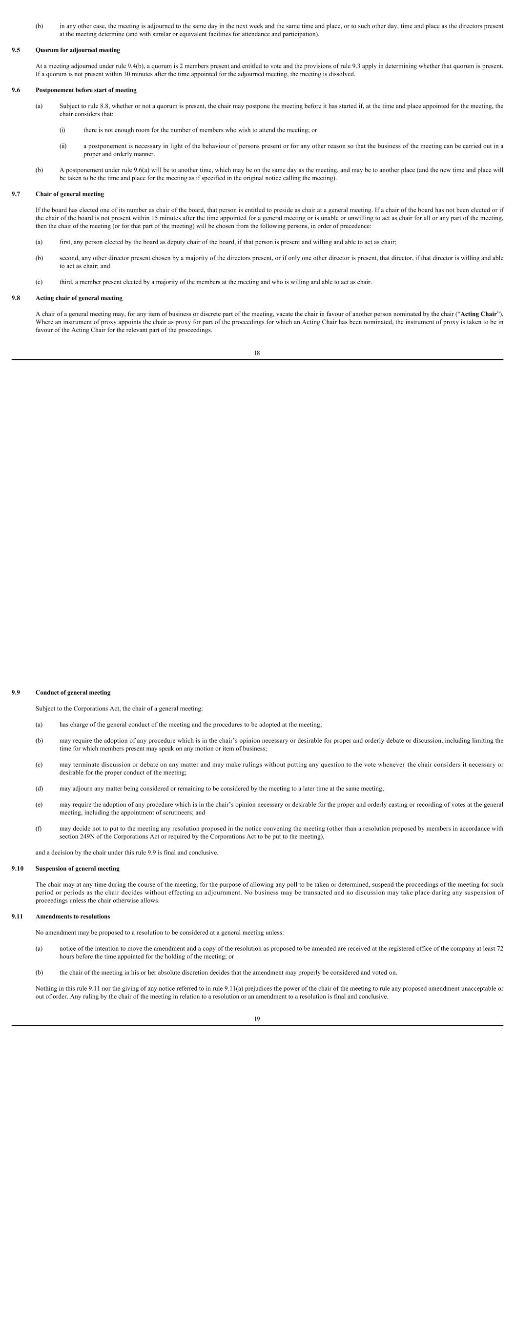 (b) in any other case, the meeting is adjourned to the same day in the next week and the same time and place, or to such other day, time and place as the directors present at the meeting determine (and with similar or equivalent facilities for attendance and participation). 9.5 Quorum for adjourned meeting At a meeting adjourned under rule 9.4(b), a quorum is 2 members present and entitled to vote and the provisions of rule 9.3 apply in determining whether that quorum is present. If a quorum is not present within 30 minutes after the time appointed for the adjourned meeting, the meeting is dissolved. 9.6 Postponement before start of meeting (a) Subject to rule 8.8, whether or not a quorum is present, the chair may postpone the meeting before it has started if, at the time and place appointed for the meeting, the chair considers that: (i) there is not enough room for the number of members who wish to attend the meeting; or (ii) a postponement is necessary in light of the behaviour of persons present or for any other reason so that the business of the meeting can be carried out in a proper and orderly manner. (b) A postponement under rule 9.6(a) will be to another time, which may be on the same day as the meeting, and may be to another place (and the new time and place will be taken to be the time and place for the meeting as if specified in the original notice calling the meeting). 9.7 Chair of general meeting If the board has elected one of its number as chair of the board, that person is entitled to preside as chair at a general meeting. If a chair of the board has not been elected or if the chair of the board is not present within 15 minutes after the time appointed for a general meeting or is unable or unwilling to act as chair for all or any part of the meeting, then the chair of the meeting (or for that part of the meeting) will be chosen from the following persons, in order of precedence: (a) first, any person elected by the board as deputy chair of the board, if that person is present and willing and able to act as chair; (b) second, any other director present chosen by a majority of the directors present, or if only one other director is present, that director, if that director is willing and able to act as chair; and (c) third, a member present elected by a majority of the members at the meeting and who is willing and able to act as chair. 9.8 Acting chair of general meeting A chair of a general meeting may, for any item of business or discrete part of the meeting, vacate the chair in favour of another person nominated by the chair (“Acting Chair”). Where an instrument of proxy appoints the chair as proxy for part of the proceedings for which an Acting Chair has been nominated, the instrument of proxy is taken to be in favour of the Acting Chair for the relevant part of the proceedings. 18 9.9 Conduct of general meeting Subject to the Corporations Act, the chair of a general meeting: (a) has charge of the general conduct of the meeting and the procedures to be adopted at the meeting; (b) may require the adoption of any procedure which is in the chair’s opinion necessary or desirable for proper and orderly debate or discussion, including limiting the time for which members present may speak on any motion or item of business; (c) may terminate discussion or debate on any matter and may make rulings without putting any question to the vote whenever the chair considers it necessary or desirable for the proper conduct of the meeting; (d) may adjourn any matter being considered or remaining to be considered by the meeting to a later time at the same meeting; (e) may require the adoption of any procedure which is in the chair’s opinion necessary or desirable for the proper and orderly casting or recording of votes at the general meeting, including the appointment of scrutineers; and (f) may decide not to put to the meeting any resolution proposed in the notice convening the meeting (other than a resolution proposed by members in accordance with section 249N of the Corporations Act or required by the Corporations Act to be put to the meeting), and a decision by the chair under this rule 9.9 is final and conclusive. 9.10 Suspension of general meeting The chair may at any time during the course of the meeting, for the purpose of allowing any poll to be taken or determined, suspend the proceedings of the meeting for such period or periods as the chair decides without effecting an adjournment. No business may be transacted and no discussion may take place during any suspension of proceedings unless the chair otherwise allows. 9.11 Amendments to resolutions No amendment may be proposed to a resolution to be considered at a general meeting unless: (a) notice of the intention to move the amendment and a copy of the resolution as proposed to be amended are received at the registered office of the company at least 72 hours before the time appointed for the holding of the meeting; or (b) the chair of the meeting in his or her absolute discretion decides that the amendment may properly be considered and voted on. Nothing in this rule 9.11 nor the giving of any notice referred to in rule 9.11(a) prejudices the power of the chair of the meeting to rule any proposed amendment unacceptable or out of order. Any ruling by the chair of the meeting in relation to a resolution or an amendment to a resolution is final and conclusive. 19