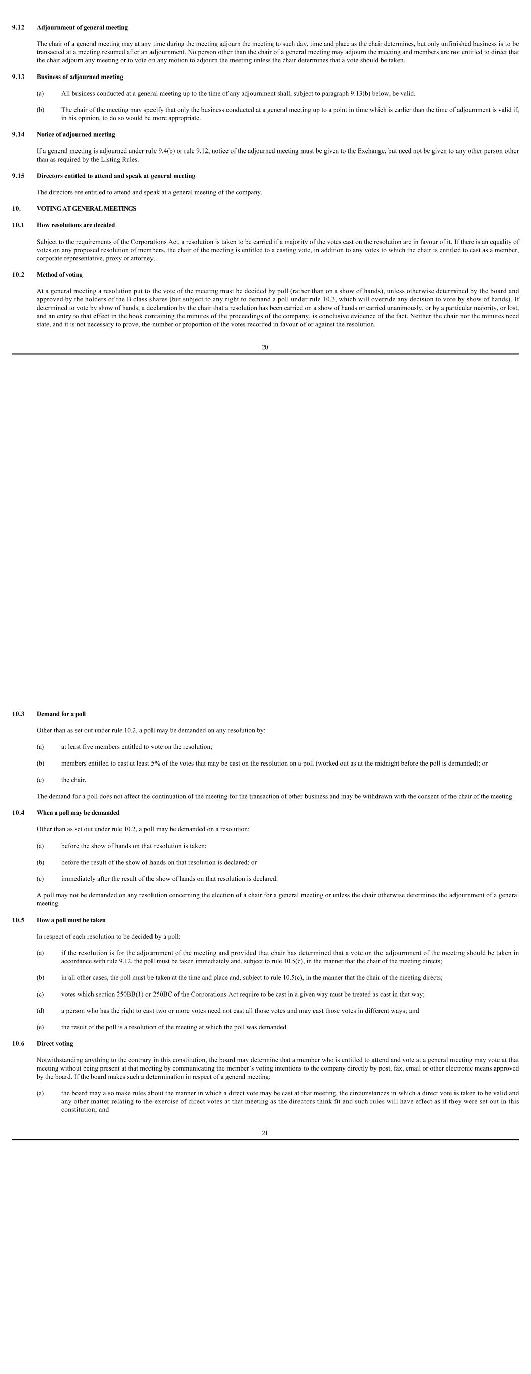 9.12 Adjournment of general meeting The chair of a general meeting may at any time during the meeting adjourn the meeting to such day, time and place as the chair determines, but only unfinished business is to be transacted at a meeting resumed after an adjournment. No person other than the chair of a general meeting may adjourn the meeting and members are not entitled to direct that the chair adjourn any meeting or to vote on any motion to adjourn the meeting unless the chair determines that a vote should be taken. 9.13 Business of adjourned meeting (a) All business conducted at a general meeting up to the time of any adjournment shall, subject to paragraph 9.13(b) below, be valid. (b) The chair of the meeting may specify that only the business conducted at a general meeting up to a point in time which is earlier than the time of adjournment is valid if, in his opinion, to do so would be more appropriate. 9.14 Notice of adjourned meeting If a general meeting is adjourned under rule 9.4(b) or rule 9.12, notice of the adjourned meeting must be given to the Exchange, but need not be given to any other person other than as required by the Listing Rules. 9.15 Directors entitled to attend and speak at general meeting The directors are entitled to attend and speak at a general meeting of the company. 10. VOTING AT GENERAL MEETINGS 10.1 How resolutions are decided Subject to the requirements of the Corporations Act, a resolution is taken to be carried if a majority of the votes cast on the resolution are in favour of it. If there is an equality of votes on any proposed resolution of members, the chair of the meeting is entitled to a casting vote, in addition to any votes to which the chair is entitled to cast as a member, corporate representative, proxy or attorney. 10.2 Method of voting At a general meeting a resolution put to the vote of the meeting must be decided by poll (rather than on a show of hands), unless otherwise determined by the board and approved by the holders of the B class shares (but subject to any right to demand a poll under rule 10.3, which will override any decision to vote by show of hands). If determined to vote by show of hands, a declaration by the chair that a resolution has been carried on a show of hands or carried unanimously, or by a particular majority, or lost, and an entry to that effect in the book containing the minutes of the proceedings of the company, is conclusive evidence of the fact. Neither the chair nor the minutes need state, and it is not necessary to prove, the number or proportion of the votes recorded in favour of or against the resolution. 20 10.3 Demand for a poll Other than as set out under rule 10.2, a poll may be demanded on any resolution by: (a) at least five members entitled to vote on the resolution; (b) members entitled to cast at least 5% of the votes that may be cast on the resolution on a poll (worked out as at the midnight before the poll is demanded); or (c) the chair. The demand for a poll does not affect the continuation of the meeting for the transaction of other business and may be withdrawn with the consent of the chair of the meeting. 10.4 When a poll may be demanded Other than as set out under rule 10.2, a poll may be demanded on a resolution: (a) before the show of hands on that resolution is taken; (b) before the result of the show of hands on that resolution is declared; or (c) immediately after the result of the show of hands on that resolution is declared. A poll may not be demanded on any resolution concerning the election of a chair for a general meeting or unless the chair otherwise determines the adjournment of a general meeting. 10.5 How a poll must be taken In respect of each resolution to be decided by a poll: (a) if the resolution is for the adjournment of the meeting and provided that chair has determined that a vote on the adjournment of the meeting should be taken in accordance with rule 9.12, the poll must be taken immediately and, subject to rule 10.5(c), in the manner that the chair of the meeting directs; (b) in all other cases, the poll must be taken at the time and place and, subject to rule 10.5(c), in the manner that the chair of the meeting directs; (c) votes which section 250BB(1) or 250BC of the Corporations Act require to be cast in a given way must be treated as cast in that way; (d) a person who has the right to cast two or more votes need not cast all those votes and may cast those votes in different ways; and (e) the result of the poll is a resolution of the meeting at which the poll was demanded. 10.6 Direct voting Notwithstanding anything to the contrary in this constitution, the board may determine that a member who is entitled to attend and vote at a general meeting may vote at that meeting without being present at that meeting by communicating the member’s voting intentions to the company directly by post, fax, email or other electronic means approved by the board. If the board makes such a determination in respect of a general meeting: (a) the board may also make rules about the manner in which a direct vote may be cast at that meeting, the circumstances in which a direct vote is taken to be valid and any other matter relating to the exercise of direct votes at that meeting as the directors think fit and such rules will have effect as if they were set out in this constitution; and 21
