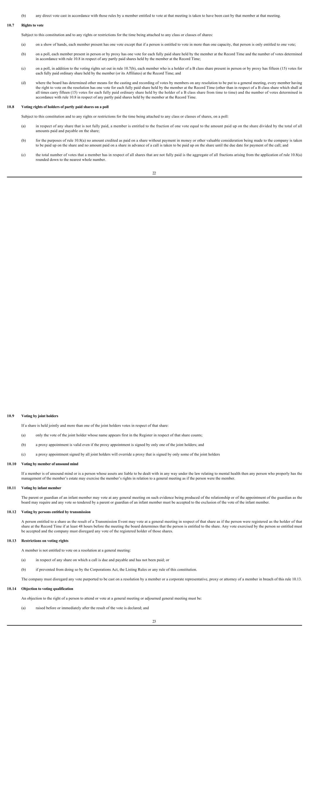 (b) any direct vote cast in accordance with those rules by a member entitled to vote at that meeting is taken to have been cast by that member at that meeting. 10.7 Rights to vote Subject to this constitution and to any rights or restrictions for the time being attached to any class or classes of shares: (a) on a show of hands, each member present has one vote except that if a person is entitled to vote in more than one capacity, that person is only entitled to one vote; (b) on a poll, each member present in person or by proxy has one vote for each fully paid share held by the member at the Record Time and the number of votes determined in accordance with rule 10.8 in respect of any partly paid shares held by the member at the Record Time; (c) on a poll, in addition to the voting rights set out in rule 10.7(b), each member who is a holder of a B class share present in person or by proxy has fifteen (15) votes for each fully paid ordinary share held by the member (or its Affiliates) at the Record Time; and (d) where the board has determined other means for the casting and recording of votes by members on any resolution to be put to a general meeting, every member having the right to vote on the resolution has one vote for each fully paid share held by the member at the Record Time (other than in respect of a B class share which shall at all times carry fifteen (15) votes for each fully paid ordinary share held by the holder of a B class share from time to time) and the number of votes determined in accordance with rule 10.8 in respect of any partly paid shares held by the member at the Record Time. 10.8 Voting rights of holders of partly paid shares on a poll Subject to this constitution and to any rights or restrictions for the time being attached to any class or classes of shares, on a poll: (a) in respect of any share that is not fully paid, a member is entitled to the fraction of one vote equal to the amount paid up on the share divided by the total of all amounts paid and payable on the share; (b) for the purposes of rule 10.8(a) no amount credited as paid on a share without payment in money or other valuable consideration being made to the company is taken to be paid up on the share and no amount paid on a share in advance of a call is taken to be paid up on the share until the due date for payment of the call; and (c) the total number of votes that a member has in respect of all shares that are not fully paid is the aggregate of all fractions arising from the application of rule 10.8(a) rounded down to the nearest whole number. 22 10.9 Voting by joint holders If a share is held jointly and more than one of the joint holders votes in respect of that share: (a) only the vote of the joint holder whose name appears first in the Register in respect of that share counts; (b) a proxy appointment is valid even if the proxy appointment is signed by only one of the joint holders; and (c) a proxy appointment signed by all joint holders will override a proxy that is signed by only some of the joint holders 10.10 Voting by member of unsound mind If a member is of unsound mind or is a person whose assets are liable to be dealt with in any way under the law relating to mental health then any person who properly has the management of the member’s estate may exercise the member’s rights in relation to a general meeting as if the person were the member. 10.11 Voting by infant member The parent or guardian of an infant member may vote at any general meeting on such evidence being produced of the relationship or of the appointment of the guardian as the board may require and any vote so tendered by a parent or guardian of an infant member must be accepted to the exclusion of the vote of the infant member. 10.12 Voting by persons entitled by transmission A person entitled to a share as the result of a Transmission Event may vote at a general meeting in respect of that share as if the person were registered as the holder of that share at the Record Time if at least 48 hours before the meeting the board determines that the person is entitled to the share. Any vote exercised by the person so entitled must be accepted and the company must disregard any vote of the registered holder of those shares. 10.13 Restrictions on voting rights A member is not entitled to vote on a resolution at a general meeting: (a) in respect of any share on which a call is due and payable and has not been paid; or (b) if prevented from doing so by the Corporations Act, the Listing Rules or any rule of this constitution. The company must disregard any vote purported to be cast on a resolution by a member or a corporate representative, proxy or attorney of a member in breach of this rule 10.13. 10.14 Objection to voting qualification An objection to the right of a person to attend or vote at a general meeting or adjourned general meeting must be: (a) raised before or immediately after the result of the vote is declared; and 23