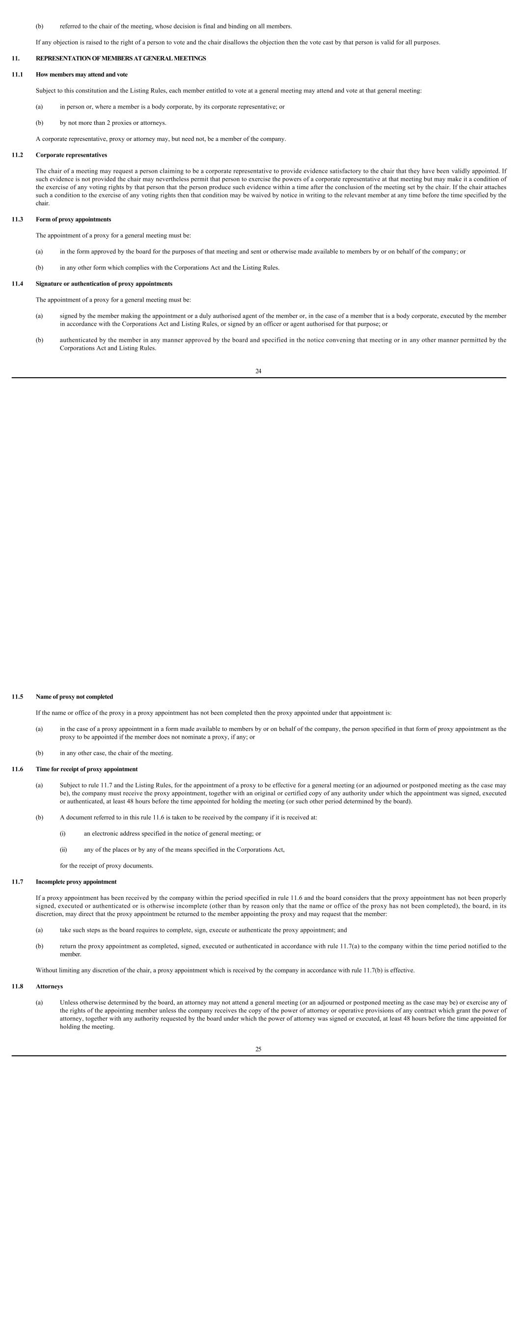 (b) referred to the chair of the meeting, whose decision is final and binding on all members. If any objection is raised to the right of a person to vote and the chair disallows the objection then the vote cast by that person is valid for all purposes. 11. REPRESENTATION OF MEMBERS AT GENERAL MEETINGS 11.1 How members may attend and vote Subject to this constitution and the Listing Rules, each member entitled to vote at a general meeting may attend and vote at that general meeting: (a) in person or, where a member is a body corporate, by its corporate representative; or (b) by not more than 2 proxies or attorneys. A corporate representative, proxy or attorney may, but need not, be a member of the company. 11.2 Corporate representatives The chair of a meeting may request a person claiming to be a corporate representative to provide evidence satisfactory to the chair that they have been validly appointed. If such evidence is not provided the chair may nevertheless permit that person to exercise the powers of a corporate representative at that meeting but may make it a condition of the exercise of any voting rights by that person that the person produce such evidence within a time after the conclusion of the meeting set by the chair. If the chair attaches such a condition to the exercise of any voting rights then that condition may be waived by notice in writing to the relevant member at any time before the time specified by the chair. 11.3 Form of proxy appointments The appointment of a proxy for a general meeting must be: (a) in the form approved by the board for the purposes of that meeting and sent or otherwise made available to members by or on behalf of the company; or (b) in any other form which complies with the Corporations Act and the Listing Rules. 11.4 Signature or authentication of proxy appointments The appointment of a proxy for a general meeting must be: (a) signed by the member making the appointment or a duly authorised agent of the member or, in the case of a member that is a body corporate, executed by the member in accordance with the Corporations Act and Listing Rules, or signed by an officer or agent authorised for that purpose; or (b) authenticated by the member in any manner approved by the board and specified in the notice convening that meeting or in any other manner permitted by the Corporations Act and Listing Rules. 24 11.5 Name of proxy not completed If the name or office of the proxy in a proxy appointment has not been completed then the proxy appointed under that appointment is: (a) in the case of a proxy appointment in a form made available to members by or on behalf of the company, the person specified in that form of proxy appointment as the proxy to be appointed if the member does not nominate a proxy, if any; or (b) in any other case, the chair of the meeting. 11.6 Time for receipt of proxy appointment (a) Subject to rule 11.7 and the Listing Rules, for the appointment of a proxy to be effective for a general meeting (or an adjourned or postponed meeting as the case may be), the company must receive the proxy appointment, together with an original or certified copy of any authority under which the appointment was signed, executed or authenticated, at least 48 hours before the time appointed for holding the meeting (or such other period determined by the board). (b) A document referred to in this rule 11.6 is taken to be received by the company if it is received at: (i) an electronic address specified in the notice of general meeting; or (ii) any of the places or by any of the means specified in the Corporations Act, for the receipt of proxy documents. 11.7 Incomplete proxy appointment If a proxy appointment has been received by the company within the period specified in rule 11.6 and the board considers that the proxy appointment has not been properly signed, executed or authenticated or is otherwise incomplete (other than by reason only that the name or office of the proxy has not been completed), the board, in its discretion, may direct that the proxy appointment be returned to the member appointing the proxy and may request that the member: (a) take such steps as the board requires to complete, sign, execute or authenticate the proxy appointment; and (b) return the proxy appointment as completed, signed, executed or authenticated in accordance with rule 11.7(a) to the company within the time period notified to the member. Without limiting any discretion of the chair, a proxy appointment which is received by the company in accordance with rule 11.7(b) is effective. 11.8 Attorneys (a) Unless otherwise determined by the board, an attorney may not attend a general meeting (or an adjourned or postponed meeting as the case may be) or exercise any of the rights of the appointing member unless the company receives the copy of the power of attorney or operative provisions of any contract which grant the power of attorney, together with any authority requested by the board under which the power of attorney was signed or executed, at least 48 hours before the time appointed for holding the meeting. 25