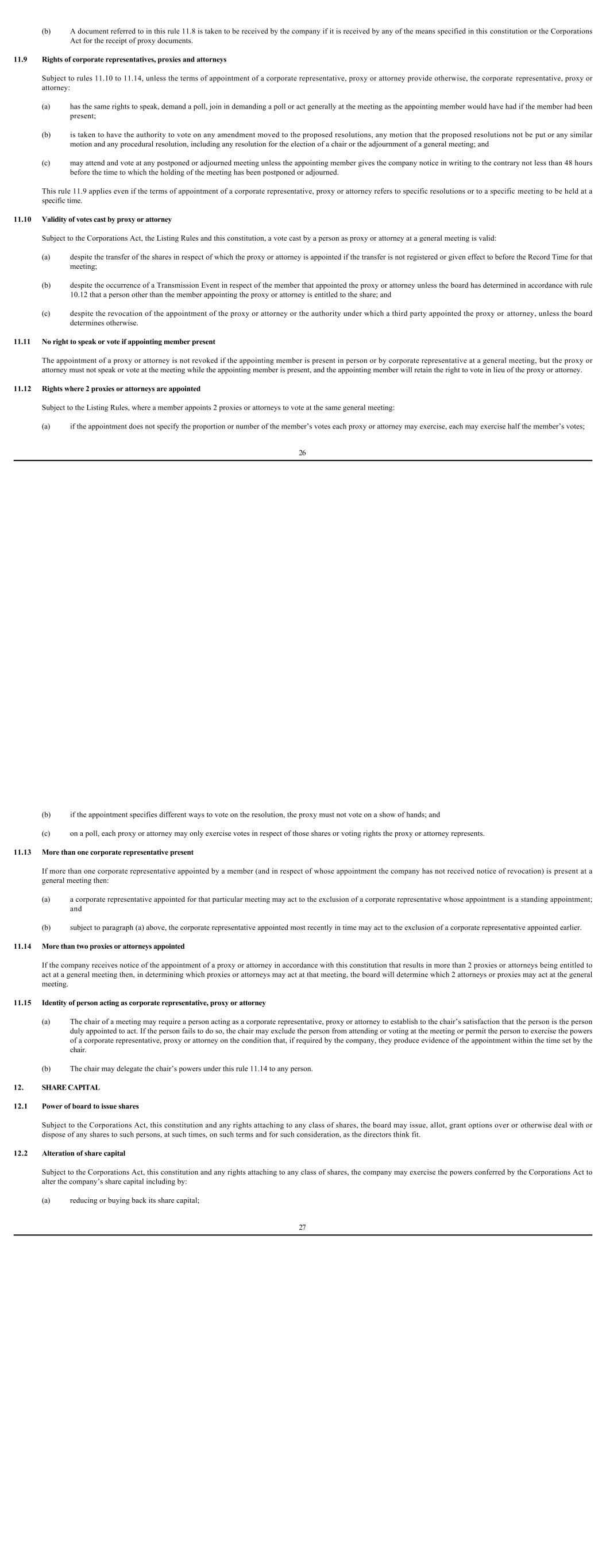 (b) A document referred to in this rule 11.8 is taken to be received by the company if it is received by any of the means specified in this constitution or the Corporations Act for the receipt of proxy documents. 11.9 Rights of corporate representatives, proxies and attorneys Subject to rules 11.10 to 11.14, unless the terms of appointment of a corporate representative, proxy or attorney provide otherwise, the corporate representative, proxy or attorney: (a) has the same rights to speak, demand a poll, join in demanding a poll or act generally at the meeting as the appointing member would have had if the member had been present; (b) is taken to have the authority to vote on any amendment moved to the proposed resolutions, any motion that the proposed resolutions not be put or any similar motion and any procedural resolution, including any resolution for the election of a chair or the adjournment of a general meeting; and (c) may attend and vote at any postponed or adjourned meeting unless the appointing member gives the company notice in writing to the contrary not less than 48 hours before the time to which the holding of the meeting has been postponed or adjourned. This rule 11.9 applies even if the terms of appointment of a corporate representative, proxy or attorney refers to specific resolutions or to a specific meeting to be held at a specific time. 11.10 Validity of votes cast by proxy or attorney Subject to the Corporations Act, the Listing Rules and this constitution, a vote cast by a person as proxy or attorney at a general meeting is valid: (a) despite the transfer of the shares in respect of which the proxy or attorney is appointed if the transfer is not registered or given effect to before the Record Time for that meeting; (b) despite the occurrence of a Transmission Event in respect of the member that appointed the proxy or attorney unless the board has determined in accordance with rule 10.12 that a person other than the member appointing the proxy or attorney is entitled to the share; and (c) despite the revocation of the appointment of the proxy or attorney or the authority under which a third party appointed the proxy or attorney, unless the board determines otherwise. 11.11 No right to speak or vote if appointing member present The appointment of a proxy or attorney is not revoked if the appointing member is present in person or by corporate representative at a general meeting, but the proxy or attorney must not speak or vote at the meeting while the appointing member is present, and the appointing member will retain the right to vote in lieu of the proxy or attorney. 11.12 Rights where 2 proxies or attorneys are appointed Subject to the Listing Rules, where a member appoints 2 proxies or attorneys to vote at the same general meeting: (a) if the appointment does not specify the proportion or number of the member’s votes each proxy or attorney may exercise, each may exercise half the member’s votes; 26 (b) if the appointment specifies different ways to vote on the resolution, the proxy must not vote on a show of hands; and (c) on a poll, each proxy or attorney may only exercise votes in respect of those shares or voting rights the proxy or attorney represents. 11.13 More than one corporate representative present If more than one corporate representative appointed by a member (and in respect of whose appointment the company has not received notice of revocation) is present at a general meeting then: (a) a corporate representative appointed for that particular meeting may act to the exclusion of a corporate representative whose appointment is a standing appointment; and (b) subject to paragraph (a) above, the corporate representative appointed most recently in time may act to the exclusion of a corporate representative appointed earlier. 11.14 More than two proxies or attorneys appointed If the company receives notice of the appointment of a proxy or attorney in accordance with this constitution that results in more than 2 proxies or attorneys being entitled to act at a general meeting then, in determining which proxies or attorneys may act at that meeting, the board will determine which 2 attorneys or proxies may act at the general meeting. 11.15 Identity of person acting as corporate representative, proxy or attorney (a) The chair of a meeting may require a person acting as a corporate representative, proxy or attorney to establish to the chair’s satisfaction that the person is the person duly appointed to act. If the person fails to do so, the chair may exclude the person from attending or voting at the meeting or permit the person to exercise the powers of a corporate representative, proxy or attorney on the condition that, if required by the company, they produce evidence of the appointment within the time set by the chair. (b) The chair may delegate the chair’s powers under this rule 11.14 to any person. 12. SHARE CAPITAL 12.1 Power of board to issue shares Subject to the Corporations Act, this constitution and any rights attaching to any class of shares, the board may issue, allot, grant options over or otherwise deal with or dispose of any shares to such persons, at such times, on such terms and for such consideration, as the directors think fit. 12.2 Alteration of share capital Subject to the Corporations Act, this constitution and any rights attaching to any class of shares, the company may exercise the powers conferred by the Corporations Act to alter the company’s share capital including by: (a) reducing or buying back its share capital; 27