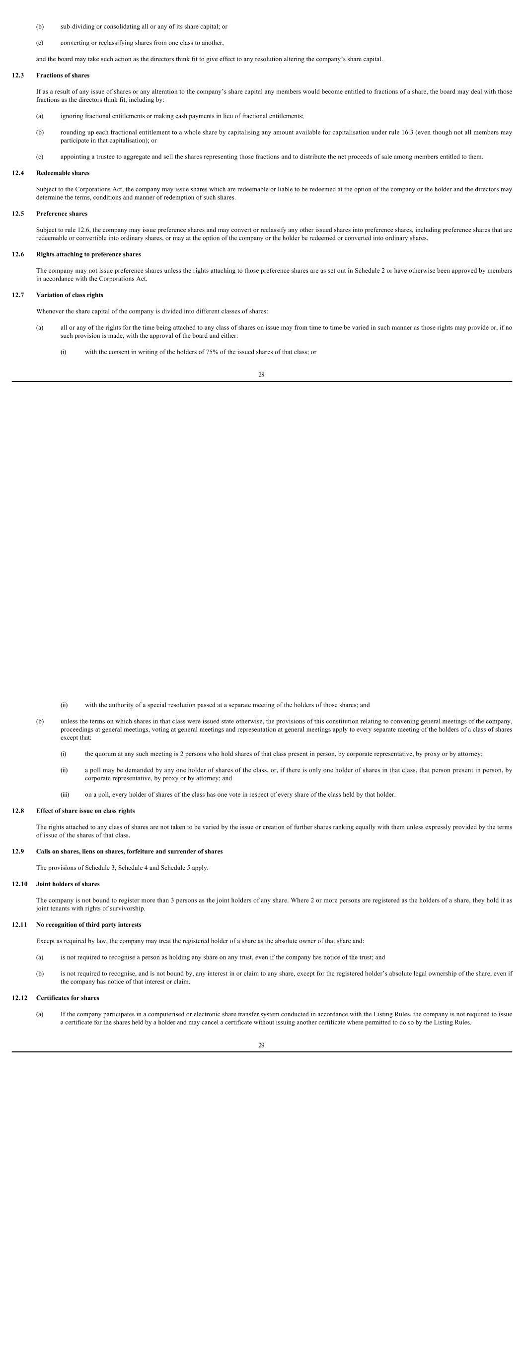 (b) sub-dividing or consolidating all or any of its share capital; or (c) converting or reclassifying shares from one class to another, and the board may take such action as the directors think fit to give effect to any resolution altering the company’s share capital. 12.3 Fractions of shares If as a result of any issue of shares or any alteration to the company’s share capital any members would become entitled to fractions of a share, the board may deal with those fractions as the directors think fit, including by: (a) ignoring fractional entitlements or making cash payments in lieu of fractional entitlements; (b) rounding up each fractional entitlement to a whole share by capitalising any amount available for capitalisation under rule 16.3 (even though not all members may participate in that capitalisation); or (c) appointing a trustee to aggregate and sell the shares representing those fractions and to distribute the net proceeds of sale among members entitled to them. 12.4 Redeemable shares Subject to the Corporations Act, the company may issue shares which are redeemable or liable to be redeemed at the option of the company or the holder and the directors may determine the terms, conditions and manner of redemption of such shares. 12.5 Preference shares Subject to rule 12.6, the company may issue preference shares and may convert or reclassify any other issued shares into preference shares, including preference shares that are redeemable or convertible into ordinary shares, or may at the option of the company or the holder be redeemed or converted into ordinary shares. 12.6 Rights attaching to preference shares The company may not issue preference shares unless the rights attaching to those preference shares are as set out in Schedule 2 or have otherwise been approved by members in accordance with the Corporations Act. 12.7 Variation of class rights Whenever the share capital of the company is divided into different classes of shares: (a) all or any of the rights for the time being attached to any class of shares on issue may from time to time be varied in such manner as those rights may provide or, if no such provision is made, with the approval of the board and either: (i) with the consent in writing of the holders of 75% of the issued shares of that class; or 28 (ii) with the authority of a special resolution passed at a separate meeting of the holders of those shares; and (b) unless the terms on which shares in that class were issued state otherwise, the provisions of this constitution relating to convening general meetings of the company, proceedings at general meetings, voting at general meetings and representation at general meetings apply to every separate meeting of the holders of a class of shares except that: (i) the quorum at any such meeting is 2 persons who hold shares of that class present in person, by corporate representative, by proxy or by attorney; (ii) a poll may be demanded by any one holder of shares of the class, or, if there is only one holder of shares in that class, that person present in person, by corporate representative, by proxy or by attorney; and (iii) on a poll, every holder of shares of the class has one vote in respect of every share of the class held by that holder. 12.8 Effect of share issue on class rights The rights attached to any class of shares are not taken to be varied by the issue or creation of further shares ranking equally with them unless expressly provided by the terms of issue of the shares of that class. 12.9 Calls on shares, liens on shares, forfeiture and surrender of shares The provisions of Schedule 3, Schedule 4 and Schedule 5 apply. 12.10 Joint holders of shares The company is not bound to register more than 3 persons as the joint holders of any share. Where 2 or more persons are registered as the holders of a share, they hold it as joint tenants with rights of survivorship. 12.11 No recognition of third party interests Except as required by law, the company may treat the registered holder of a share as the absolute owner of that share and: (a) is not required to recognise a person as holding any share on any trust, even if the company has notice of the trust; and (b) is not required to recognise, and is not bound by, any interest in or claim to any share, except for the registered holder’s absolute legal ownership of the share, even if the company has notice of that interest or claim. 12.12 Certificates for shares (a) If the company participates in a computerised or electronic share transfer system conducted in accordance with the Listing Rules, the company is not required to issue a certificate for the shares held by a holder and may cancel a certificate without issuing another certificate where permitted to do so by the Listing Rules. 29