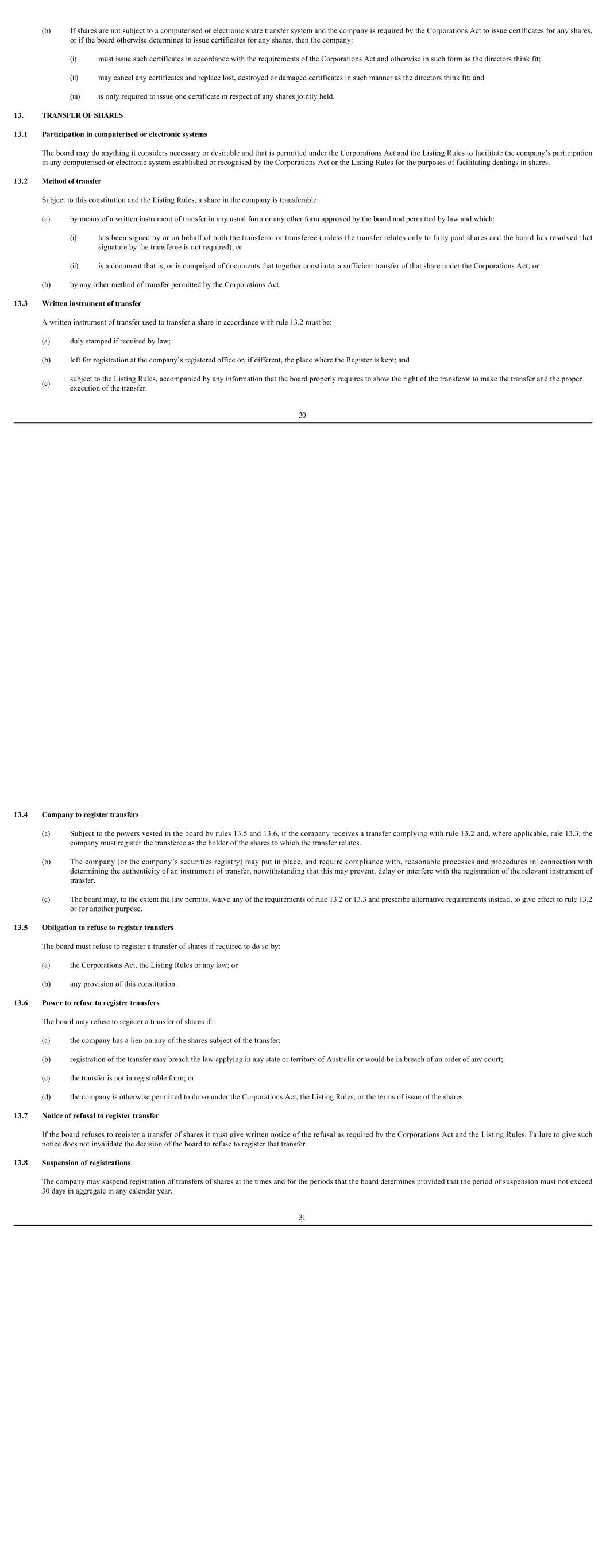 (b) If shares are not subject to a computerised or electronic share transfer system and the company is required by the Corporations Act to issue certificates for any shares, or if the board otherwise determines to issue certificates for any shares, then the company: (i) must issue such certificates in accordance with the requirements of the Corporations Act and otherwise in such form as the directors think fit; (ii) may cancel any certificates and replace lost, destroyed or damaged certificates in such manner as the directors think fit; and (iii) is only required to issue one certificate in respect of any shares jointly held. 13. TRANSFER OF SHARES 13.1 Participation in computerised or electronic systems The board may do anything it considers necessary or desirable and that is permitted under the Corporations Act and the Listing Rules to facilitate the company’s participation in any computerised or electronic system established or recognised by the Corporations Act or the Listing Rules for the purposes of facilitating dealings in shares. 13.2 Method of transfer Subject to this constitution and the Listing Rules, a share in the company is transferable: (a) by means of a written instrument of transfer in any usual form or any other form approved by the board and permitted by law and which: (i) has been signed by or on behalf of both the transferor or transferee (unless the transfer relates only to fully paid shares and the board has resolved that signature by the transferee is not required); or (ii) is a document that is, or is comprised of documents that together constitute, a sufficient transfer of that share under the Corporations Act; or (b) by any other method of transfer permitted by the Corporations Act. 13.3 Written instrument of transfer A written instrument of transfer used to transfer a share in accordance with rule 13.2 must be: (a) duly stamped if required by law; (b) left for registration at the company’s registered office or, if different, the place where the Register is kept; and (c) subject to the Listing Rules, accompanied by any information that the board properly requires to show the right of the transferor to make the transfer and the proper execution of the transfer. 30 13.4 Company to register transfers (a) Subject to the powers vested in the board by rules 13.5 and 13.6, if the company receives a transfer complying with rule 13.2 and, where applicable, rule 13.3, the company must register the transferee as the holder of the shares to which the transfer relates. (b) The company (or the company’s securities registry) may put in place, and require compliance with, reasonable processes and procedures in connection with determining the authenticity of an instrument of transfer, notwithstanding that this may prevent, delay or interfere with the registration of the relevant instrument of transfer. (c) The board may, to the extent the law permits, waive any of the requirements of rule 13.2 or 13.3 and prescribe alternative requirements instead, to give effect to rule 13.2 or for another purpose. 13.5 Obligation to refuse to register transfers The board must refuse to register a transfer of shares if required to do so by: (a) the Corporations Act, the Listing Rules or any law; or (b) any provision of this constitution. 13.6 Power to refuse to register transfers The board may refuse to register a transfer of shares if: (a) the company has a lien on any of the shares subject of the transfer; (b) registration of the transfer may breach the law applying in any state or territory of Australia or would be in breach of an order of any court; (c) the transfer is not in registrable form; or (d) the company is otherwise permitted to do so under the Corporations Act, the Listing Rules, or the terms of issue of the shares. 13.7 Notice of refusal to register transfer If the board refuses to register a transfer of shares it must give written notice of the refusal as required by the Corporations Act and the Listing Rules. Failure to give such notice does not invalidate the decision of the board to refuse to register that transfer. 13.8 Suspension of registrations The company may suspend registration of transfers of shares at the times and for the periods that the board determines provided that the period of suspension must not exceed 30 days in aggregate in any calendar year. 31