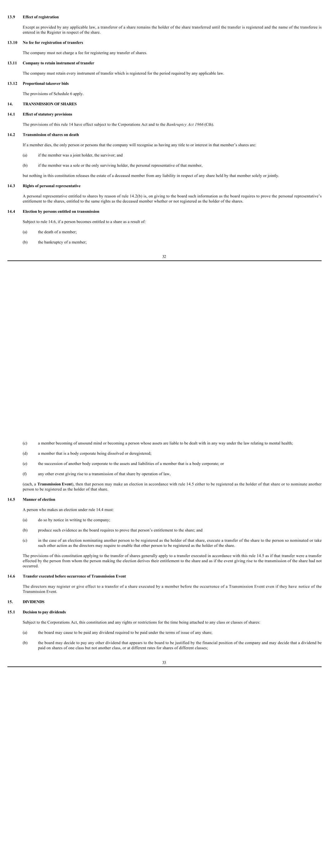 13.9 Effect of registration Except as provided by any applicable law, a transferor of a share remains the holder of the share transferred until the transfer is registered and the name of the transferee is entered in the Register in respect of the share. 13.10 No fee for registration of transfers The company must not charge a fee for registering any transfer of shares. 13.11 Company to retain instrument of transfer The company must retain every instrument of transfer which is registered for the period required by any applicable law. 13.12 Proportional takeover bids The provisions of Schedule 6 apply. 14. TRANSMISSION OF SHARES 14.1 Effect of statutory provisions The provisions of this rule 14 have effect subject to the Corporations Act and to the Bankruptcy Act 1966 (Cth). 14.2 Transmission of shares on death If a member dies, the only person or persons that the company will recognise as having any title to or interest in that member’s shares are: (a) if the member was a joint holder, the survivor; and (b) if the member was a sole or the only surviving holder, the personal representative of that member, but nothing in this constitution releases the estate of a deceased member from any liability in respect of any share held by that member solely or jointly. 14.3 Rights of personal representative A personal representative entitled to shares by reason of rule 14.2(b) is, on giving to the board such information as the board requires to prove the personal representative’s entitlement to the shares, entitled to the same rights as the deceased member whether or not registered as the holder of the shares. 14.4 Election by persons entitled on transmission Subject to rule 14.6, if a person becomes entitled to a share as a result of: (a) the death of a member; (b) the bankruptcy of a member; 32 (c) a member becoming of unsound mind or becoming a person whose assets are liable to be dealt with in any way under the law relating to mental health; (d) a member that is a body corporate being dissolved or deregistered; (e) the succession of another body corporate to the assets and liabilities of a member that is a body corporate; or (f) any other event giving rise to a transmission of that share by operation of law, (each, a Transmission Event), then that person may make an election in accordance with rule 14.5 either to be registered as the holder of that share or to nominate another person to be registered as the holder of that share. 14.5 Manner of election A person who makes an election under rule 14.4 must: (a) do so by notice in writing to the company; (b) produce such evidence as the board requires to prove that person’s entitlement to the share; and (c) in the case of an election nominating another person to be registered as the holder of that share, execute a transfer of the share to the person so nominated or take such other action as the directors may require to enable that other person to be registered as the holder of the share. The provisions of this constitution applying to the transfer of shares generally apply to a transfer executed in accordance with this rule 14.5 as if that transfer were a transfer effected by the person from whom the person making the election derives their entitlement to the share and as if the event giving rise to the transmission of the share had not occurred. 14.6 Transfer executed before occurrence of Transmission Event The directors may register or give effect to a transfer of a share executed by a member before the occurrence of a Transmission Event even if they have notice of the Transmission Event. 15. DIVIDENDS 15.1 Decision to pay dividends Subject to the Corporations Act, this constitution and any rights or restrictions for the time being attached to any class or classes of shares: (a) the board may cause to be paid any dividend required to be paid under the terms of issue of any share; (b) the board may decide to pay any other dividend that appears to the board to be justified by the financial position of the company and may decide that a dividend be paid on shares of one class but not another class, or at different rates for shares of different classes; 33