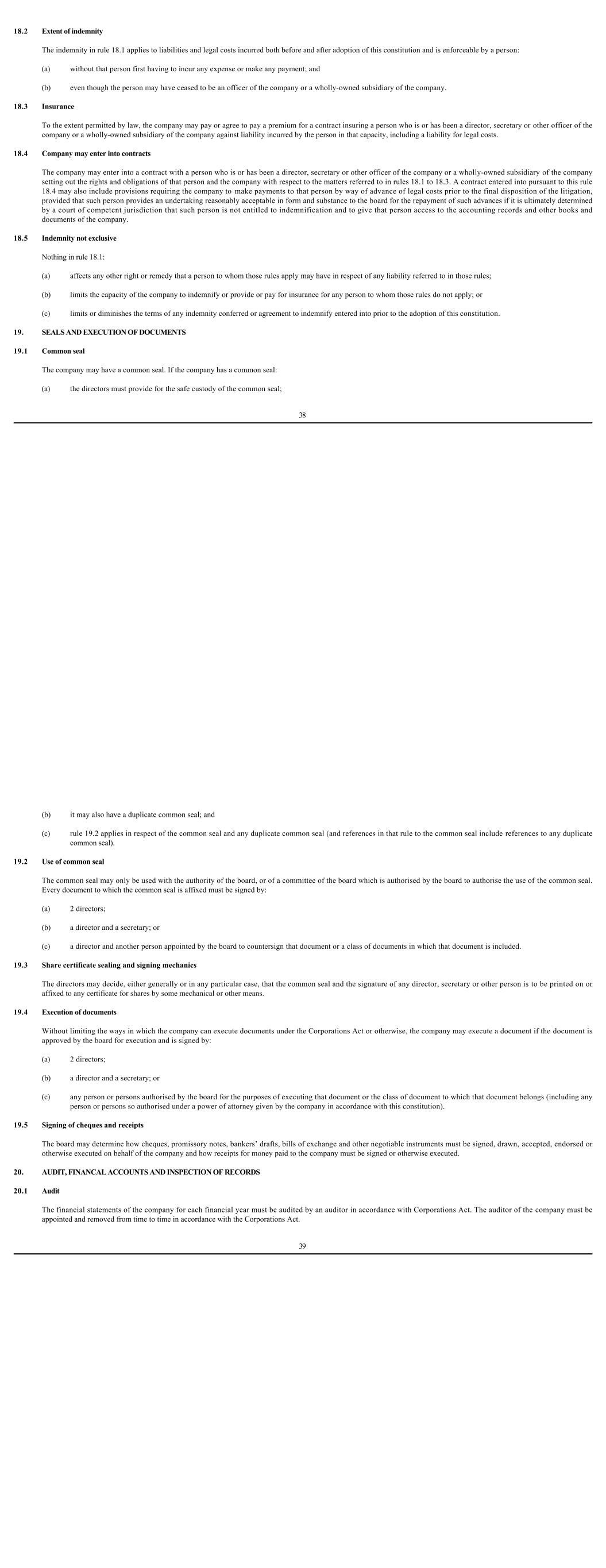 18.2 Extent of indemnity The indemnity in rule 18.1 applies to liabilities and legal costs incurred both before and after adoption of this constitution and is enforceable by a person: (a) without that person first having to incur any expense or make any payment; and (b) even though the person may have ceased to be an officer of the company or a wholly-owned subsidiary of the company. 18.3 Insurance To the extent permitted by law, the company may pay or agree to pay a premium for a contract insuring a person who is or has been a director, secretary or other officer of the company or a wholly-owned subsidiary of the company against liability incurred by the person in that capacity, including a liability for legal costs. 18.4 Company may enter into contracts The company may enter into a contract with a person who is or has been a director, secretary or other officer of the company or a wholly-owned subsidiary of the company setting out the rights and obligations of that person and the company with respect to the matters referred to in rules 18.1 to 18.3. A contract entered into pursuant to this rule 18.4 may also include provisions requiring the company to make payments to that person by way of advance of legal costs prior to the final disposition of the litigation, provided that such person provides an undertaking reasonably acceptable in form and substance to the board for the repayment of such advances if it is ultimately determined by a court of competent jurisdiction that such person is not entitled to indemnification and to give that person access to the accounting records and other books and documents of the company. 18.5 Indemnity not exclusive Nothing in rule 18.1: (a) affects any other right or remedy that a person to whom those rules apply may have in respect of any liability referred to in those rules; (b) limits the capacity of the company to indemnify or provide or pay for insurance for any person to whom those rules do not apply; or (c) limits or diminishes the terms of any indemnity conferred or agreement to indemnify entered into prior to the adoption of this constitution. 19. SEALS AND EXECUTION OF DOCUMENTS 19.1 Common seal The company may have a common seal. If the company has a common seal: (a) the directors must provide for the safe custody of the common seal; 38 (b) it may also have a duplicate common seal; and (c) rule 19.2 applies in respect of the common seal and any duplicate common seal (and references in that rule to the common seal include references to any duplicate common seal). 19.2 Use of common seal The common seal may only be used with the authority of the board, or of a committee of the board which is authorised by the board to authorise the use of the common seal. Every document to which the common seal is affixed must be signed by: (a) 2 directors; (b) a director and a secretary; or (c) a director and another person appointed by the board to countersign that document or a class of documents in which that document is included. 19.3 Share certificate sealing and signing mechanics The directors may decide, either generally or in any particular case, that the common seal and the signature of any director, secretary or other person is to be printed on or affixed to any certificate for shares by some mechanical or other means. 19.4 Execution of documents Without limiting the ways in which the company can execute documents under the Corporations Act or otherwise, the company may execute a document if the document is approved by the board for execution and is signed by: (a) 2 directors; (b) a director and a secretary; or (c) any person or persons authorised by the board for the purposes of executing that document or the class of document to which that document belongs (including any person or persons so authorised under a power of attorney given by the company in accordance with this constitution). 19.5 Signing of cheques and receipts The board may determine how cheques, promissory notes, bankers’ drafts, bills of exchange and other negotiable instruments must be signed, drawn, accepted, endorsed or otherwise executed on behalf of the company and how receipts for money paid to the company must be signed or otherwise executed. 20. AUDIT, FINANCAL ACCOUNTS AND INSPECTION OF RECORDS 20.1 Audit The financial statements of the company for each financial year must be audited by an auditor in accordance with Corporations Act. The auditor of the company must be appointed and removed from time to time in accordance with the Corporations Act. 39