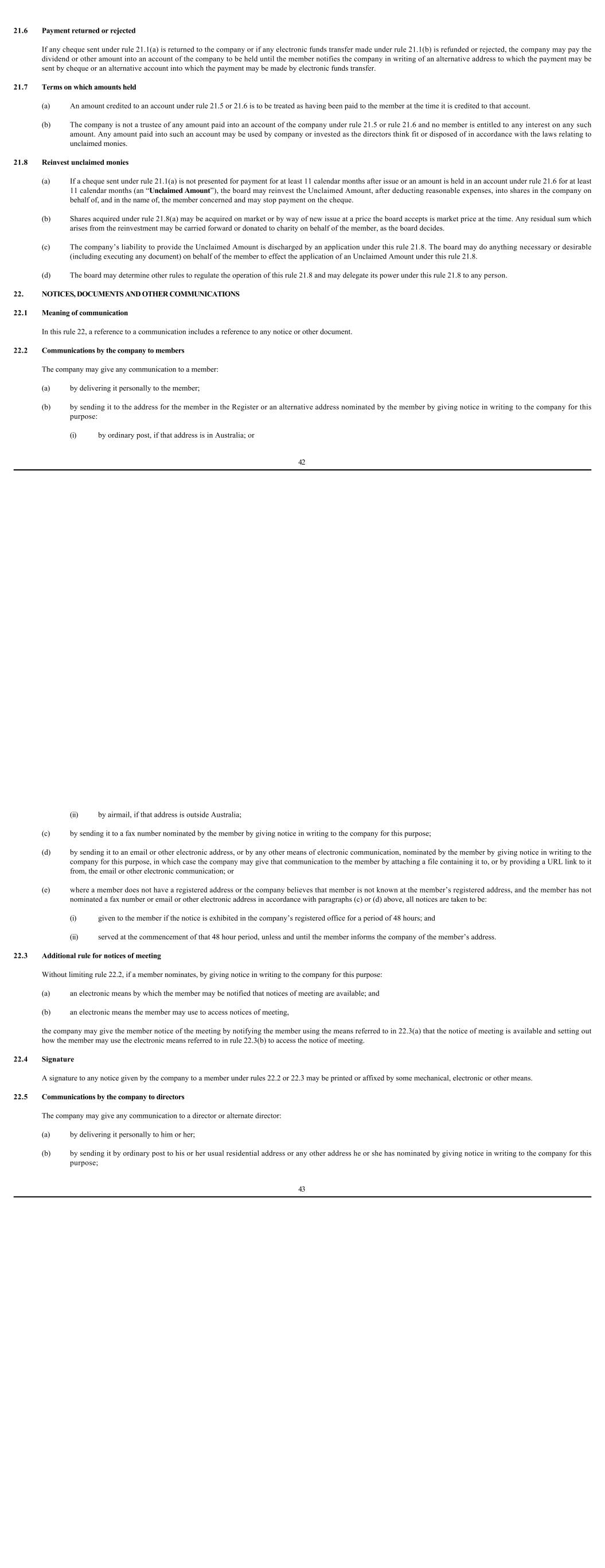 21.6 Payment returned or rejected If any cheque sent under rule 21.1(a) is returned to the company or if any electronic funds transfer made under rule 21.1(b) is refunded or rejected, the company may pay the dividend or other amount into an account of the company to be held until the member notifies the company in writing of an alternative address to which the payment may be sent by cheque or an alternative account into which the payment may be made by electronic funds transfer. 21.7 Terms on which amounts held (a) An amount credited to an account under rule 21.5 or 21.6 is to be treated as having been paid to the member at the time it is credited to that account. (b) The company is not a trustee of any amount paid into an account of the company under rule 21.5 or rule 21.6 and no member is entitled to any interest on any such amount. Any amount paid into such an account may be used by company or invested as the directors think fit or disposed of in accordance with the laws relating to unclaimed monies. 21.8 Reinvest unclaimed monies (a) If a cheque sent under rule 21.1(a) is not presented for payment for at least 11 calendar months after issue or an amount is held in an account under rule 21.6 for at least 11 calendar months (an “Unclaimed Amount”), the board may reinvest the Unclaimed Amount, after deducting reasonable expenses, into shares in the company on behalf of, and in the name of, the member concerned and may stop payment on the cheque. (b) Shares acquired under rule 21.8(a) may be acquired on market or by way of new issue at a price the board accepts is market price at the time. Any residual sum which arises from the reinvestment may be carried forward or donated to charity on behalf of the member, as the board decides. (c) The company’s liability to provide the Unclaimed Amount is discharged by an application under this rule 21.8. The board may do anything necessary or desirable (including executing any document) on behalf of the member to effect the application of an Unclaimed Amount under this rule 21.8. (d) The board may determine other rules to regulate the operation of this rule 21.8 and may delegate its power under this rule 21.8 to any person. 22. NOTICES, DOCUMENTS AND OTHER COMMUNICATIONS 22.1 Meaning of communication In this rule 22, a reference to a communication includes a reference to any notice or other document. 22.2 Communications by the company to members The company may give any communication to a member: (a) by delivering it personally to the member; (b) by sending it to the address for the member in the Register or an alternative address nominated by the member by giving notice in writing to the company for this purpose: (i) by ordinary post, if that address is in Australia; or 42 (ii) by airmail, if that address is outside Australia; (c) by sending it to a fax number nominated by the member by giving notice in writing to the company for this purpose; (d) by sending it to an email or other electronic address, or by any other means of electronic communication, nominated by the member by giving notice in writing to the company for this purpose, in which case the company may give that communication to the member by attaching a file containing it to, or by providing a URL link to it from, the email or other electronic communication; or (e) where a member does not have a registered address or the company believes that member is not known at the member’s registered address, and the member has not nominated a fax number or email or other electronic address in accordance with paragraphs (c) or (d) above, all notices are taken to be: (i) given to the member if the notice is exhibited in the company’s registered office for a period of 48 hours; and (ii) served at the commencement of that 48 hour period, unless and until the member informs the company of the member’s address. 22.3 Additional rule for notices of meeting Without limiting rule 22.2, if a member nominates, by giving notice in writing to the company for this purpose: (a) an electronic means by which the member may be notified that notices of meeting are available; and (b) an electronic means the member may use to access notices of meeting, the company may give the member notice of the meeting by notifying the member using the means referred to in 22.3(a) that the notice of meeting is available and setting out how the member may use the electronic means referred to in rule 22.3(b) to access the notice of meeting. 22.4 Signature A signature to any notice given by the company to a member under rules 22.2 or 22.3 may be printed or affixed by some mechanical, electronic or other means. 22.5 Communications by the company to directors The company may give any communication to a director or alternate director: (a) by delivering it personally to him or her; (b) by sending it by ordinary post to his or her usual residential address or any other address he or she has nominated by giving notice in writing to the company for this purpose; 43