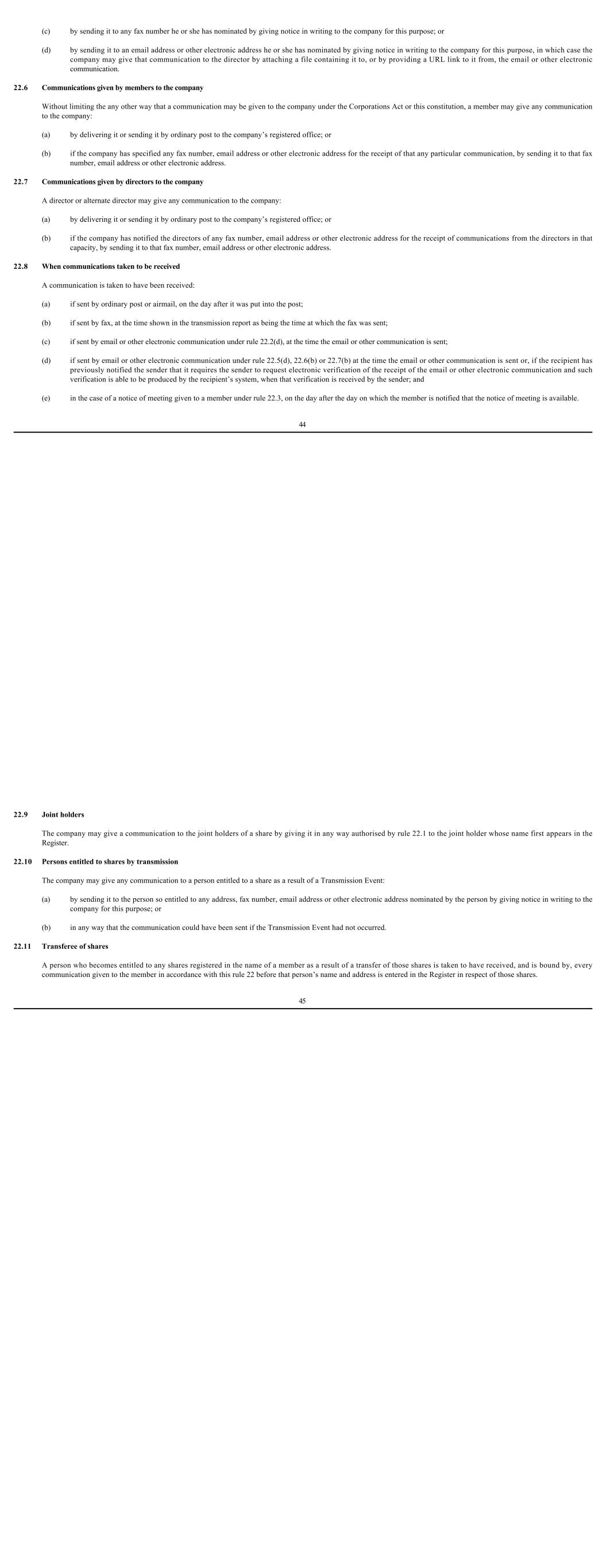 (c) by sending it to any fax number he or she has nominated by giving notice in writing to the company for this purpose; or (d) by sending it to an email address or other electronic address he or she has nominated by giving notice in writing to the company for this purpose, in which case the company may give that communication to the director by attaching a file containing it to, or by providing a URL link to it from, the email or other electronic communication. 22.6 Communications given by members to the company Without limiting the any other way that a communication may be given to the company under the Corporations Act or this constitution, a member may give any communication to the company: (a) by delivering it or sending it by ordinary post to the company’s registered office; or (b) if the company has specified any fax number, email address or other electronic address for the receipt of that any particular communication, by sending it to that fax number, email address or other electronic address. 22.7 Communications given by directors to the company A director or alternate director may give any communication to the company: (a) by delivering it or sending it by ordinary post to the company’s registered office; or (b) if the company has notified the directors of any fax number, email address or other electronic address for the receipt of communications from the directors in that capacity, by sending it to that fax number, email address or other electronic address. 22.8 When communications taken to be received A communication is taken to have been received: (a) if sent by ordinary post or airmail, on the day after it was put into the post; (b) if sent by fax, at the time shown in the transmission report as being the time at which the fax was sent; (c) if sent by email or other electronic communication under rule 22.2(d), at the time the email or other communication is sent; (d) if sent by email or other electronic communication under rule 22.5(d), 22.6(b) or 22.7(b) at the time the email or other communication is sent or, if the recipient has previously notified the sender that it requires the sender to request electronic verification of the receipt of the email or other electronic communication and such verification is able to be produced by the recipient’s system, when that verification is received by the sender; and (e) in the case of a notice of meeting given to a member under rule 22.3, on the day after the day on which the member is notified that the notice of meeting is available. 44 22.9 Joint holders The company may give a communication to the joint holders of a share by giving it in any way authorised by rule 22.1 to the joint holder whose name first appears in the Register. 22.10 Persons entitled to shares by transmission The company may give any communication to a person entitled to a share as a result of a Transmission Event: (a) by sending it to the person so entitled to any address, fax number, email address or other electronic address nominated by the person by giving notice in writing to the company for this purpose; or (b) in any way that the communication could have been sent if the Transmission Event had not occurred. 22.11 Transferee of shares A person who becomes entitled to any shares registered in the name of a member as a result of a transfer of those shares is taken to have received, and is bound by, every communication given to the member in accordance with this rule 22 before that person’s name and address is entered in the Register in respect of those shares. 45