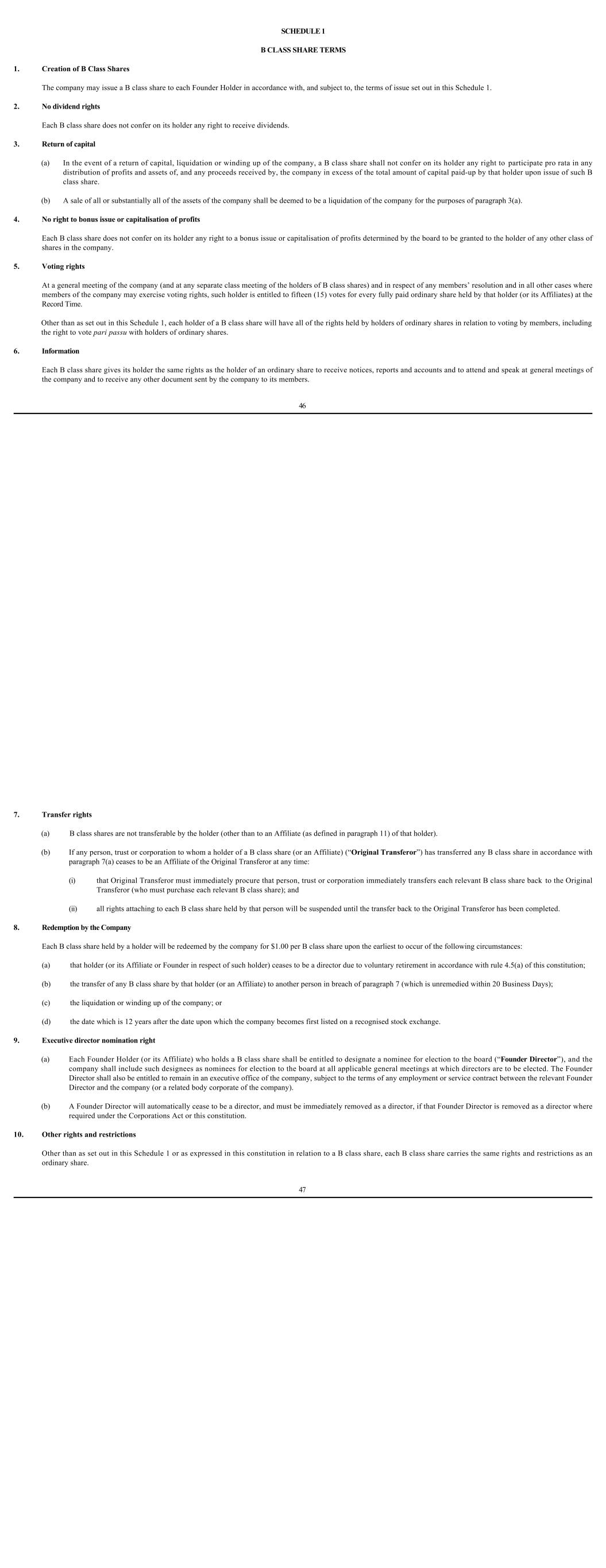 SCHEDULE 1 B CLASS SHARE TERMS 1. Creation of B Class Shares The company may issue a B class share to each Founder Holder in accordance with, and subject to, the terms of issue set out in this Schedule 1. 2. No dividend rights Each B class share does not confer on its holder any right to receive dividends. 3. Return of capital (a) In the event of a return of capital, liquidation or winding up of the company, a B class share shall not confer on its holder any right to participate pro rata in any distribution of profits and assets of, and any proceeds received by, the company in excess of the total amount of capital paid-up by that holder upon issue of such B class share. (b) A sale of all or substantially all of the assets of the company shall be deemed to be a liquidation of the company for the purposes of paragraph 3(a). 4. No right to bonus issue or capitalisation of profits Each B class share does not confer on its holder any right to a bonus issue or capitalisation of profits determined by the board to be granted to the holder of any other class of shares in the company. 5. Voting rights At a general meeting of the company (and at any separate class meeting of the holders of B class shares) and in respect of any members’ resolution and in all other cases where members of the company may exercise voting rights, such holder is entitled to fifteen (15) votes for every fully paid ordinary share held by that holder (or its Affiliates) at the Record Time. Other than as set out in this Schedule 1, each holder of a B class share will have all of the rights held by holders of ordinary shares in relation to voting by members, including the right to vote pari passu with holders of ordinary shares. 6. Information Each B class share gives its holder the same rights as the holder of an ordinary share to receive notices, reports and accounts and to attend and speak at general meetings of the company and to receive any other document sent by the company to its members. 46 7. Transfer rights (a) B class shares are not transferable by the holder (other than to an Affiliate (as defined in paragraph 11) of that holder). (b) If any person, trust or corporation to whom a holder of a B class share (or an Affiliate) (“Original Transferor”) has transferred any B class share in accordance with paragraph 7(a) ceases to be an Affiliate of the Original Transferor at any time: (i) that Original Transferor must immediately procure that person, trust or corporation immediately transfers each relevant B class share back to the Original Transferor (who must purchase each relevant B class share); and (ii) all rights attaching to each B class share held by that person will be suspended until the transfer back to the Original Transferor has been completed. 8. Redemption by the Company Each B class share held by a holder will be redeemed by the company for $1.00 per B class share upon the earliest to occur of the following circumstances: (a) that holder (or its Affiliate or Founder in respect of such holder) ceases to be a director due to voluntary retirement in accordance with rule 4.5(a) of this constitution; (b) the transfer of any B class share by that holder (or an Affiliate) to another person in breach of paragraph 7 (which is unremedied within 20 Business Days); (c) the liquidation or winding up of the company; or (d) the date which is 12 years after the date upon which the company becomes first listed on a recognised stock exchange. 9. Executive director nomination right (a) Each Founder Holder (or its Affiliate) who holds a B class share shall be entitled to designate a nominee for election to the board (“Founder Director”), and the company shall include such designees as nominees for election to the board at all applicable general meetings at which directors are to be elected. The Founder Director shall also be entitled to remain in an executive office of the company, subject to the terms of any employment or service contract between the relevant Founder Director and the company (or a related body corporate of the company). (b) A Founder Director will automatically cease to be a director, and must be immediately removed as a director, if that Founder Director is removed as a director where required under the Corporations Act or this constitution. 10. Other rights and restrictions Other than as set out in this Schedule 1 or as expressed in this constitution in relation to a B class share, each B class share carries the same rights and restrictions as an ordinary share. 47