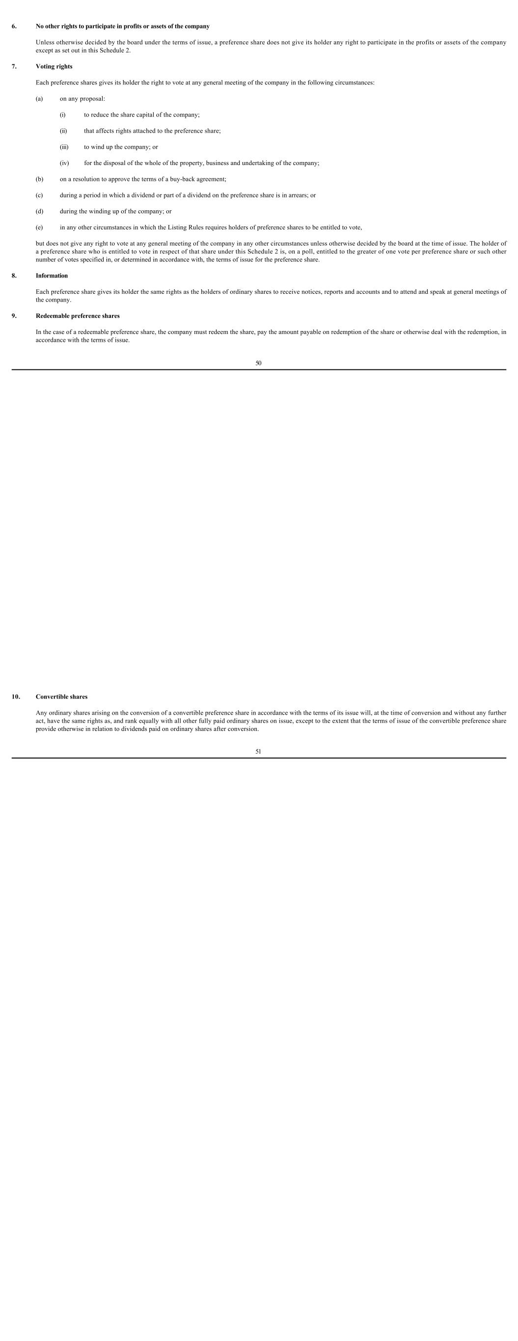 6. No other rights to participate in profits or assets of the company Unless otherwise decided by the board under the terms of issue, a preference share does not give its holder any right to participate in the profits or assets of the company except as set out in this Schedule 2. 7. Voting rights Each preference shares gives its holder the right to vote at any general meeting of the company in the following circumstances: (a) on any proposal: (i) to reduce the share capital of the company; (ii) that affects rights attached to the preference share; (iii) to wind up the company; or (iv) for the disposal of the whole of the property, business and undertaking of the company; (b) on a resolution to approve the terms of a buy-back agreement; (c) during a period in which a dividend or part of a dividend on the preference share is in arrears; or (d) during the winding up of the company; or (e) in any other circumstances in which the Listing Rules requires holders of preference shares to be entitled to vote, but does not give any right to vote at any general meeting of the company in any other circumstances unless otherwise decided by the board at the time of issue. The holder of a preference share who is entitled to vote in respect of that share under this Schedule 2 is, on a poll, entitled to the greater of one vote per preference share or such other number of votes specified in, or determined in accordance with, the terms of issue for the preference share. 8. Information Each preference share gives its holder the same rights as the holders of ordinary shares to receive notices, reports and accounts and to attend and speak at general meetings of the company. 9. Redeemable preference shares In the case of a redeemable preference share, the company must redeem the share, pay the amount payable on redemption of the share or otherwise deal with the redemption, in accordance with the terms of issue. 50 10. Convertible shares Any ordinary shares arising on the conversion of a convertible preference share in accordance with the terms of its issue will, at the time of conversion and without any further act, have the same rights as, and rank equally with all other fully paid ordinary shares on issue, except to the extent that the terms of issue of the convertible preference share provide otherwise in relation to dividends paid on ordinary shares after conversion. 51