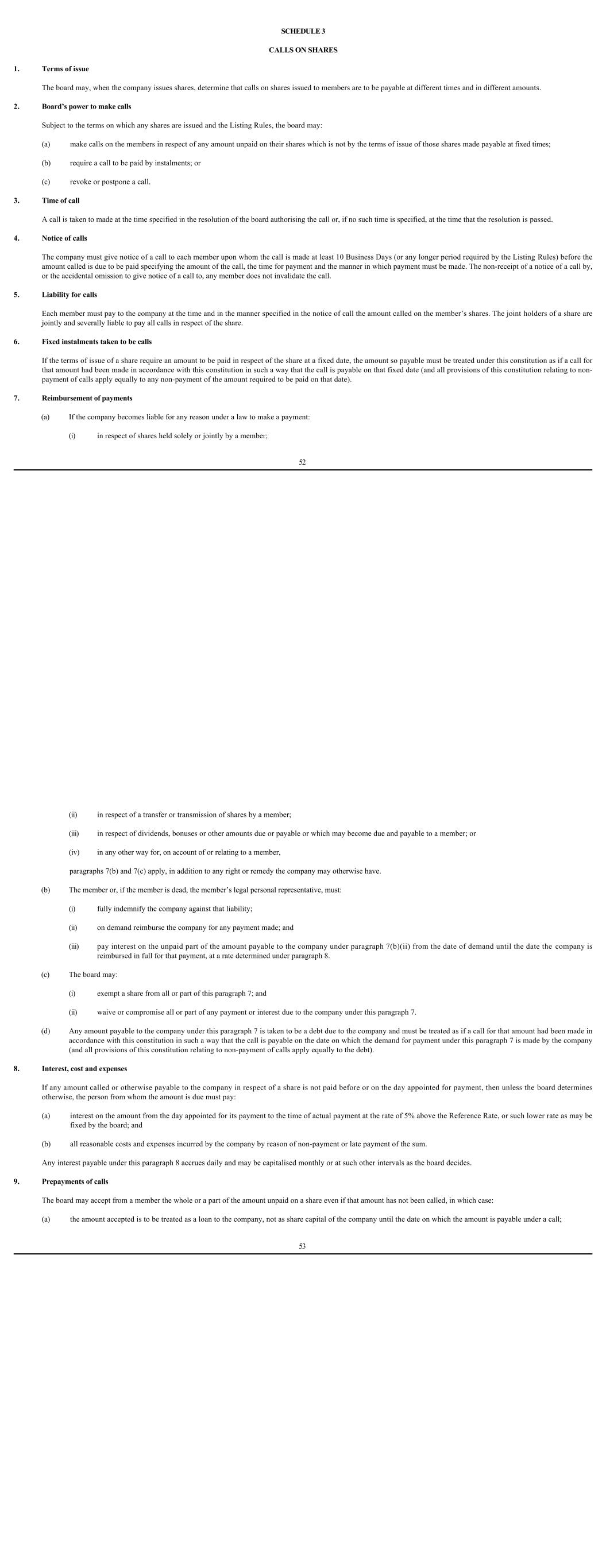 SCHEDULE 3 CALLS ON SHARES 1. Terms of issue The board may, when the company issues shares, determine that calls on shares issued to members are to be payable at different times and in different amounts. 2. Board’s power to make calls Subject to the terms on which any shares are issued and the Listing Rules, the board may: (a) make calls on the members in respect of any amount unpaid on their shares which is not by the terms of issue of those shares made payable at fixed times; (b) require a call to be paid by instalments; or (c) revoke or postpone a call. 3. Time of call A call is taken to made at the time specified in the resolution of the board authorising the call or, if no such time is specified, at the time that the resolution is passed. 4. Notice of calls The company must give notice of a call to each member upon whom the call is made at least 10 Business Days (or any longer period required by the Listing Rules) before the amount called is due to be paid specifying the amount of the call, the time for payment and the manner in which payment must be made. The non-receipt of a notice of a call by, or the accidental omission to give notice of a call to, any member does not invalidate the call. 5. Liability for calls Each member must pay to the company at the time and in the manner specified in the notice of call the amount called on the member’s shares. The joint holders of a share are jointly and severally liable to pay all calls in respect of the share. 6. Fixed instalments taken to be calls If the terms of issue of a share require an amount to be paid in respect of the share at a fixed date, the amount so payable must be treated under this constitution as if a call for that amount had been made in accordance with this constitution in such a way that the call is payable on that fixed date (and all provisions of this constitution relating to non- payment of calls apply equally to any non-payment of the amount required to be paid on that date). 7. Reimbursement of payments (a) If the company becomes liable for any reason under a law to make a payment: (i) in respect of shares held solely or jointly by a member; 52 (ii) in respect of a transfer or transmission of shares by a member; (iii) in respect of dividends, bonuses or other amounts due or payable or which may become due and payable to a member; or (iv) in any other way for, on account of or relating to a member, paragraphs 7(b) and 7(c) apply, in addition to any right or remedy the company may otherwise have. (b) The member or, if the member is dead, the member’s legal personal representative, must: (i) fully indemnify the company against that liability; (ii) on demand reimburse the company for any payment made; and (iii) pay interest on the unpaid part of the amount payable to the company under paragraph 7(b)(ii) from the date of demand until the date the company is reimbursed in full for that payment, at a rate determined under paragraph 8. (c) The board may: (i) exempt a share from all or part of this paragraph 7; and (ii) waive or compromise all or part of any payment or interest due to the company under this paragraph 7. (d) Any amount payable to the company under this paragraph 7 is taken to be a debt due to the company and must be treated as if a call for that amount had been made in accordance with this constitution in such a way that the call is payable on the date on which the demand for payment under this paragraph 7 is made by the company (and all provisions of this constitution relating to non-payment of calls apply equally to the debt). 8. Interest, cost and expenses If any amount called or otherwise payable to the company in respect of a share is not paid before or on the day appointed for payment, then unless the board determines otherwise, the person from whom the amount is due must pay: (a) interest on the amount from the day appointed for its payment to the time of actual payment at the rate of 5% above the Reference Rate, or such lower rate as may be fixed by the board; and (b) all reasonable costs and expenses incurred by the company by reason of non-payment or late payment of the sum. Any interest payable under this paragraph 8 accrues daily and may be capitalised monthly or at such other intervals as the board decides. 9. Prepayments of calls The board may accept from a member the whole or a part of the amount unpaid on a share even if that amount has not been called, in which case: (a) the amount accepted is to be treated as a loan to the company, not as share capital of the company until the date on which the amount is payable under a call; 53