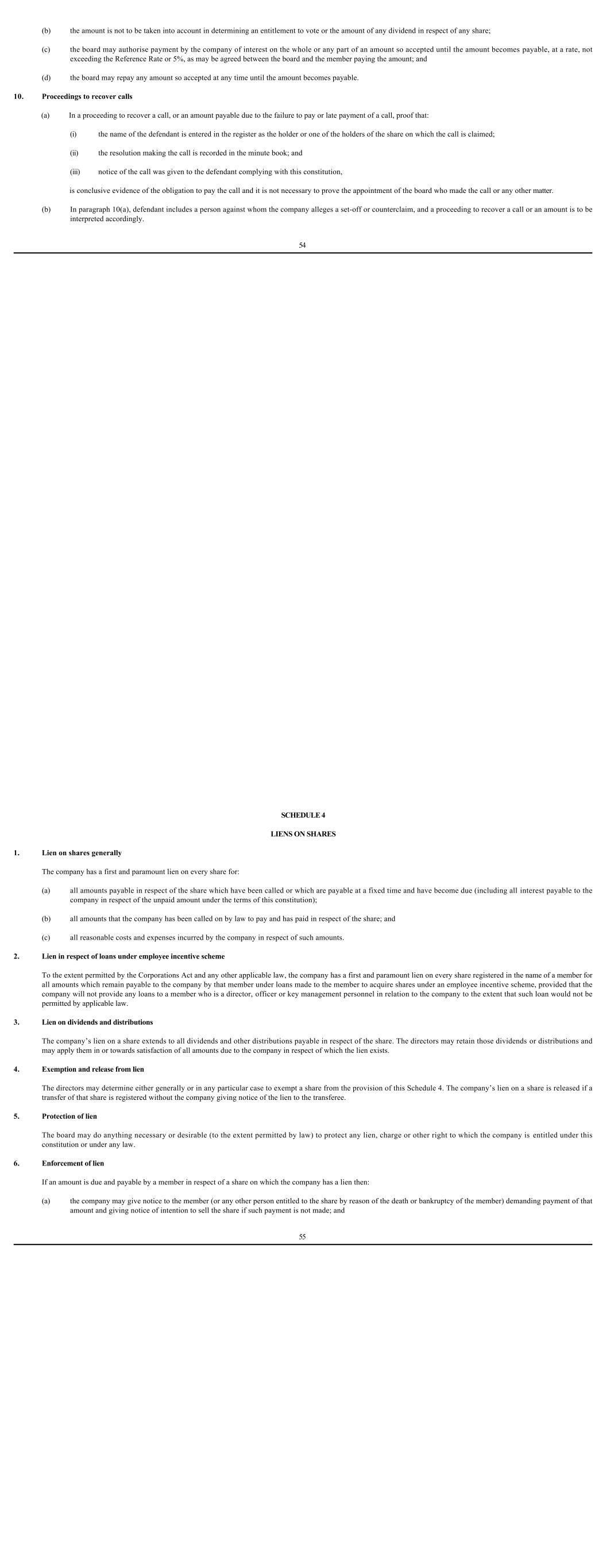 (b) the amount is not to be taken into account in determining an entitlement to vote or the amount of any dividend in respect of any share; (c) the board may authorise payment by the company of interest on the whole or any part of an amount so accepted until the amount becomes payable, at a rate, not exceeding the Reference Rate or 5%, as may be agreed between the board and the member paying the amount; and (d) the board may repay any amount so accepted at any time until the amount becomes payable. 10. Proceedings to recover calls (a) In a proceeding to recover a call, or an amount payable due to the failure to pay or late payment of a call, proof that: (i) the name of the defendant is entered in the register as the holder or one of the holders of the share on which the call is claimed; (ii) the resolution making the call is recorded in the minute book; and (iii) notice of the call was given to the defendant complying with this constitution, is conclusive evidence of the obligation to pay the call and it is not necessary to prove the appointment of the board who made the call or any other matter. (b) In paragraph 10(a), defendant includes a person against whom the company alleges a set-off or counterclaim, and a proceeding to recover a call or an amount is to be interpreted accordingly. 54 SCHEDULE 4 LIENS ON SHARES 1. Lien on shares generally The company has a first and paramount lien on every share for: (a) all amounts payable in respect of the share which have been called or which are payable at a fixed time and have become due (including all interest payable to the company in respect of the unpaid amount under the terms of this constitution); (b) all amounts that the company has been called on by law to pay and has paid in respect of the share; and (c) all reasonable costs and expenses incurred by the company in respect of such amounts. 2. Lien in respect of loans under employee incentive scheme To the extent permitted by the Corporations Act and any other applicable law, the company has a first and paramount lien on every share registered in the name of a member for all amounts which remain payable to the company by that member under loans made to the member to acquire shares under an employee incentive scheme, provided that the company will not provide any loans to a member who is a director, officer or key management personnel in relation to the company to the extent that such loan would not be permitted by applicable law. 3. Lien on dividends and distributions The company’s lien on a share extends to all dividends and other distributions payable in respect of the share. The directors may retain those dividends or distributions and may apply them in or towards satisfaction of all amounts due to the company in respect of which the lien exists. 4. Exemption and release from lien The directors may determine either generally or in any particular case to exempt a share from the provision of this Schedule 4. The company’s lien on a share is released if a transfer of that share is registered without the company giving notice of the lien to the transferee. 5. Protection of lien The board may do anything necessary or desirable (to the extent permitted by law) to protect any lien, charge or other right to which the company is entitled under this constitution or under any law. 6. Enforcement of lien If an amount is due and payable by a member in respect of a share on which the company has a lien then: (a) the company may give notice to the member (or any other person entitled to the share by reason of the death or bankruptcy of the member) demanding payment of that amount and giving notice of intention to sell the share if such payment is not made; and 55
