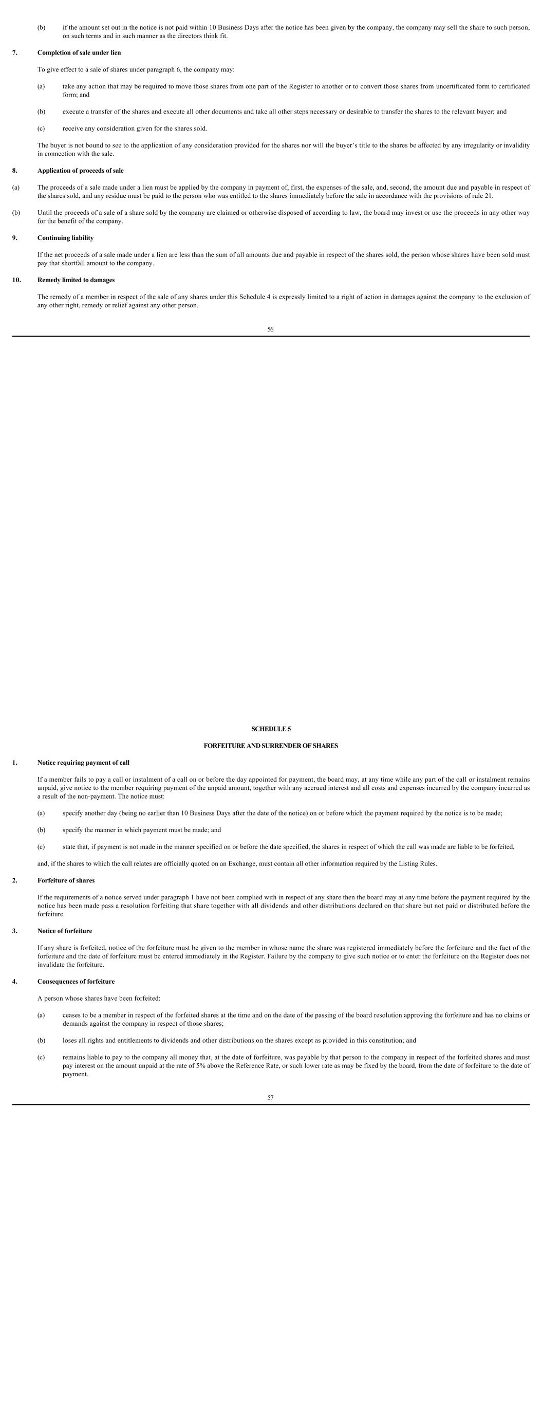 (b) if the amount set out in the notice is not paid within 10 Business Days after the notice has been given by the company, the company may sell the share to such person, on such terms and in such manner as the directors think fit. 7. Completion of sale under lien To give effect to a sale of shares under paragraph 6, the company may: (a) take any action that may be required to move those shares from one part of the Register to another or to convert those shares from uncertificated form to certificated form; and (b) execute a transfer of the shares and execute all other documents and take all other steps necessary or desirable to transfer the shares to the relevant buyer; and (c) receive any consideration given for the shares sold. The buyer is not bound to see to the application of any consideration provided for the shares nor will the buyer’s title to the shares be affected by any irregularity or invalidity in connection with the sale. 8. Application of proceeds of sale (a) The proceeds of a sale made under a lien must be applied by the company in payment of, first, the expenses of the sale, and, second, the amount due and payable in respect of the shares sold, and any residue must be paid to the person who was entitled to the shares immediately before the sale in accordance with the provisions of rule 21. (b) Until the proceeds of a sale of a share sold by the company are claimed or otherwise disposed of according to law, the board may invest or use the proceeds in any other way for the benefit of the company. 9. Continuing liability If the net proceeds of a sale made under a lien are less than the sum of all amounts due and payable in respect of the shares sold, the person whose shares have been sold must pay that shortfall amount to the company. 10. Remedy limited to damages The remedy of a member in respect of the sale of any shares under this Schedule 4 is expressly limited to a right of action in damages against the company to the exclusion of any other right, remedy or relief against any other person. 56 SCHEDULE 5 FORFEITURE AND SURRENDER OF SHARES 1. Notice requiring payment of call If a member fails to pay a call or instalment of a call on or before the day appointed for payment, the board may, at any time while any part of the call or instalment remains unpaid, give notice to the member requiring payment of the unpaid amount, together with any accrued interest and all costs and expenses incurred by the company incurred as a result of the non-payment. The notice must: (a) specify another day (being no earlier than 10 Business Days after the date of the notice) on or before which the payment required by the notice is to be made; (b) specify the manner in which payment must be made; and (c) state that, if payment is not made in the manner specified on or before the date specified, the shares in respect of which the call was made are liable to be forfeited, and, if the shares to which the call relates are officially quoted on an Exchange, must contain all other information required by the Listing Rules. 2. Forfeiture of shares If the requirements of a notice served under paragraph 1 have not been complied with in respect of any share then the board may at any time before the payment required by the notice has been made pass a resolution forfeiting that share together with all dividends and other distributions declared on that share but not paid or distributed before the forfeiture. 3. Notice of forfeiture If any share is forfeited, notice of the forfeiture must be given to the member in whose name the share was registered immediately before the forfeiture and the fact of the forfeiture and the date of forfeiture must be entered immediately in the Register. Failure by the company to give such notice or to enter the forfeiture on the Register does not invalidate the forfeiture. 4. Consequences of forfeiture A person whose shares have been forfeited: (a) ceases to be a member in respect of the forfeited shares at the time and on the date of the passing of the board resolution approving the forfeiture and has no claims or demands against the company in respect of those shares; (b) loses all rights and entitlements to dividends and other distributions on the shares except as provided in this constitution; and (c) remains liable to pay to the company all money that, at the date of forfeiture, was payable by that person to the company in respect of the forfeited shares and must pay interest on the amount unpaid at the rate of 5% above the Reference Rate, or such lower rate as may be fixed by the board, from the date of forfeiture to the date of payment. 57