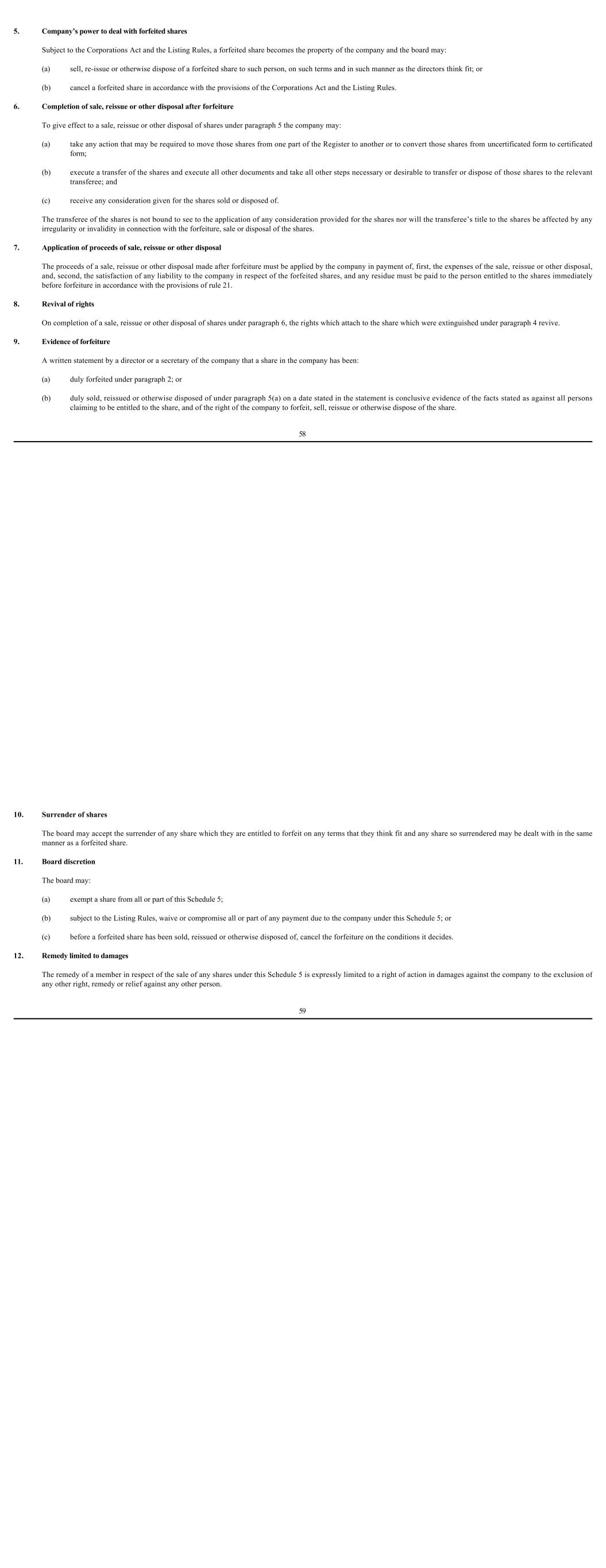 5. Company’s power to deal with forfeited shares Subject to the Corporations Act and the Listing Rules, a forfeited share becomes the property of the company and the board may: (a) sell, re-issue or otherwise dispose of a forfeited share to such person, on such terms and in such manner as the directors think fit; or (b) cancel a forfeited share in accordance with the provisions of the Corporations Act and the Listing Rules. 6. Completion of sale, reissue or other disposal after forfeiture To give effect to a sale, reissue or other disposal of shares under paragraph 5 the company may: (a) take any action that may be required to move those shares from one part of the Register to another or to convert those shares from uncertificated form to certificated form; (b) execute a transfer of the shares and execute all other documents and take all other steps necessary or desirable to transfer or dispose of those shares to the relevant transferee; and (c) receive any consideration given for the shares sold or disposed of. The transferee of the shares is not bound to see to the application of any consideration provided for the shares nor will the transferee’s title to the shares be affected by any irregularity or invalidity in connection with the forfeiture, sale or disposal of the shares. 7. Application of proceeds of sale, reissue or other disposal The proceeds of a sale, reissue or other disposal made after forfeiture must be applied by the company in payment of, first, the expenses of the sale, reissue or other disposal, and, second, the satisfaction of any liability to the company in respect of the forfeited shares, and any residue must be paid to the person entitled to the shares immediately before forfeiture in accordance with the provisions of rule 21. 8. Revival of rights On completion of a sale, reissue or other disposal of shares under paragraph 6, the rights which attach to the share which were extinguished under paragraph 4 revive. 9. Evidence of forfeiture A written statement by a director or a secretary of the company that a share in the company has been: (a) duly forfeited under paragraph 2; or (b) duly sold, reissued or otherwise disposed of under paragraph 5(a) on a date stated in the statement is conclusive evidence of the facts stated as against all persons claiming to be entitled to the share, and of the right of the company to forfeit, sell, reissue or otherwise dispose of the share. 58 10. Surrender of shares The board may accept the surrender of any share which they are entitled to forfeit on any terms that they think fit and any share so surrendered may be dealt with in the same manner as a forfeited share. 11. Board discretion The board may: (a) exempt a share from all or part of this Schedule 5; (b) subject to the Listing Rules, waive or compromise all or part of any payment due to the company under this Schedule 5; or (c) before a forfeited share has been sold, reissued or otherwise disposed of, cancel the forfeiture on the conditions it decides. 12. Remedy limited to damages The remedy of a member in respect of the sale of any shares under this Schedule 5 is expressly limited to a right of action in damages against the company to the exclusion of any other right, remedy or relief against any other person. 59