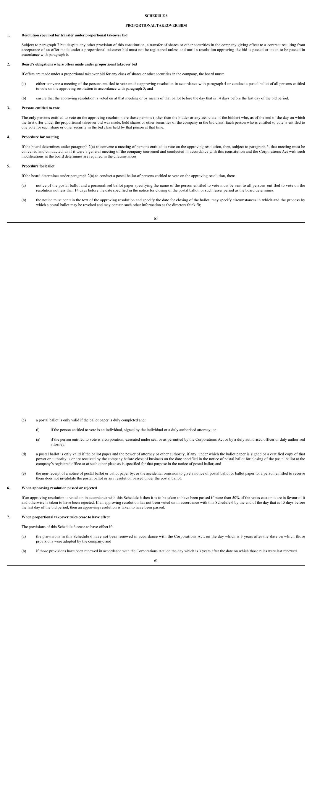 SCHEDULE 6 PROPORTIONAL TAKEOVER BIDS 1. Resolution required for transfer under proportional takeover bid Subject to paragraph 7 but despite any other provision of this constitution, a transfer of shares or other securities in the company giving effect to a contract resulting from acceptance of an offer made under a proportional takeover bid must not be registered unless and until a resolution approving the bid is passed or taken to be passed in accordance with paragraph 6. 2. Board’s obligations where offers made under proportional takeover bid If offers are made under a proportional takeover bid for any class of shares or other securities in the company, the board must: (a) either convene a meeting of the persons entitled to vote on the approving resolution in accordance with paragraph 4 or conduct a postal ballot of all persons entitled to vote on the approving resolution in accordance with paragraph 5; and (b) ensure that the approving resolution is voted on at that meeting or by means of that ballot before the day that is 14 days before the last day of the bid period. 3. Persons entitled to vote The only persons entitled to vote on the approving resolution are those persons (other than the bidder or any associate of the bidder) who, as of the end of the day on which the first offer under the proportional takeover bid was made, held shares or other securities of the company in the bid class. Each person who is entitled to vote is entitled to one vote for each share or other security in the bid class held by that person at that time. 4. Procedure for meeting If the board determines under paragraph 2(a) to convene a meeting of persons entitled to vote on the approving resolution, then, subject to paragraph 3, that meeting must be convened and conducted, as if it were a general meeting of the company convened and conducted in accordance with this constitution and the Corporations Act with such modifications as the board determines are required in the circumstances. 5. Procedure for ballot If the board determines under paragraph 2(a) to conduct a postal ballot of persons entitled to vote on the approving resolution, then: (a) notice of the postal ballot and a personalised ballot paper specifying the name of the person entitled to vote must be sent to all persons entitled to vote on the resolution not less than 14 days before the date specified in the notice for closing of the postal ballot, or such lesser period as the board determines; (b) the notice must contain the text of the approving resolution and specify the date for closing of the ballot, may specify circumstances in which and the process by which a postal ballot may be revoked and may contain such other information as the directors think fit; 60 (c) a postal ballot is only valid if the ballot paper is duly completed and: (i) if the person entitled to vote is an individual, signed by the individual or a duly authorised attorney; or (ii) if the person entitled to vote is a corporation, executed under seal or as permitted by the Corporations Act or by a duly authorised officer or duly authorised attorney; (d) a postal ballot is only valid if the ballot paper and the power of attorney or other authority, if any, under which the ballot paper is signed or a certified copy of that power or authority is or are received by the company before close of business on the date specified in the notice of postal ballot for closing of the postal ballot at the company’s registered office or at such other place as is specified for that purpose in the notice of postal ballot; and (e) the non-receipt of a notice of postal ballot or ballot paper by, or the accidental omission to give a notice of postal ballot or ballot paper to, a person entitled to receive them does not invalidate the postal ballot or any resolution passed under the postal ballot. 6. When approving resolution passed or rejected If an approving resolution is voted on in accordance with this Schedule 6 then it is to be taken to have been passed if more than 50% of the votes cast on it are in favour of it and otherwise is taken to have been rejected. If an approving resolution has not been voted on in accordance with this Schedule 6 by the end of the day that is 15 days before the last day of the bid period, then an approving resolution is taken to have been passed. 7. When proportional takeover rules cease to have effect The provisions of this Schedule 6 cease to have effect if: (a) the provisions in this Schedule 6 have not been renewed in accordance with the Corporations Act, on the day which is 3 years after the date on which those provisions were adopted by the company; and (b) if those provisions have been renewed in accordance with the Corporations Act, on the day which is 3 years after the date on which those rules were last renewed. 61