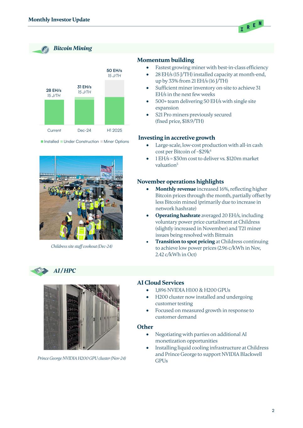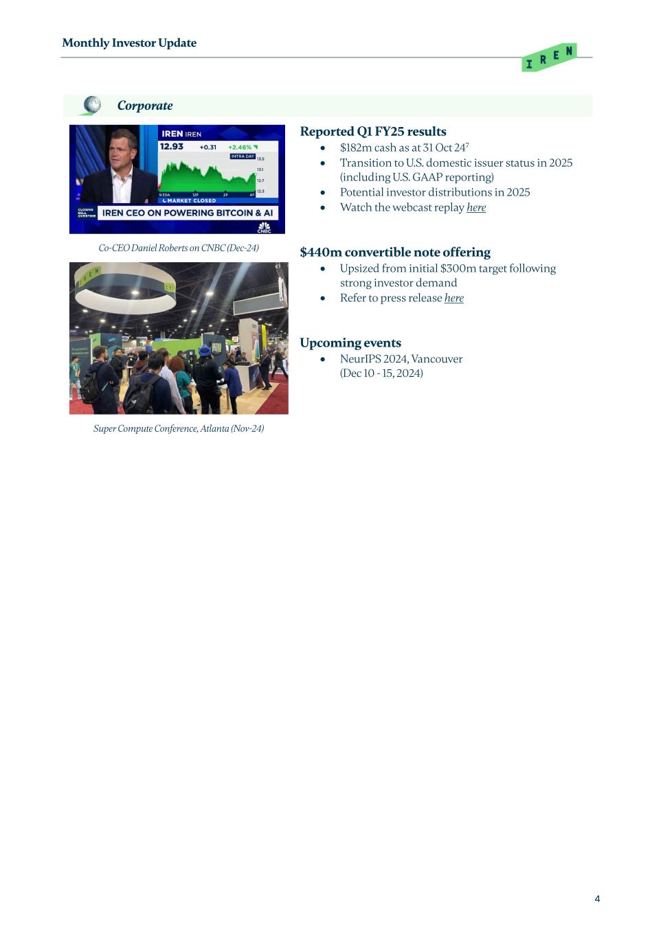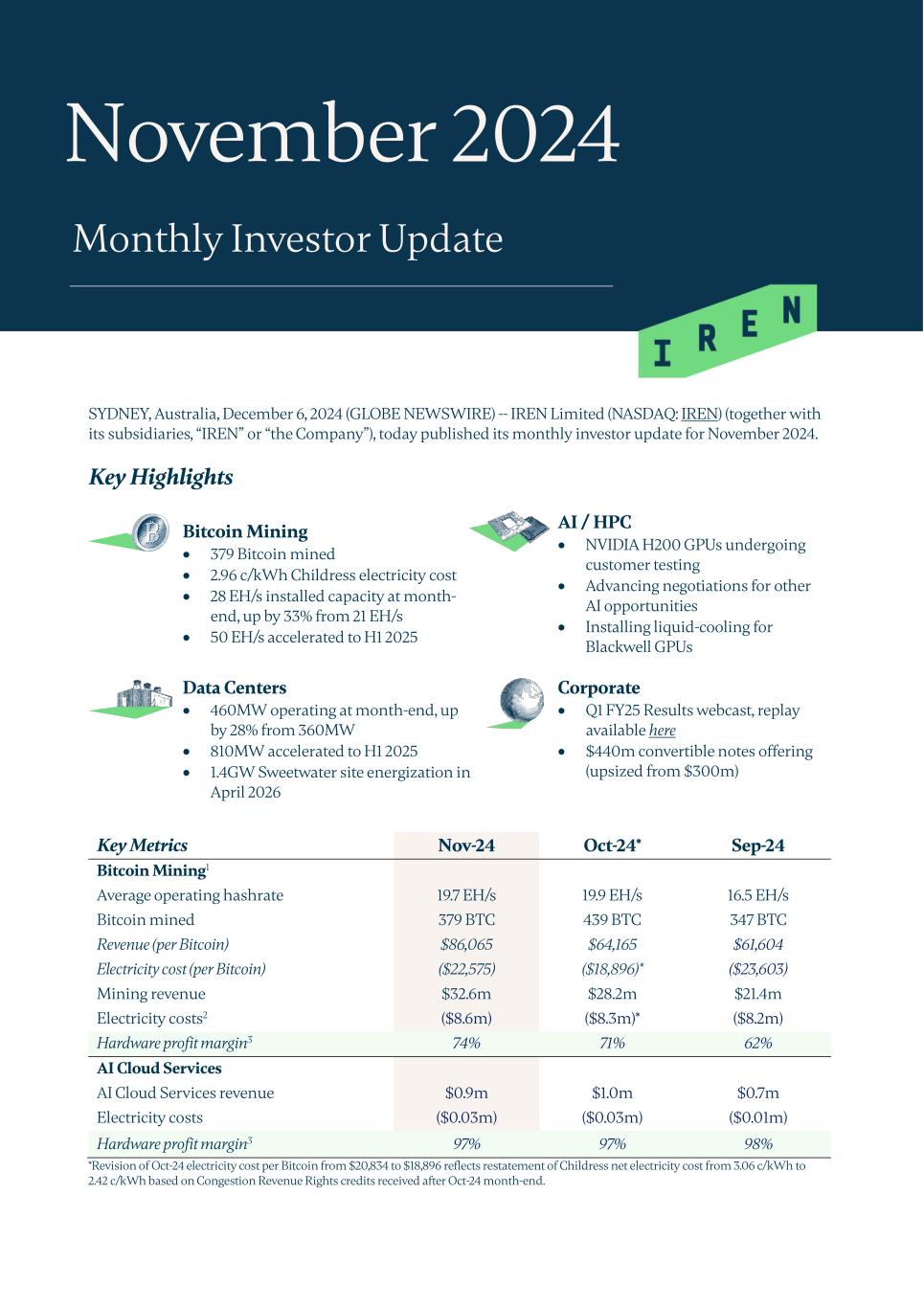 SYDNEY, Australia, December 6, 2024 (GLOBE NEWSWIRE) -- IREN Limited (NASDAQ: IREN) (together with its subsidiaries, “IREN” or “the Company”), today published its monthly investor update for November 2024. Key Highlights Bitcoin Mining • 379 Bitcoin mined • 2.96 c/kWh Childress electricity cost • 28 EH/s installed capacity at month- end, up by 33% from 21 EH/s • 50 EH/s accelerated to H1 2025 AI / HPC • NVIDIA H200 GPUs undergoing customer testing • Advancing negotiations for other AI opportunities • Installing liquid-cooling for Blackwell GPUs Data Centers Corporate • 460MW operating at month-end, up by 28% from 360MW • 810MW accelerated to H1 2025 • 1.4GW Sweetwater site energization in April 2026 • Q1 FY25 Results webcast, replay available here • $440m convertible notes offering (upsized from $300m) Key Metrics Nov-24 Oct-24* Sep-24 Bitcoin Mining1 Average operating hashrate 19.7 EH/s 19.9 EH/s 16.5 EH/s Bitcoin mined 379 BTC 439 BTC 347 BTC Revenue (per Bitcoin) $86,065 $64,165 $61,604 Electricity cost (per Bitcoin) ($22,575) ($18,896)* ($23,603) Mining revenue $32.6m $28.2m $21.4m Electricity costs2 ($8.6m) ($8.3m)* ($8.2m) Hardware profit margin3 74% 71% 62% AI Cloud Services AI Cloud Services revenue $0.9m $1.0m $0.7m Electricity costs ($0.03m) ($0.03m) ($0.01m) Hardware profit margin3 97% 97% 98% *Revision of Oct-24 electricity cost per Bitcoin from $20,834 to $18,896 reflects restatement of Childress net electricity cost from 3.06 c/kWh to 2.42 c/kWh based on Congestion Revenue Rights credits received after Oct-24 month-end. November 2024 Monthly Investor Update