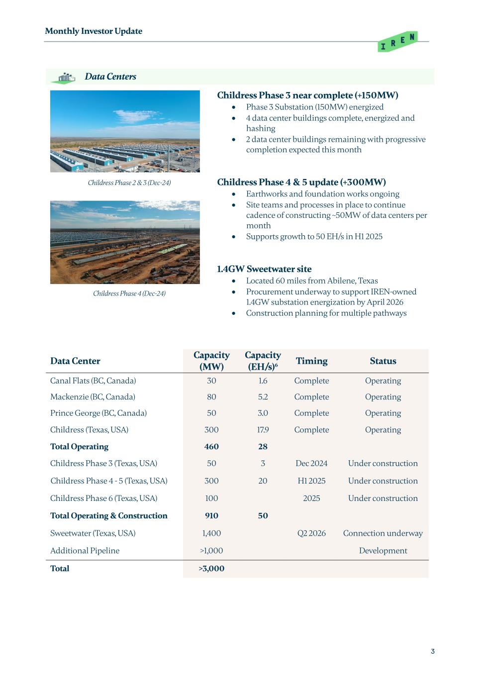 Monthly Investor Update 3 Data Centers Childress Phase 2 & 3 (Dec-24) Childress Phase 4 (Dec-24) Childress Phase 3 near complete (+150MW) • Phase 3 Substation (150MW) energized • 4 data center buildings complete, energized and hashing • 2 data center buildings remaining with progressive completion expected this month Childress Phase 4 & 5 update (+300MW) • Earthworks and foundation works ongoing • Site teams and processes in place to continue cadence of constructing ~50MW of data centers per month • Supports growth to 50 EH/s in H1 2025 1.4GW Sweetwater site • Located 60 miles from Abilene, Texas • Procurement underway to support IREN-owned 1.4GW substation energization by April 2026 • Construction planning for multiple pathways Data Center Capacity (MW) Capacity (EH/s)6 Timing Status Canal Flats (BC, Canada) 30 1.6 Complete Operating Mackenzie (BC, Canada) 80 5.2 Complete Operating Prince George (BC, Canada) 50 3.0 Complete Operating Childress (Texas, USA) 300 17.9 Complete Operating Total Operating 460 28 Childress Phase 3 (Texas, USA) 50 3 Dec 2024 Under construction Childress Phase 4 - 5 (Texas, USA) 300 20 H1 2025 Under construction Childress Phase 6 (Texas, USA) 100 2025 Under construction Total Operating & Construction 910 50 Sweetwater (Texas, USA) 1,400 Q2 2026 Connection underway Additional Pipeline >1,000 Development Total >3,000