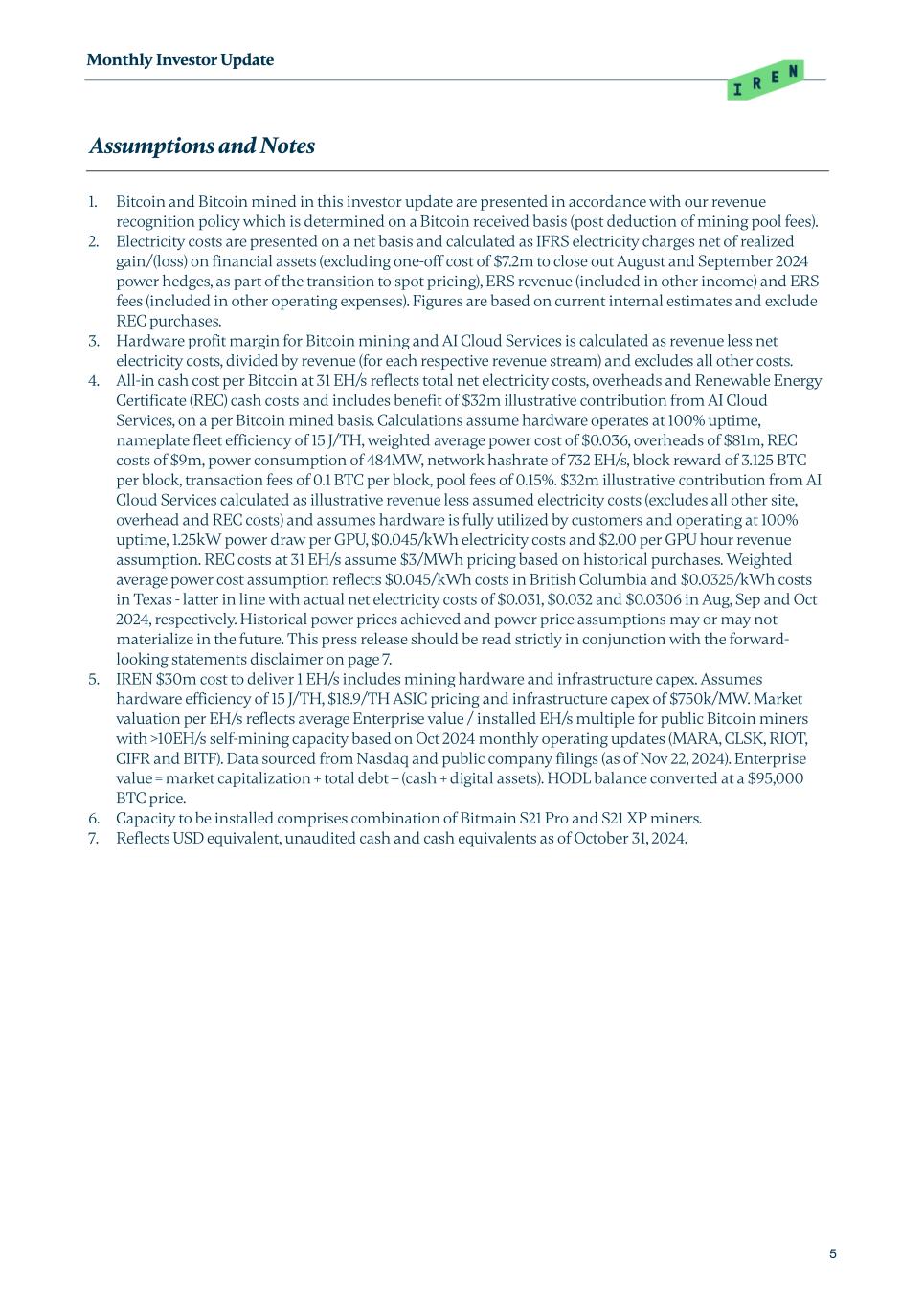 Monthly Investor Update 5 Assumptions and Notes 1. Bitcoin and Bitcoin mined in this investor update are presented in accordance with our revenue recognition policy which is determined on a Bitcoin received basis (post deduction of mining pool fees). 2. Electricity costs are presented on a net basis and calculated as IFRS electricity charges net of realized gain/(loss) on financial assets (excluding one-off cost of $7.2m to close out August and September 2024 power hedges, as part of the transition to spot pricing), ERS revenue (included in other income) and ERS fees (included in other operating expenses). Figures are based on current internal estimates and exclude REC purchases. 3. Hardware profit margin for Bitcoin mining and AI Cloud Services is calculated as revenue less net electricity costs, divided by revenue (for each respective revenue stream) and excludes all other costs. 4. All-in cash cost per Bitcoin at 31 EH/s reflects total net electricity costs, overheads and Renewable Energy Certificate (REC) cash costs and includes benefit of $32m illustrative contribution from AI Cloud Services, on a per Bitcoin mined basis. Calculations assume hardware operates at 100% uptime, nameplate fleet efficiency of 15 J/TH, weighted average power cost of $0.036, overheads of $81m, REC costs of $9m, power consumption of 484MW, network hashrate of 732 EH/s, block reward of 3.125 BTC per block, transaction fees of 0.1 BTC per block, pool fees of 0.15%. $32m illustrative contribution from AI Cloud Services calculated as illustrative revenue less assumed electricity costs (excludes all other site, overhead and REC costs) and assumes hardware is fully utilized by customers and operating at 100% uptime, 1.25kW power draw per GPU, $0.045/kWh electricity costs and $2.00 per GPU hour revenue assumption. REC costs at 31 EH/s assume $3/MWh pricing based on historical purchases. Weighted average power cost assumption reflects $0.045/kWh costs in British Columbia and $0.0325/kWh costs in Texas - latter in line with actual net electricity costs of $0.031, $0.032 and $0.0306 in Aug, Sep and Oct 2024, respectively. Historical power prices achieved and power price assumptions may or may not materialize in the future. This press release should be read strictly in conjunction with the forward- looking statements disclaimer on page 7. 5. IREN $30m cost to deliver 1 EH/s includes mining hardware and infrastructure capex. Assumes hardware efficiency of 15 J/TH, $18.9/TH ASIC pricing and infrastructure capex of $750k/MW. Market valuation per EH/s reflects average Enterprise value / installed EH/s multiple for public Bitcoin miners with >10EH/s self-mining capacity based on Oct 2024 monthly operating updates (MARA, CLSK, RIOT, CIFR and BITF). Data sourced from Nasdaq and public company filings (as of Nov 22, 2024). Enterprise value = market capitalization + total debt – (cash + digital assets). HODL balance converted at a $95,000 BTC price. 6. Capacity to be installed comprises combination of Bitmain S21 Pro and S21 XP miners. 7. Reflects USD equivalent, unaudited cash and cash equivalents as of October 31, 2024.