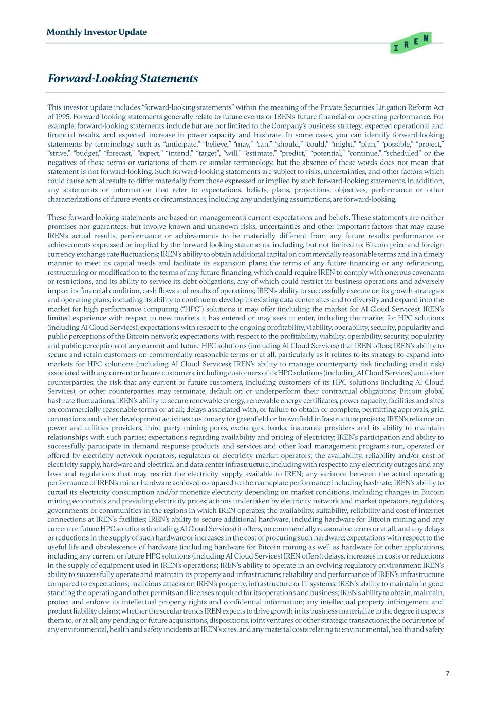 Monthly Investor Update 7 Forward-Looking Statements This investor update includes “forward-looking statements” within the meaning of the Private Securities Litigation Reform Act of 1995. Forward-looking statements generally relate to future events or IREN’s future financial or operating performance. For example, forward-looking statements include but are not limited to the Company’s business strategy, expected operational and financial results, and expected increase in power capacity and hashrate. In some cases, you can identify forward-looking statements by terminology such as “anticipate,” “believe,” “may,” “can,” “should,” “could,” “might,” “plan,” “possible,” “project,” “strive,” “budget,” “forecast,” “expect,” “intend,” “target”, “will,” “estimate,” “predict,” “potential,” “continue,” “scheduled” or the negatives of these terms or variations of them or similar terminology, but the absence of these words does not mean that statement is not forward-looking. Such forward-looking statements are subject to risks, uncertainties, and other factors which could cause actual results to differ materially from those expressed or implied by such forward-looking statements. In addition, any statements or information that refer to expectations, beliefs, plans, projections, objectives, performance or other characterizations of future events or circumstances, including any underlying assumptions, are forward-looking. These forward-looking statements are based on management’s current expectations and beliefs. These statements are neither promises nor guarantees, but involve known and unknown risks, uncertainties and other important factors that may cause IREN’s actual results, performance or achievements to be materially different from any future results performance or achievements expressed or implied by the forward looking statements, including, but not limited to: Bitcoin price and foreign currency exchange rate fluctuations; IREN’s ability to obtain additional capital on commercially reasonable terms and in a timely manner to meet its capital needs and facilitate its expansion plans; the terms of any future financing or any refinancing, restructuring or modification to the terms of any future financing, which could require IREN to comply with onerous covenants or restrictions, and its ability to service its debt obligations, any of which could restrict its business operations and adversely impact its financial condition, cash flows and results of operations; IREN’s ability to successfully execute on its growth strategies and operating plans, including its ability to continue to develop its existing data center sites and to diversify and expand into the market for high performance computing (“HPC”) solutions it may offer (including the market for AI Cloud Services); IREN’s limited experience with respect to new markets it has entered or may seek to enter, including the market for HPC solutions (including AI Cloud Services); expectations with respect to the ongoing profitability, viability, operability, security, popularity and public perceptions of the Bitcoin network; expectations with respect to the profitability, viability, operability, security, popularity and public perceptions of any current and future HPC solutions (including AI Cloud Services) that IREN offers; IREN’s ability to secure and retain customers on commercially reasonable terms or at all, particularly as it relates to its strategy to expand into markets for HPC solutions (including AI Cloud Services); IREN’s ability to manage counterparty risk (including credit risk) associated with any current or future customers, including customers of its HPC solutions (including AI Cloud Services) and other counterparties; the risk that any current or future customers, including customers of its HPC solutions (including AI Cloud Services), or other counterparties may terminate, default on or underperform their contractual obligations; Bitcoin global hashrate fluctuations; IREN’s ability to secure renewable energy, renewable energy certificates, power capacity, facilities and sites on commercially reasonable terms or at all; delays associated with, or failure to obtain or complete, permitting approvals, grid connections and other development activities customary for greenfield or brownfield infrastructure projects; IREN’s reliance on power and utilities providers, third party mining pools, exchanges, banks, insurance providers and its ability to maintain relationships with such parties; expectations regarding availability and pricing of electricity; IREN’s participation and ability to successfully participate in demand response products and services and other load management programs run, operated or offered by electricity network operators, regulators or electricity market operators; the availability, reliability and/or cost of electricity supply, hardware and electrical and data center infrastructure, including with respect to any electricity outages and any laws and regulations that may restrict the electricity supply available to IREN; any variance between the actual operating performance of IREN’s miner hardware achieved compared to the nameplate performance including hashrate; IREN’s ability to curtail its electricity consumption and/or monetize electricity depending on market conditions, including changes in Bitcoin mining economics and prevailing electricity prices; actions undertaken by electricity network and market operators, regulators, governments or communities in the regions in which IREN operates; the availability, suitability, reliability and cost of internet connections at IREN’s facilities; IREN’s ability to secure additional hardware, including hardware for Bitcoin mining and any current or future HPC solutions (including AI Cloud Services) it offers, on commercially reasonable terms or at all, a