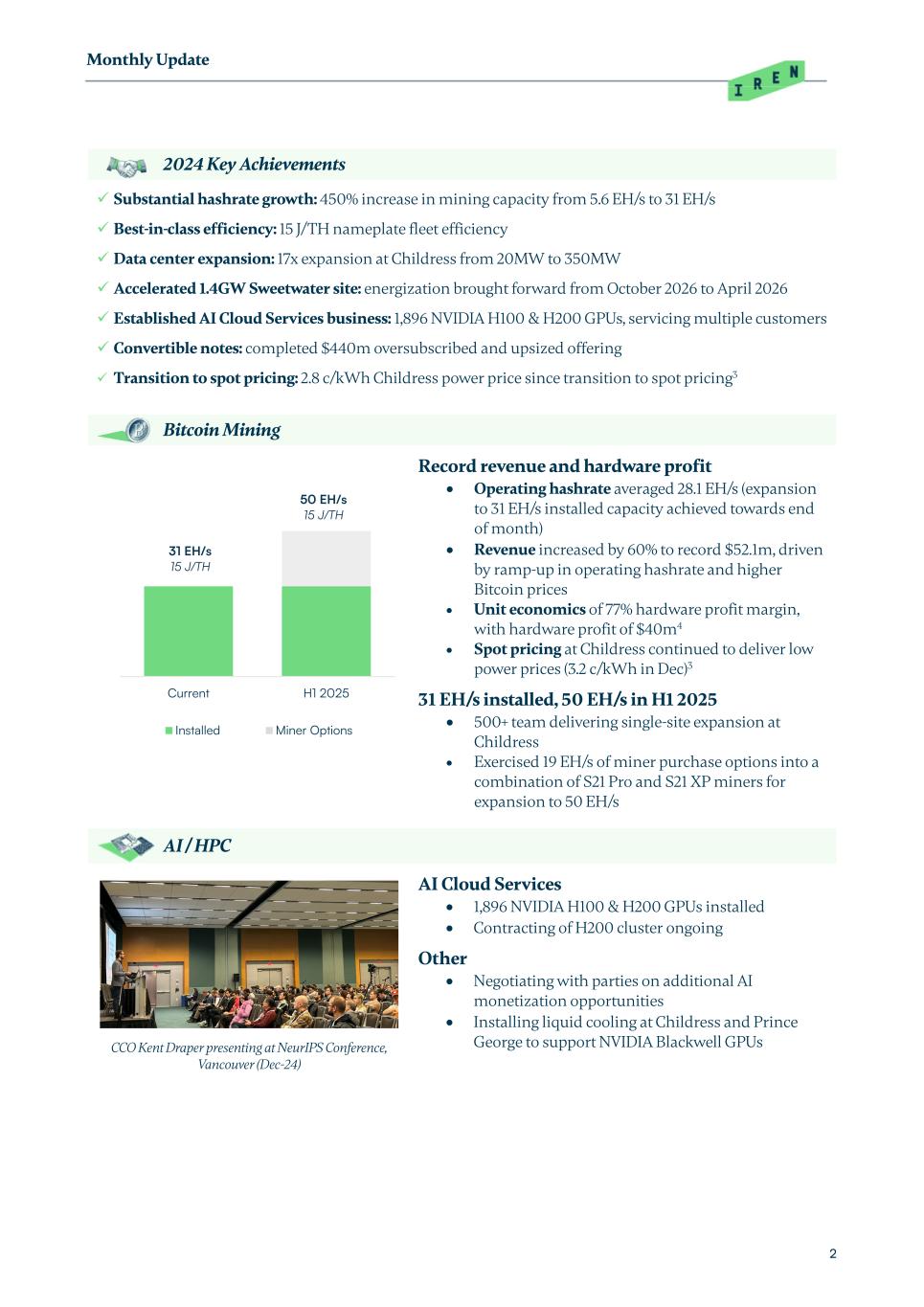 Monthly Update 2 2024 Key Achievements  Substantial hashrate growth: 450% increase in mining capacity from 5.6 EH/s to 31 EH/s  Best-in-class efficiency: 15 J/TH nameplate fleet efficiency  Data center expansion: 17x expansion at Childress from 20MW to 350MW  Accelerated 1.4GW Sweetwater site: energization brought forward from October 2026 to April 2026  Established AI Cloud Services business: 1,896 NVIDIA H100 & H200 GPUs, servicing multiple customers  Convertible notes: completed $440m oversubscribed and upsized offering  Transition to spot pricing: 2.8 c/kWh Childress power price since transition to spot pricing3 Bitcoin Mining Record revenue and hardware profit  Operating hashrate averaged 28.1 EH/s (expansion to 31 EH/s installed capacity achieved towards end of month)  Revenue increased by 60% to record $52.1m, driven by ramp-up in operating hashrate and higher Bitcoin prices  Unit economics of 77% hardware profit margin, with hardware profit of $40m4  Spot pricing at Childress continued to deliver low power prices (3.2 c/kWh in Dec)3 31 EH/s installed, 50 EH/s in H1 2025  500+ team delivering single-site expansion at Childress  Exercised 19 EH/s of miner purchase options into a combination of S21 Pro and S21 XP miners for expansion to 50 EH/s AI / HPC CCO Kent Draper presenting at NeurIPS Conference, Vancouver (Dec-24) AI Cloud Services  1,896 NVIDIA H100 & H200 GPUs installed  Contracting of H200 cluster ongoing Other  Negotiating with parties on additional AI monetization opportunities  Installing liquid cooling at Childress and Prince George to support NVIDIA Blackwell GPUs Current H1 2025 Installed Miner Options 31 EH/s 15 J/TH 50 EH/s 15 J/TH