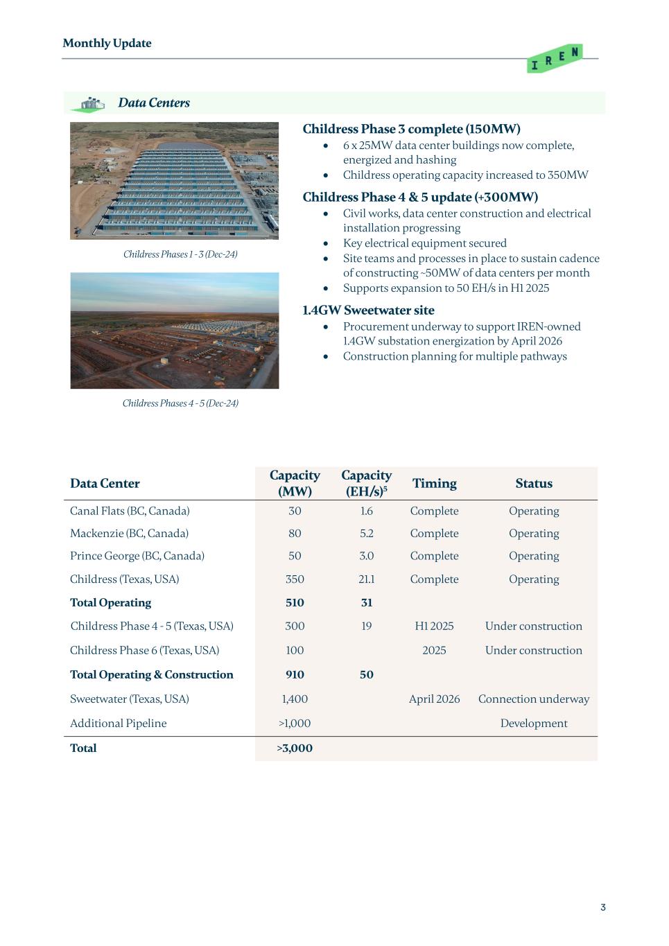 Monthly Update 3 Data Center Capacity (MW) Capacity (EH/s)5 Timing Status Canal Flats (BC, Canada) 30 1.6 Complete Operating Mackenzie (BC, Canada) 80 5.2 Complete Operating Prince George (BC, Canada) 50 3.0 Complete Operating Childress (Texas, USA) 350 21.1 Complete Operating Total Operating 510 31 Childress Phase 4 - 5 (Texas, USA) 300 19 H1 2025 Under construction Childress Phase 6 (Texas, USA) 100 2025 Under construction Total Operating & Construction 910 50 Sweetwater (Texas, USA) 1,400 April 2026 Connection underway Additional Pipeline >1,000 Development Total >3,000 Data Centers Childress Phases 1 - 3 (Dec-24) Childress Phases 4 - 5 (Dec-24) Childress Phase 3 complete (150MW)  6 x 25MW data center buildings now complete, energized and hashing  Childress operating capacity increased to 350MW Childress Phase 4 & 5 update (+300MW)  Civil works, data center construction and electrical installation progressing  Key electrical equipment secured  Site teams and processes in place to sustain cadence of constructing ~50MW of data centers per month  Supports expansion to 50 EH/s in H1 2025 1.4GW Sweetwater site  Procurement underway to support IREN-owned 1.4GW substation energization by April 2026  Construction planning for multiple pathways