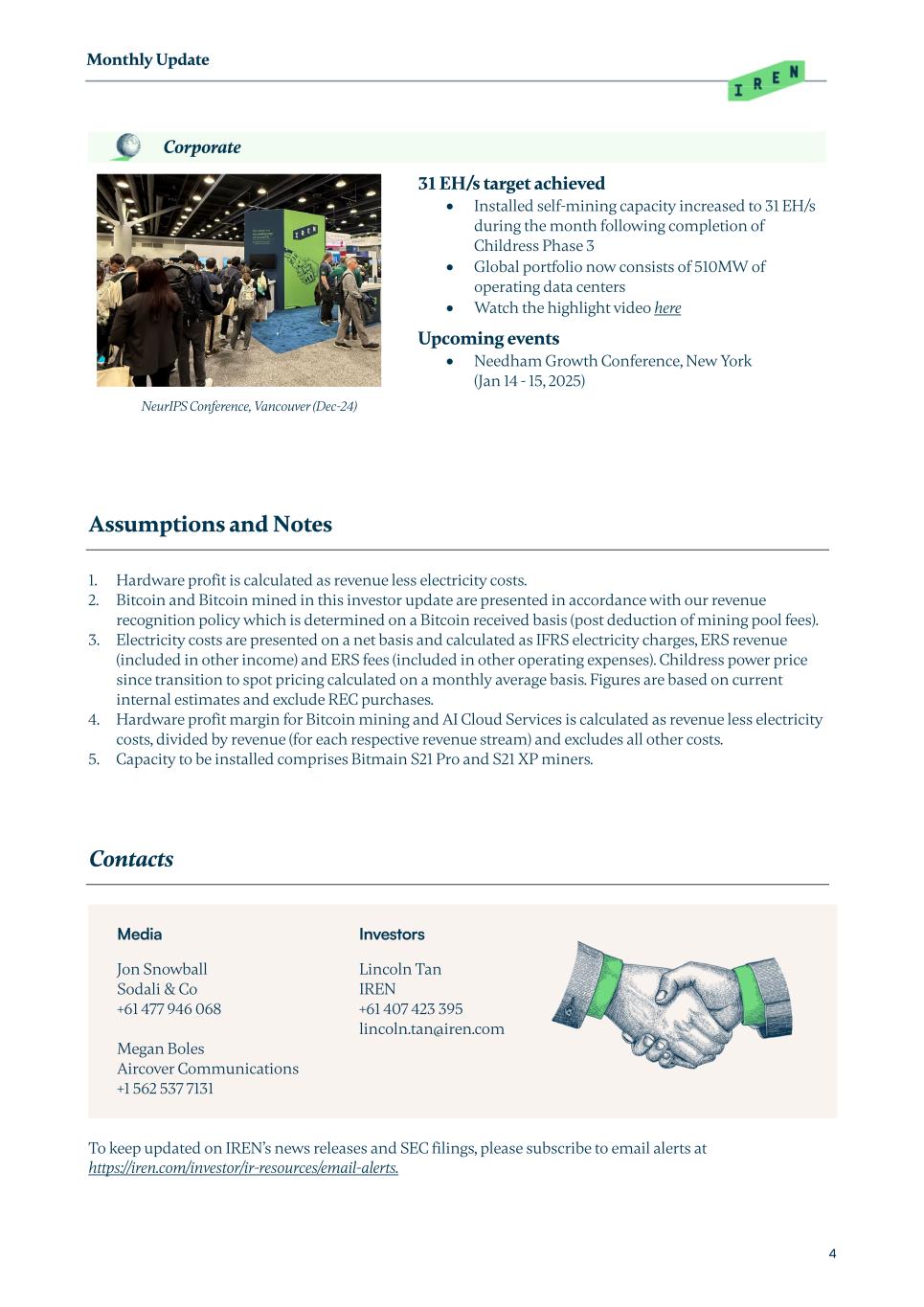 Monthly Update 4 Corporate NeurIPS Conference, Vancouver (Dec-24) 31 EH/s target achieved  Installed self-mining capacity increased to 31 EH/s during the month following completion of Childress Phase 3  Global portfolio now consists of 510MW of operating data centers  Watch the highlight video here Upcoming events  Needham Growth Conference, New York (Jan 14 - 15, 2025) Assumptions and Notes 1. Hardware profit is calculated as revenue less electricity costs. 2. Bitcoin and Bitcoin mined in this investor update are presented in accordance with our revenue recognition policy which is determined on a Bitcoin received basis (post deduction of mining pool fees). 3. Electricity costs are presented on a net basis and calculated as IFRS electricity charges, ERS revenue (included in other income) and ERS fees (included in other operating expenses). Childress power price since transition to spot pricing calculated on a monthly average basis. Figures are based on current internal estimates and exclude REC purchases. 4. Hardware profit margin for Bitcoin mining and AI Cloud Services is calculated as revenue less electricity costs, divided by revenue (for each respective revenue stream) and excludes all other costs. 5. Capacity to be installed comprises Bitmain S21 Pro and S21 XP miners. Contacts Media Jon Snowball Sodali & Co +61 477 946 068 Megan Boles Aircover Communications +1 562 537 7131 Investors Lincoln Tan IREN +61 407 423 395 lincoln.tan@iren.com To keep updated on IREN’s news releases and SEC filings, please subscribe to email alerts at https://iren.com/investor/ir-resources/email-alerts.