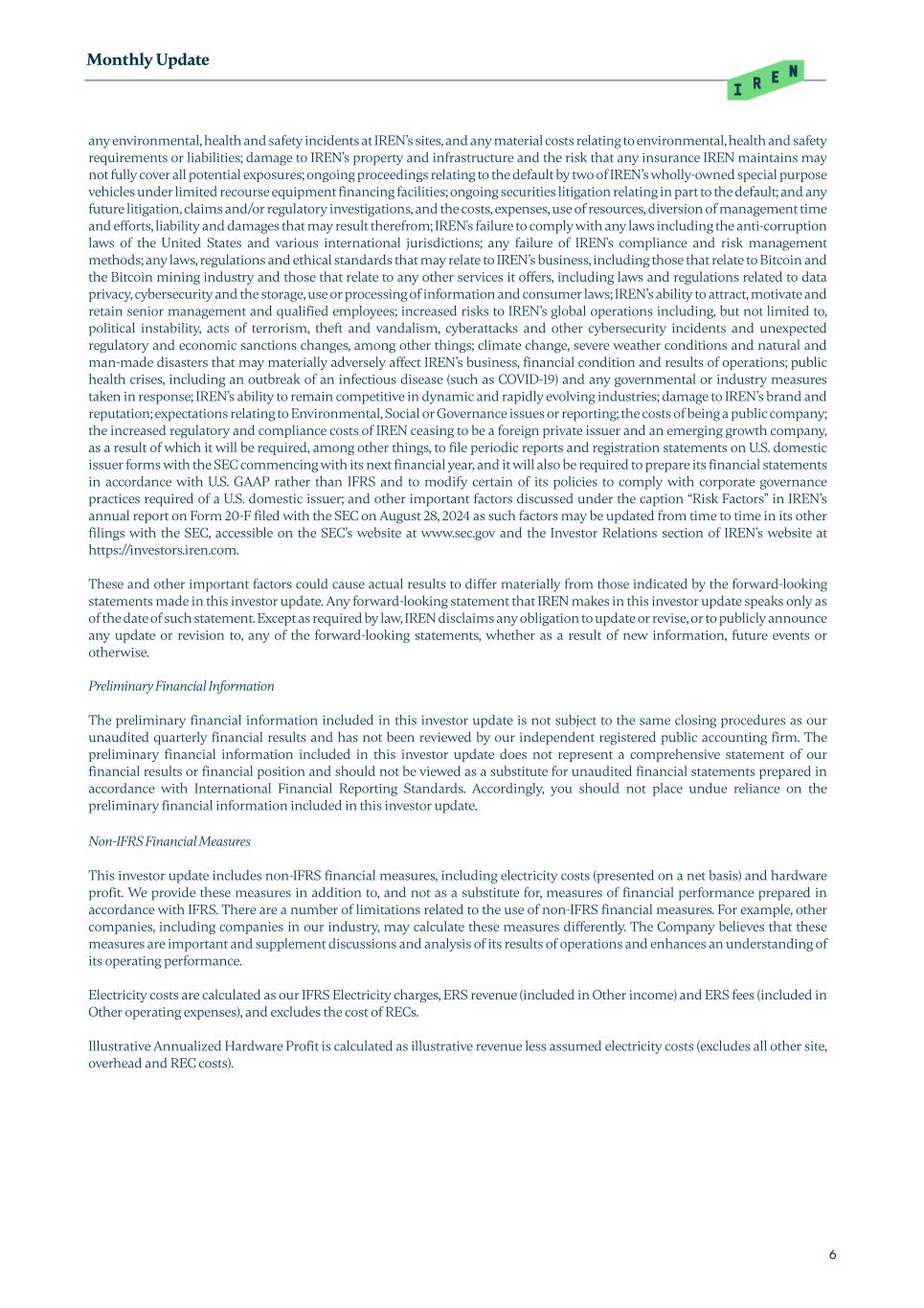 Monthly Update 6 any environmental, health and safety incidents at IREN’s sites, and any material costs relating to environmental, health and safety requirements or liabilities; damage to IREN’s property and infrastructure and the risk that any insurance IREN maintains may not fully cover all potential exposures; ongoing proceedings relating to the default by two of IREN’s wholly-owned special purpose vehicles under limited recourse equipment financing facilities; ongoing securities litigation relating in part to the default; and any future litigation, claims and/or regulatory investigations, and the costs, expenses, use of resources, diversion of management time and efforts, liability and damages that may result therefrom; IREN's failure to comply with any laws including the anti-corruption laws of the United States and various international jurisdictions; any failure of IREN's compliance and risk management methods; any laws, regulations and ethical standards that may relate to IREN’s business, including those that relate to Bitcoin and the Bitcoin mining industry and those that relate to any other services it offers, including laws and regulations related to data privacy, cybersecurity and the storage, use or processing of information and consumer laws; IREN’s ability to attract, motivate and retain senior management and qualified employees; increased risks to IREN’s global operations including, but not limited to, political instability, acts of terrorism, theft and vandalism, cyberattacks and other cybersecurity incidents and unexpected regulatory and economic sanctions changes, among other things; climate change, severe weather conditions and natural and man-made disasters that may materially adversely affect IREN’s business, financial condition and results of operations; public health crises, including an outbreak of an infectious disease (such as COVID-19) and any governmental or industry measures taken in response; IREN’s ability to remain competitive in dynamic and rapidly evolving industries; damage to IREN’s brand and reputation; expectations relating to Environmental, Social or Governance issues or reporting; the costs of being a public company; the increased regulatory and compliance costs of IREN ceasing to be a foreign private issuer and an emerging growth company, as a result of which it will be required, among other things, to file periodic reports and registration statements on U.S. domestic issuer forms with the SEC commencing with its next financial year, and it will also be required to prepare its financial statements in accordance with U.S. GAAP rather than IFRS and to modify certain of its policies to comply with corporate governance practices required of a U.S. domestic issuer; and other important factors discussed under the caption “Risk Factors” in IREN’s annual report on Form 20-F filed with the SEC on August 28, 2024 as such factors may be updated from time to time in its other filings with the SEC, accessible on the SEC’s website at www.sec.gov and the Investor Relations section of IREN’s website at https://investors.iren.com. These and other important factors could cause actual results to differ materially from those indicated by the forward-looking statements made in this investor update. Any forward-looking statement that IREN makes in this investor update speaks only as of the date of such statement. Except as required by law, IREN disclaims any obligation to update or revise, or to publicly announce any update or revision to, any of the forward-looking statements, whether as a result of new information, future events or otherwise. Preliminary Financial Information The preliminary financial information included in this investor update is not subject to the same closing procedures as our unaudited quarterly financial results and has not been reviewed by our independent registered public accounting firm. The preliminary financial information included in this investor update does not represent a comprehensive statement of our financial results or financial position and should not be viewed as a substitute for unaudited financial statements prepared in accordance with International Financial Reporting Standards. Accordingly, you should not place undue reliance on the preliminary financial information included in this investor update. Non-IFRS Financial Measures This investor update includes non-IFRS financial measures, including electricity costs (presented on a net basis) and hardware profit. We provide these measures in addition to, and not as a substitute for, measures of financial performance prepared in accordance with IFRS. There are a number of limitations related to the use of non-IFRS financial measures. For example, other companies, including companies in our industry, may calculate these measures differently. The Company believes that these measures are important and supplement discussions and analysis of its results of operations and enhances an understanding of its operating performance. Electricity costs are calculated as our IFRS Electricity charges, ERS revenue (included in Other income) and ERS fees (included in Other operating expenses), and excludes the cost of RECs. Illustrative Annualized Hardware Profit is calculated as illustrative revenue less assumed electricity costs (excludes all other site, overhead and REC costs).