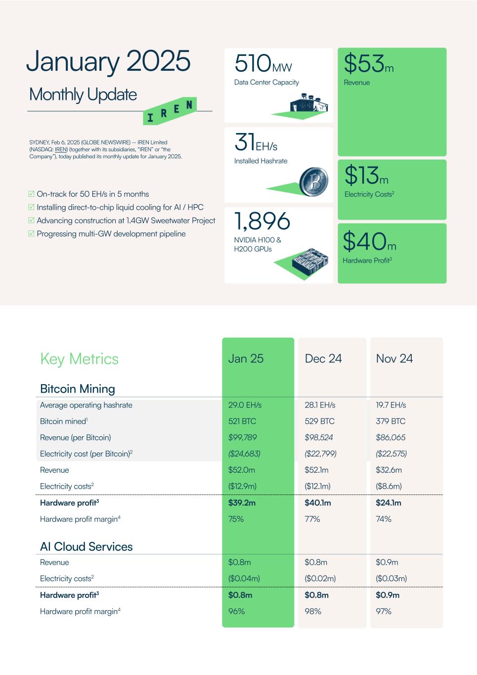 Key Metrics Jan 25 Dec 24 Nov 24 Bitcoin Mining Average operating hashrate 29.0 EH/s 28.1 EH/s 19.7 EH/s Bitcoin mined1 521 BTC 529 BTC 379 BTC Revenue (per Bitcoin) $99,789 $98,524 $86,065 Electricity cost (per Bitcoin)2 ($24,683) ($22,799) ($22,575) Revenue $52.0m $52.1m $32.6m Electricity costs2 ($12.9m) ($12.1m) ($8.6m) Hardware profit3 $39.2m $40.1m $24.1m Hardware profit margin4 75% 77% 74% AI Cloud Services Revenue $0.8m $0.8m $0.9m Electricity costs2 ($0.04m) ($0.02m) ($0.03m) Hardware profit3 $0.8m $0.8m $0.9m Hardware profit margin4 96% 98% 97%  On-track for 50 EH/s in 5 months  Installing direct-to-chip liquid cooling for AI / HPC  Advancing construction at 1.4GW Sweetwater Project  Progressing multi-GW development pipeline January 2025 Monthly Update 31EH/s Installed Hashrate $40m Hardware Profit3 510MW Data Center Capacity $53m Revenue 1,896 NVIDIA H100 & H200 GPUs $13m Electricity Costs2 SYDNEY, Feb 6, 2025 (GLOBE NEWSWIRE) -- IREN Limited (NASDAQ: IREN) (together with its subsidiaries, “IREN” or “the Company”), today published its monthly update for January 2025.