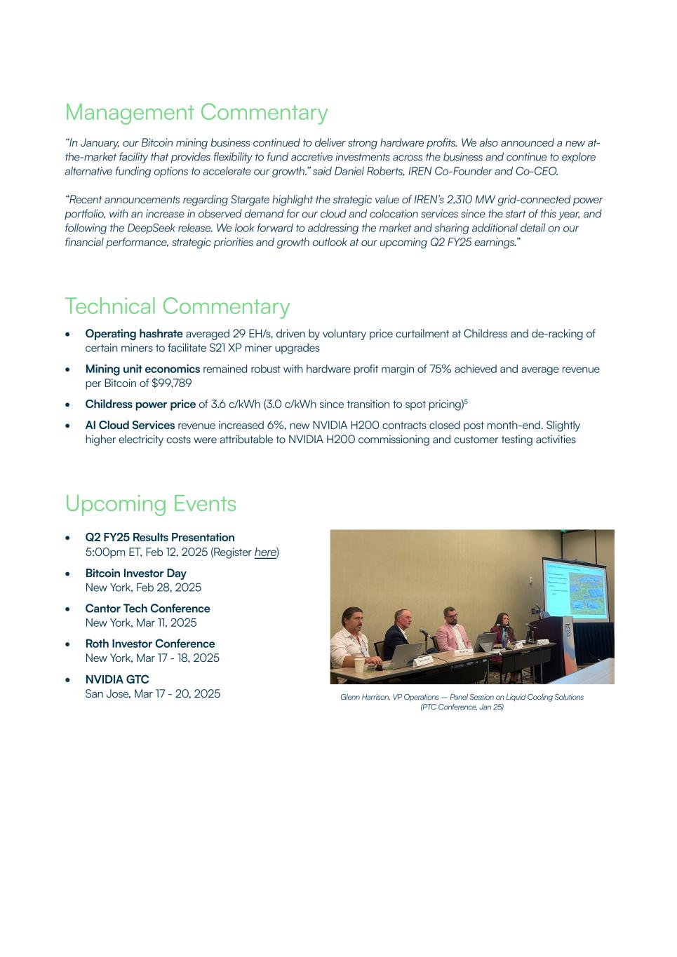 Management Commentary “In January, our Bitcoin mining business continued to deliver strong hardware profits. We also announced a new at- the-market facility that provides flexibility to fund accretive investments across the business and continue to explore alternative funding options to accelerate our growth.” said Daniel Roberts, IREN Co-Founder and Co-CEO. “Recent announcements regarding Stargate highlight the strategic value of IREN’s 2,310 MW grid-connected power portfolio, with an increase in observed demand for our cloud and colocation services since the start of this year, and following the DeepSeek release. We look forward to addressing the market and sharing additional detail on our financial performance, strategic priorities and growth outlook at our upcoming Q2 FY25 earnings.” Technical Commentary • Operating hashrate averaged 29 EH/s, driven by voluntary price curtailment at Childress and de-racking of certain miners to facilitate S21 XP miner upgrades • Mining unit economics remained robust with hardware profit margin of 75% achieved and average revenue per Bitcoin of $99,789 • Childress power price of 3.6 c/kWh (3.0 c/kWh since transition to spot pricing)5 • AI Cloud Services revenue increased 6%, new NVIDIA H200 contracts closed post month-end. Slightly higher electricity costs were attributable to NVIDIA H200 commissioning and customer testing activities Upcoming Events • Q2 FY25 Results Presentation 5:00pm ET, Feb 12, 2025 (Register here) • Bitcoin Investor Day New York, Feb 28, 2025 • Cantor Tech Conference New York, Mar 11, 2025 • Roth Investor Conference New York, Mar 17 - 18, 2025 • NVIDIA GTC San Jose, Mar 17 - 20, 2025 Glenn Harrison, VP Operations – Panel Session on Liquid Cooling Solutions (PTC Conference, Jan 25)