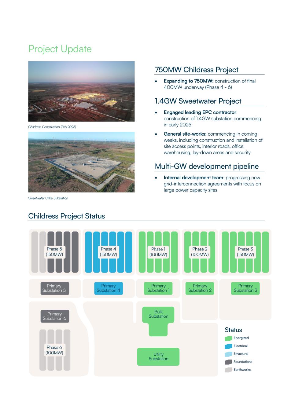 Project Update Childress Construction (Feb 2025) Sweetwater Utility Substation 750MW Childress Project • Expanding to 750MW: construction of final 400MW underway (Phase 4 - 6) 1.4GW Sweetwater Project • Engaged leading EPC contractor: construction of 1.4GW substation commencing in early 2025 • General site-works: commencing in coming weeks, including construction and installation of site access points, interior roads, office, warehousing, lay-down areas and security Multi-GW development pipeline • Internal development team: progressing new grid-interconnection agreements with focus on large power capacity sites Childress Project Status Phase 5 (150MW) Phase 4 (150MW) Phase 1 (100MW) Phase 2 (100MW) Phase 3 (150MW) Primary Substation 4 Primary Substation 1 Primary Substation 2 Primary Substation 3 Primary Substation 6 Bulk Substation Utility Substation Primary Substation 5 Phase 6 (100MW) Status