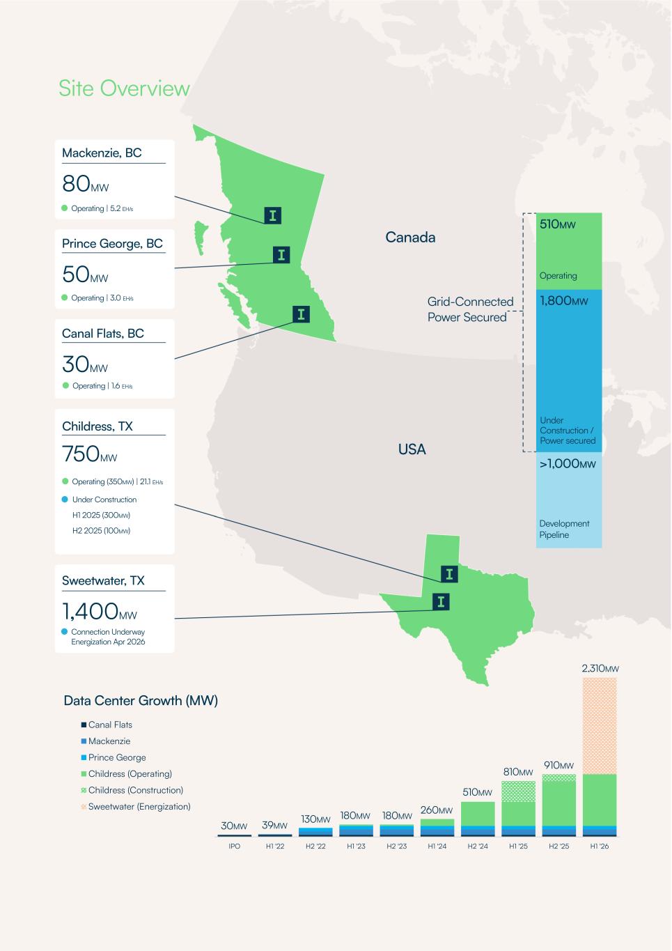 IPO H1 '22 H2 '22 H1 '23 H2 '23 H1 '24 H2 '24 H1 '25 H2 '25 H1 '26 Canal Flats Mackenzie Prince George Childress (Operating) Childress (Construction) Sweetwater (Energization) 910MW 810MW 510MW 260MW 180MW 180MW 130MW 39MW 30MW Data Center Growth (MW) Sweetwater, TX 1,400MW Operating (350MW) | 21.1 EH/s Under Construction H1 2025 (300MW) H2 2025 (100MW) Grid-Connected Power Secured 510MW Operating 1,800MW Under Construction / Power secured >1,000MW Development Pipeline Mackenzie, BC 80MW Prince George, BC 50MW Canal Flats, BC 30MW Childress, TX 750MW Site Overview Operating | 5.2 EH/s Operating | 3.0 EH/s Operating | 1.6 EH/s Canada USA 2,310MW Connection Underway Energization Apr 2026