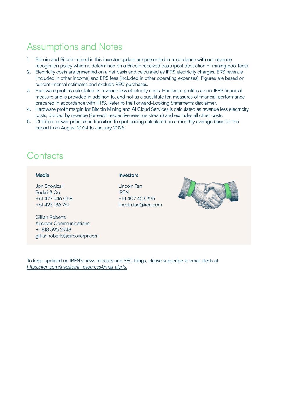 Assumptions and Notes 1. Bitcoin and Bitcoin mined in this investor update are presented in accordance with our revenue recognition policy which is determined on a Bitcoin received basis (post deduction of mining pool fees). 2. Electricity costs are presented on a net basis and calculated as IFRS electricity charges, ERS revenue (included in other income) and ERS fees (included in other operating expenses). Figures are based on current internal estimates and exclude REC purchases. 3. Hardware profit is calculated as revenue less electricity costs. Hardware profit is a non-IFRS financial measure and is provided in addition to, and not as a substitute for, measures of financial performance prepared in accordance with IFRS. Refer to the Forward-Looking Statements disclaimer. 4. Hardware profit margin for Bitcoin Mining and AI Cloud Services is calculated as revenue less electricity costs, divided by revenue (for each respective revenue stream) and excludes all other costs. 5. Childress power price since transition to spot pricing calculated on a monthly average basis for the period from August 2024 to January 2025. Contacts To keep updated on IREN’s news releases and SEC filings, please subscribe to email alerts at https://iren.com/investor/ir-resources/email-alerts. Media Jon Snowball Sodali & Co +61 477 946 068 +61 423 136 761 Gillian Roberts Aircover Communications +1 818 395 2948 gillian.roberts@aircoverpr.com Investors Lincoln Tan IREN +61 407 423 395 lincoln.tan@iren.com
