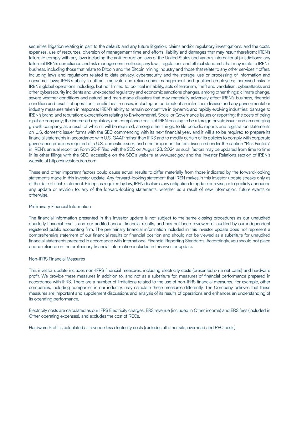 securities litigation relating in part to the default; and any future litigation, claims and/or regulatory investigations, and the costs, expenses, use of resources, diversion of management time and efforts, liability and damages that may result therefrom; IREN's failure to comply with any laws including the anti-corruption laws of the United States and various international jurisdictions; any failure of IREN's compliance and risk management methods; any laws, regulations and ethical standards that may relate to IREN’s business, including those that relate to Bitcoin and the Bitcoin mining industry and those that relate to any other services it offers, including laws and regulations related to data privacy, cybersecurity and the storage, use or processing of information and consumer laws; IREN’s ability to attract, motivate and retain senior management and qualified employees; increased risks to IREN’s global operations including, but not limited to, political instability, acts of terrorism, theft and vandalism, cyberattacks and other cybersecurity incidents and unexpected regulatory and economic sanctions changes, among other things; climate change, severe weather conditions and natural and man-made disasters that may materially adversely affect IREN’s business, financial condition and results of operations; public health crises, including an outbreak of an infectious disease and any governmental or industry measures taken in response; IREN’s ability to remain competitive in dynamic and rapidly evolving industries; damage to IREN’s brand and reputation; expectations relating to Environmental, Social or Governance issues or reporting; the costs of being a public company; the increased regulatory and compliance costs of IREN ceasing to be a foreign private issuer and an emerging growth company, as a result of which it will be required, among other things, to file periodic reports and registration statements on U.S. domestic issuer forms with the SEC commencing with its next financial year, and it will also be required to prepare its financial statements in accordance with U.S. GAAP rather than IFRS and to modify certain of its policies to comply with corporate governance practices required of a U.S. domestic issuer; and other important factors discussed under the caption “Risk Factors” in IREN’s annual report on Form 20-F filed with the SEC on August 28, 2024 as such factors may be updated from time to time in its other filings with the SEC, accessible on the SEC’s website at www.sec.gov and the Investor Relations section of IREN’s website at https://investors.iren.com. These and other important factors could cause actual results to differ materially from those indicated by the forward-looking statements made in this investor update. Any forward-looking statement that IREN makes in this investor update speaks only as of the date of such statement. Except as required by law, IREN disclaims any obligation to update or revise, or to publicly announce any update or revision to, any of the forward-looking statements, whether as a result of new information, future events or otherwise. Preliminary Financial Information The financial information presented in this investor update is not subject to the same closing procedures as our unaudited quarterly financial results and our audited annual financial results, and has not been reviewed or audited by our independent registered public accounting firm. The preliminary financial information included in this investor update does not represent a comprehensive statement of our financial results or financial position and should not be viewed as a substitute for unaudited financial statements prepared in accordance with International Financial Reporting Standards. Accordingly, you should not place undue reliance on the preliminary financial information included in this investor update. Non-IFRS Financial Measures This investor update includes non-IFRS financial measures, including electricity costs (presented on a net basis) and hardware profit. We provide these measures in addition to, and not as a substitute for, measures of financial performance prepared in accordance with IFRS. There are a number of limitations related to the use of non-IFRS financial measures. For example, other companies, including companies in our industry, may calculate these measures differently. The Company believes that these measures are important and supplement discussions and analysis of its results of operations and enhances an understanding of its operating performance. Electricity costs are calculated as our IFRS Electricity charges, ERS revenue (included in Other income) and ERS fees (included in Other operating expenses), and excludes the cost of RECs. Hardware Profit is calculated as revenue less electricity costs (excludes all other site, overhead and REC costs).