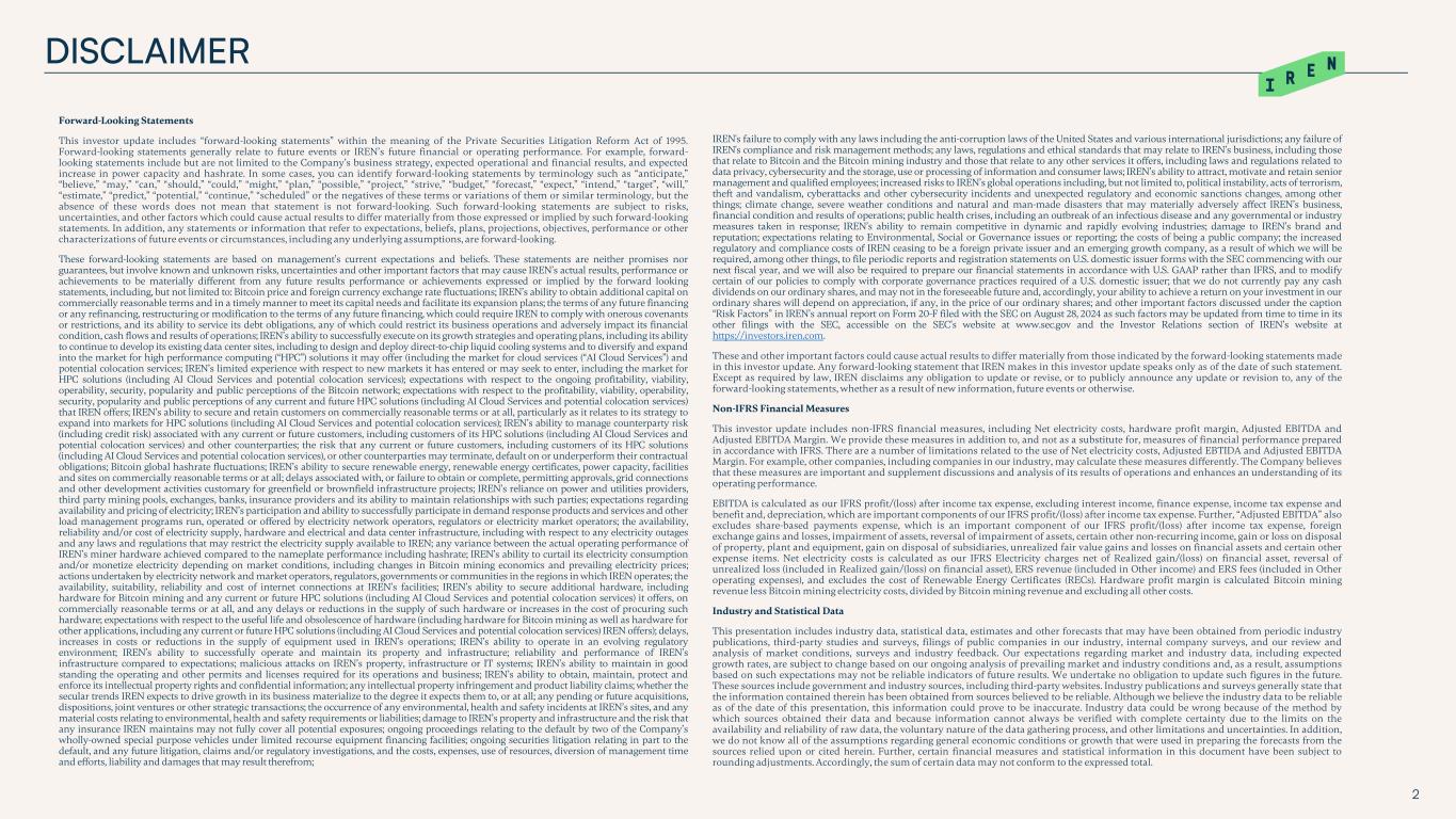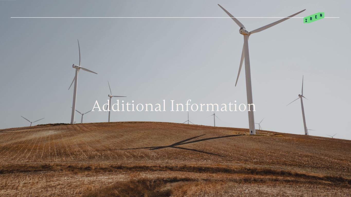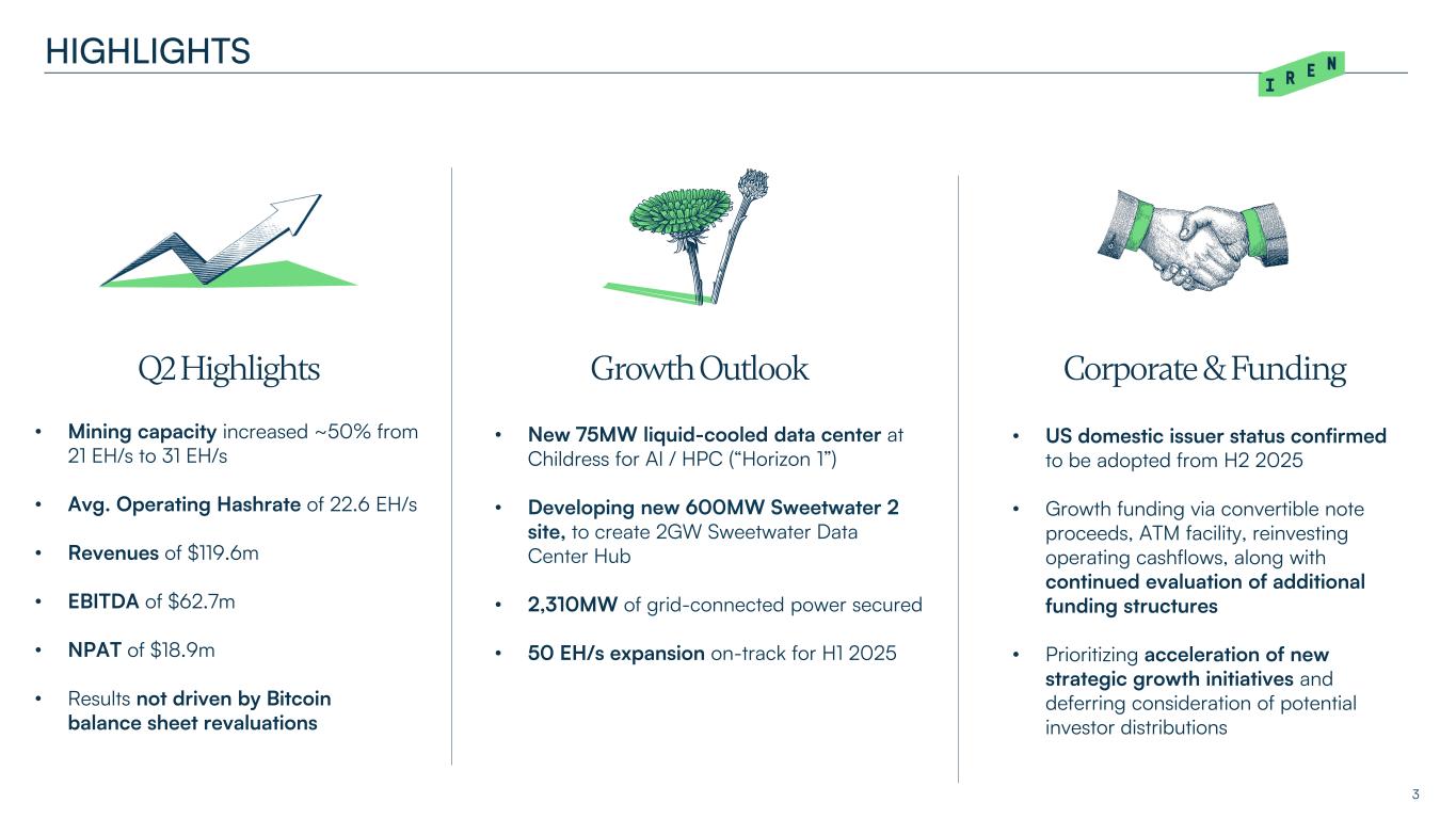 2 DISCLAIMER Forwa rd-Looking Sta tements This investor update includes “forward-looking statements” within the meaning of the Private Securities Litigation Reform Act of 1995. Forward-looking statements generally relate to future events or IREN’s future financial or operating performance. For example, forward- looking statements include but are not limited to the Company’s business strategy, expected operational and financial results, and expected increase in power capacity and hashrate. In some cases, you can identify forward-looking statements by terminology such as “anticipate,” “believe,” “may,” “can,” “should,” “could,” “might,” “plan,” “possible,” “project,” “strive,” “budget,” “forecast,” “expect,” “intend,” “target”, “will,” “estimate,” “predict,” “potential,” “continue,” “scheduled” or the negatives of these terms or variations of them or similar terminology, but the absence of these words does not mean that statement is not forward-looking. Such forward-looking statements are subject to risks, uncertainties, and other factors which could cause actual results to differ materially from those expressed or implied by such forward-looking statements. In addition, any statements or information that refer to expectations, beliefs, plans, projections, objectives, performance or other characterizations of future events or circumstances, including any underlying assumptions, are forward-looking. These forward-looking statements are based on management’s current expectations and beliefs. These statements are neither promises nor guarantees, but involve known and unknown risks, uncertainties and other important factors that may cause IREN’s actual results, performance or achievements to be materially different from any future results performance or achievements expressed or implied by the forward looking statements, including, but not limited to: Bitcoin price and foreign currency exchange rate fluctuations; IREN’s ability to obtain additional capital on commercially reasonable terms and in a timely manner to meet its capital needs and facilitate its expansion plans; the terms of any future financing or any refinancing, restructuring or modification to the terms of any future financing, which could require IREN to comply with onerous covenants or restrictions, and its ability to service its debt obligations, any of which could restrict its business operations and adversely impact its financial condition, cash flows and results of operations; IREN’s ability to successfully execute on its growth strategies and operating plans, including its ability to continue to develop its existing data center sites, including to design and deploy direct-to-chip liquid cooling systems and to diversify and expand into the market for high performance computing (“HPC”) solutions it may offer (including the market for cloud services (“AI Cloud Services”) and potential colocation services; IREN’s limited experience with respect to new markets it has entered or may seek to enter, including the market for HPC solutions (including AI Cloud Services and potential colocation services); expectations with respect to the ongoing profitability, viability, operability, security, popularity and public perceptions of the Bitcoin network; expectations with respect to the profitability, viability, operability, security, popularity and public perceptions of any current and future HPC solutions (including AI Cloud Services and potential colocation services) that IREN offers; IREN’s ability to secure and retain customers on commercially reasonable terms or at all, particularly as it relates to its strategy to expand into markets for HPC solutions (including AI Cloud Services and potential colocation services); IREN’s ability to manage counterparty risk (including credit risk) associated with any current or future customers, including customers of its HPC solutions (including AI Cloud Services and potential colocation services) and other counterparties; the risk that any current or future customers, including customers of its HPC solutions (including AI Cloud Services and potential colocation services), or other counterparties may terminate, default on or underperform their contractual obligations; Bitcoin global hashrate fluctuations; IREN’s ability to secure renewable energy, renewable energy certificates, power capacity, facilities and sites on commercially reasonable terms or at all; delays associated with, or failure to obtain or complete, permitting approvals, grid connections and other development activities customary for greenfield or brownfield infrastructure projects; IREN’s reliance on power and utilities providers, third party mining pools, exchanges, banks, insurance providers and its ability to maintain relationships with such parties; expectations regarding availability and pricing of electricity; IREN’s participation and ability to successfully participate in demand response products and services and other load management programs run, operated or offered by electricity network operators, regulators or electricity market operators; the availability, reliability and/or cost of electricity supply, hardware and electrical and data center infrastructure, including with respect to any electricity outages and any laws and regulations that may restrict the electricity supply available to IREN; any variance between the actual operating performance of IREN’s miner hardware achieved compared to the nameplate performance including hashrate; IREN’s ability to curtail its electricity consumption and/or monetize electricity depending on market conditions, including changes in Bitcoin mining economics and prevailing electricity prices; actions undertaken by electricity network and market operators, regulators, governments or communities in the regions in which IREN operates; the availability, suitabil