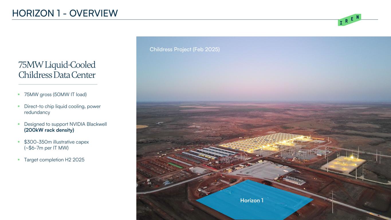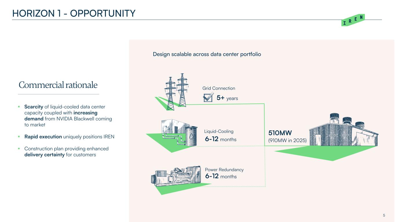 HORIZON 1 - OPPORTUNITY 5  Scarcity of liquid-cooled data center capacity coupled with increasing demand from NVIDIA Blackwell coming to market  Rapid execution uniquely positions IREN  Construction plan providing enhanced delivery certainty for customers Design scalable across data center portfolio Grid Connection Liquid-Cooling Power Redundancy 5+ years 6-12 months 510MW (910MW in 2025) 6-12 months Commercial rationale